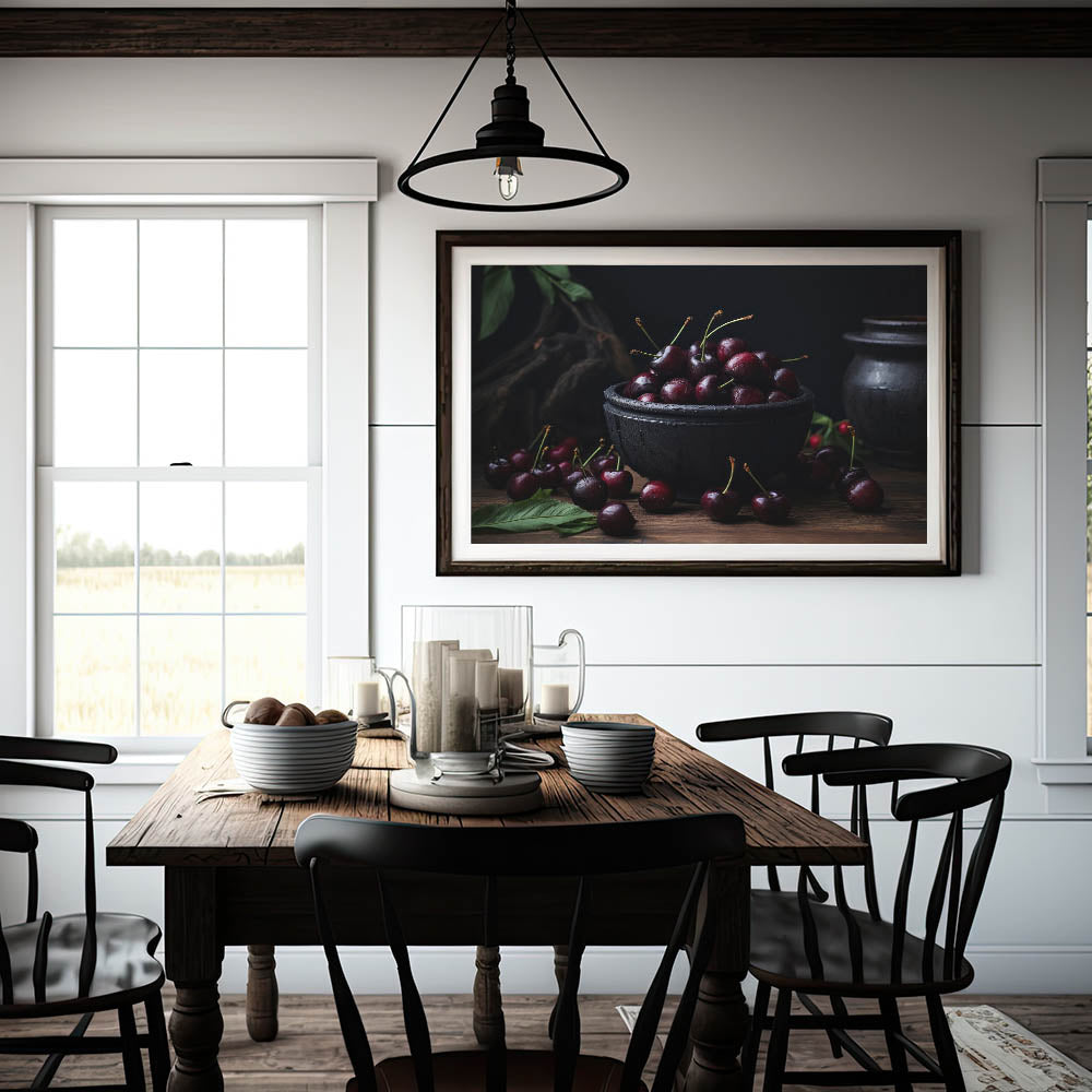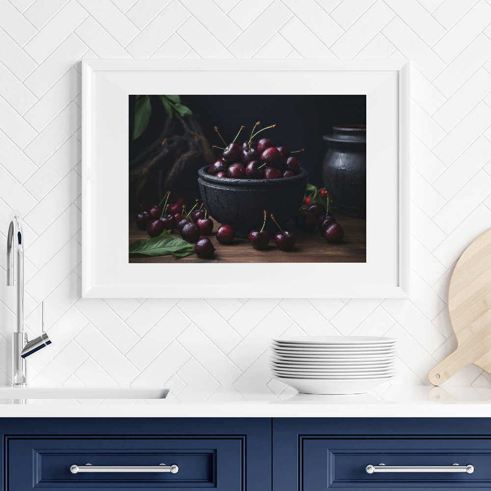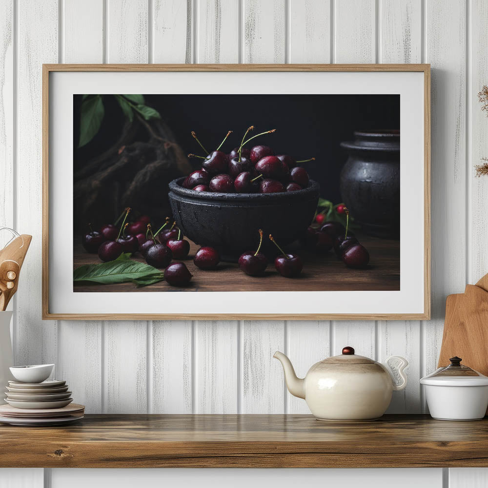 This fruit-themed wall art captures the rich beauty of cherries in a timeless and refined presentation. Whether for a rustic farmhouse look or a modern gourmet setting, this fruit still life art will make a bold statement.