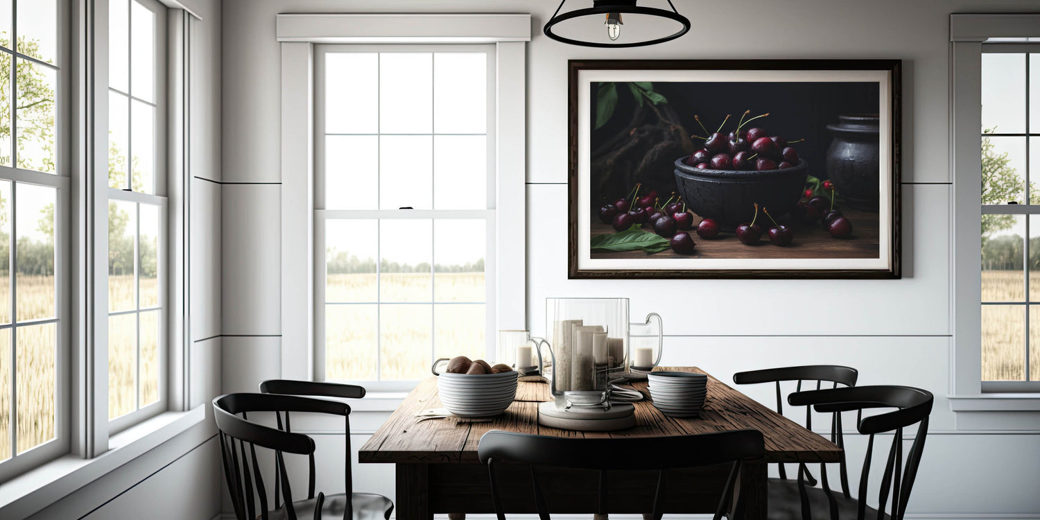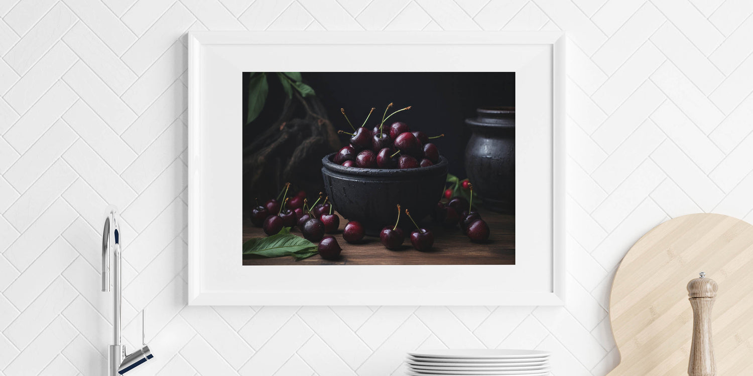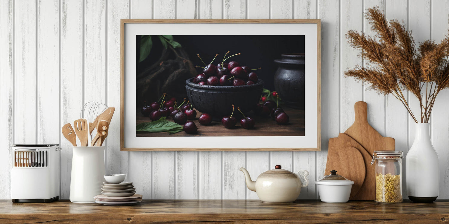 This fruit-themed wall art captures the rich beauty of cherries in a timeless and refined presentation. Whether for a rustic farmhouse look or a modern gourmet setting, this fruit still life art will make a bold statement.