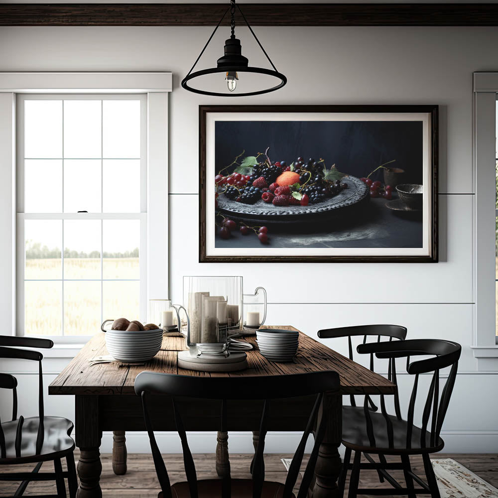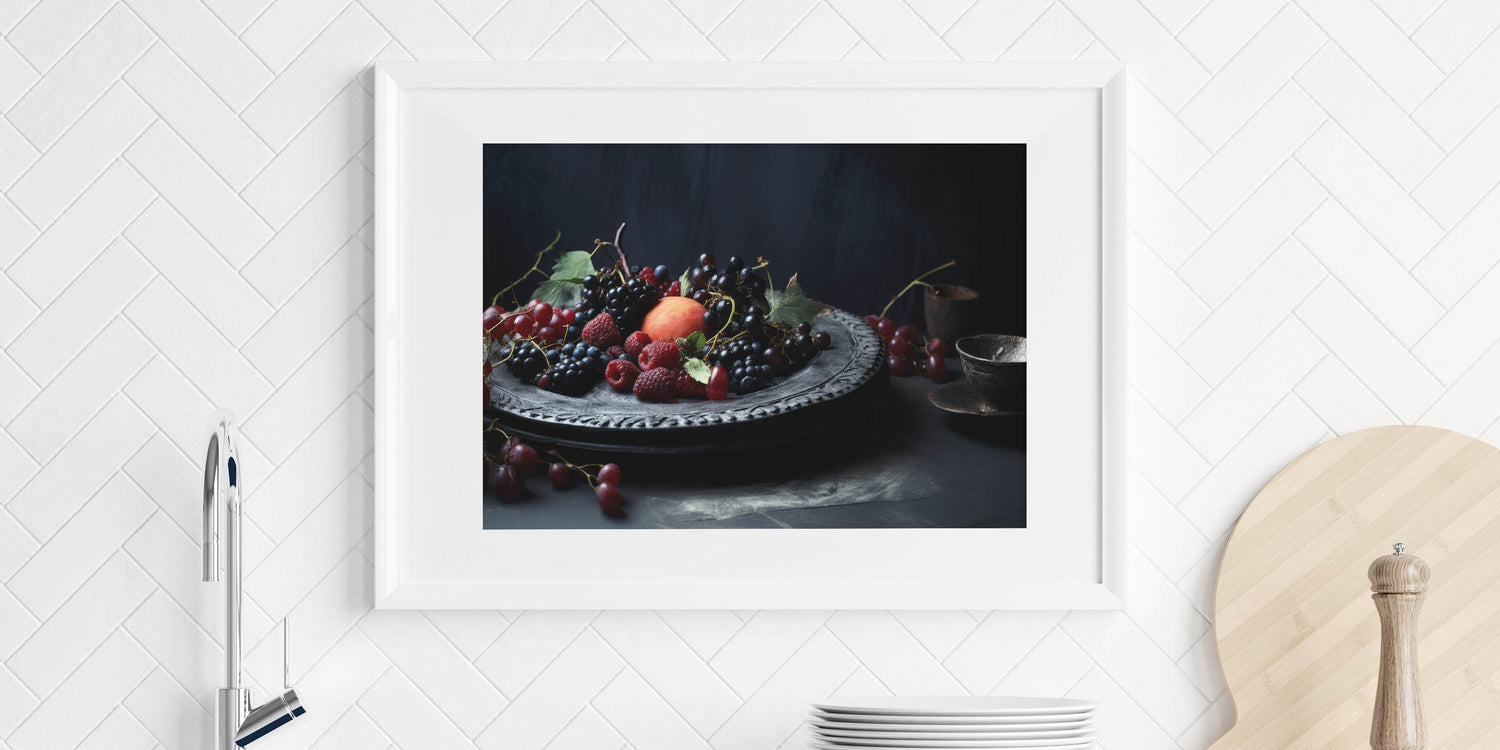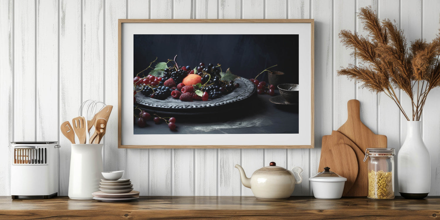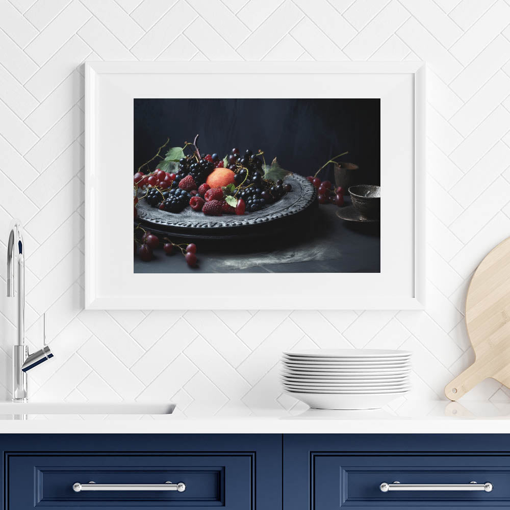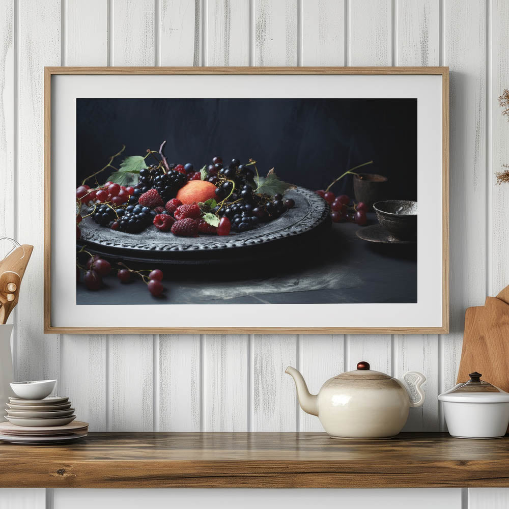 Indulge in the beauty of Dark Fruit Still Life Art, a captivating fruit canvas print featuring rich burgundy grapes, blackberries, raspberries, and a ripe peach delicately arranged on an ornate plate. The deep moody tones of dark blue, black, and red create a luxurious, classic aesthetic, making this artwork perfect for kitchen fruit decor, wine cellar art, or fine dining interiors.