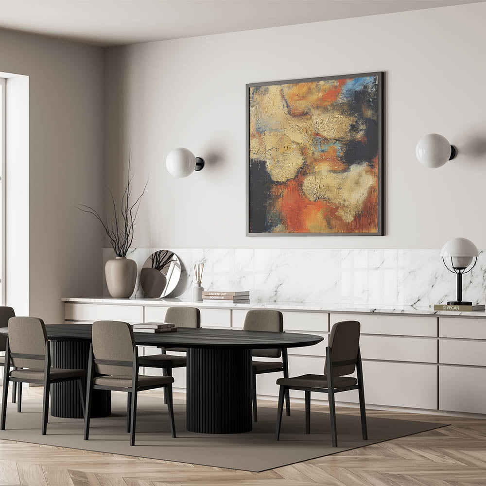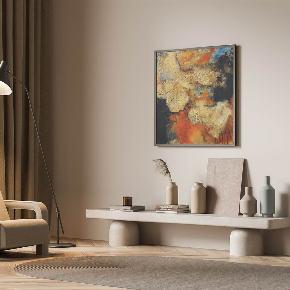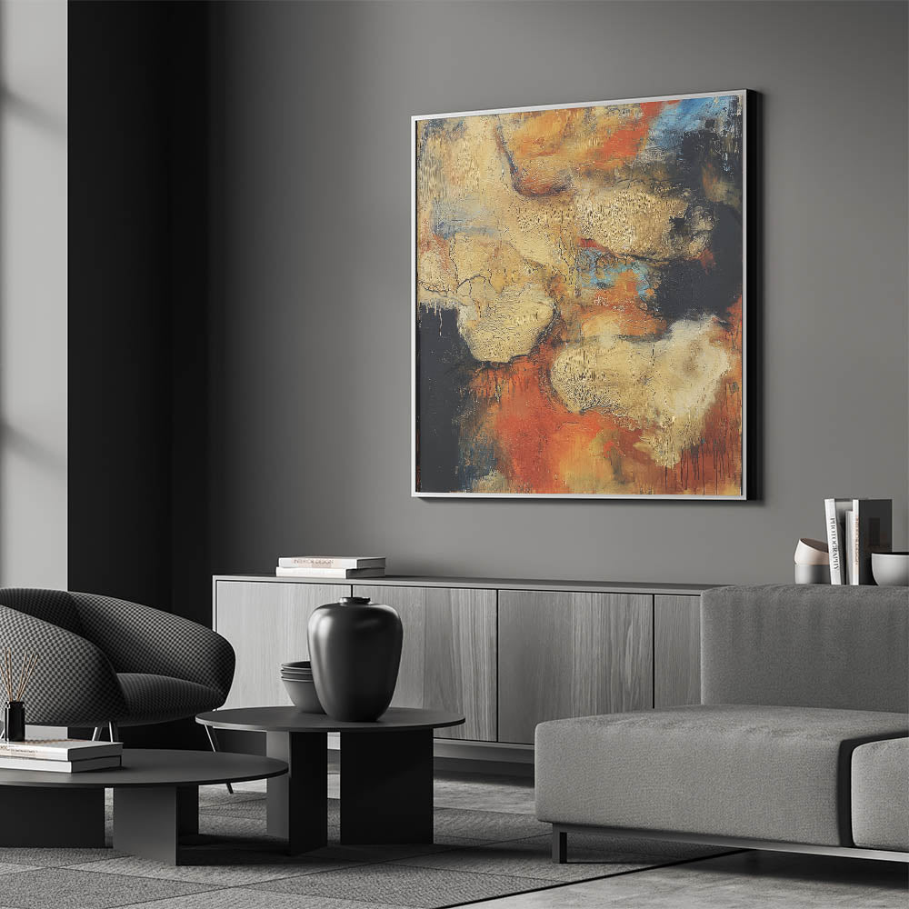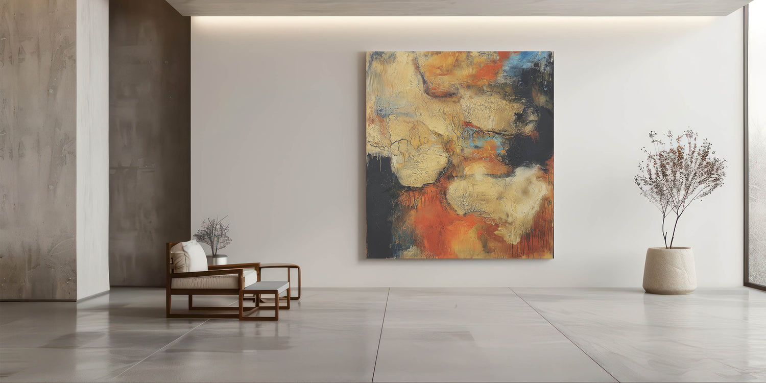 Ignite your interior with the raw vibrance of this Earthen Harmony Abstracts creation. This compelling abstract wall art features molten blends of ochre, beige, burnt orange, and sky blue layered with thick texture and bold movement. The composition radiates depth, emotion, and timeless modern abstract art appeal.