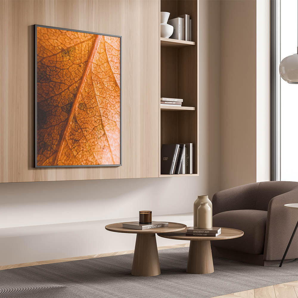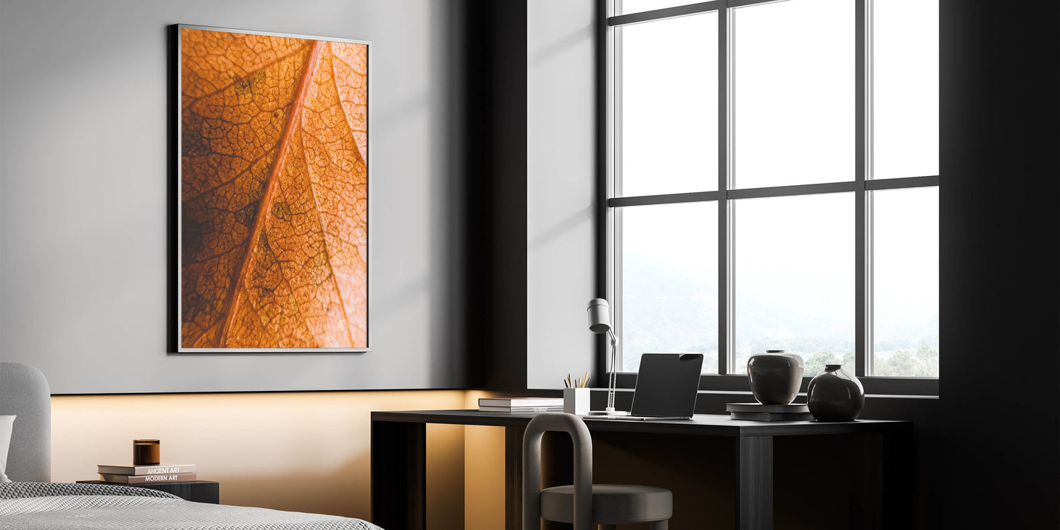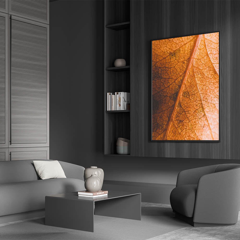 Celebrate the intricate beauty of fall with this fall art print, featuring a close-up view of a textured autumn leaf. The fine details of its veins and the rich orange and brown hues create a mesmerizing composition, making this autumn canvas art a perfect addition to nature-inspired decor. Whether you’re a fan of seasonal aesthetics or simply appreciate the delicate details of nature, this fall wall decor adds warmth and depth to any space.