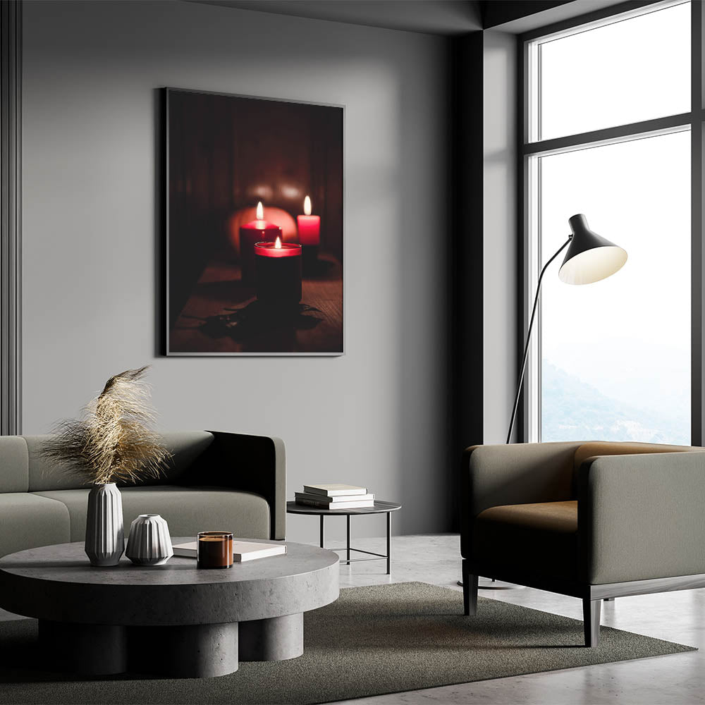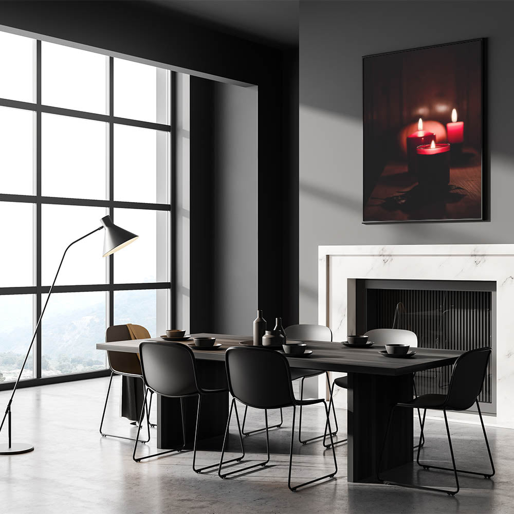 Set the mood with this fall art print, featuring the soft glow of red candles flickering against a dark, rustic backdrop. The deep burgundy tones and warm amber light create an intimate and cozy ambiance, making this autumn canvas art perfect for those who love vintage aesthetics or gothic-inspired decor. Whether used as a focal point for seasonal decor or as a timeless statement piece, this fall wall art adds a touch of mystery and warmth to any space.