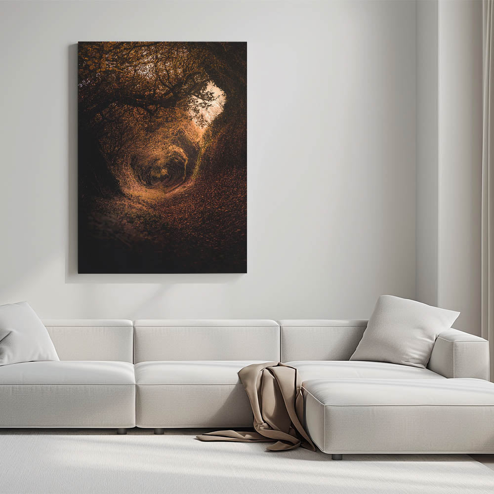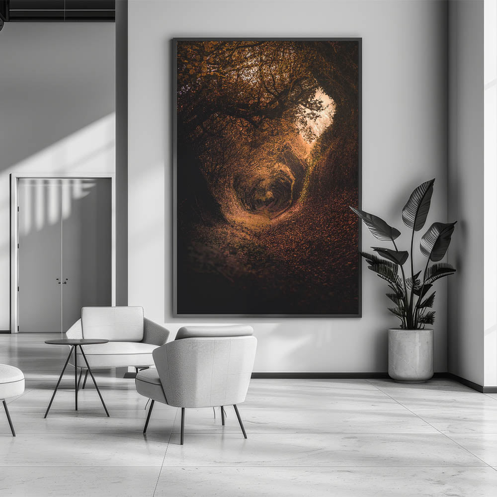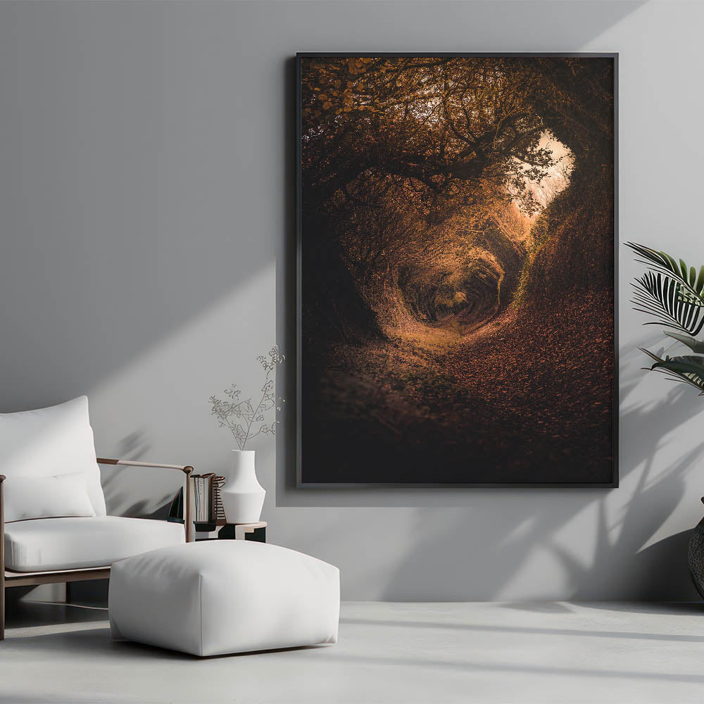 This fall art print evokes a sense of wonder, inviting viewers to imagine walking through this enchanted autumn passage. Whether used as seasonal decor or a permanent statement piece, this autumn wall decor transforms your space into a world of mystery and beauty.