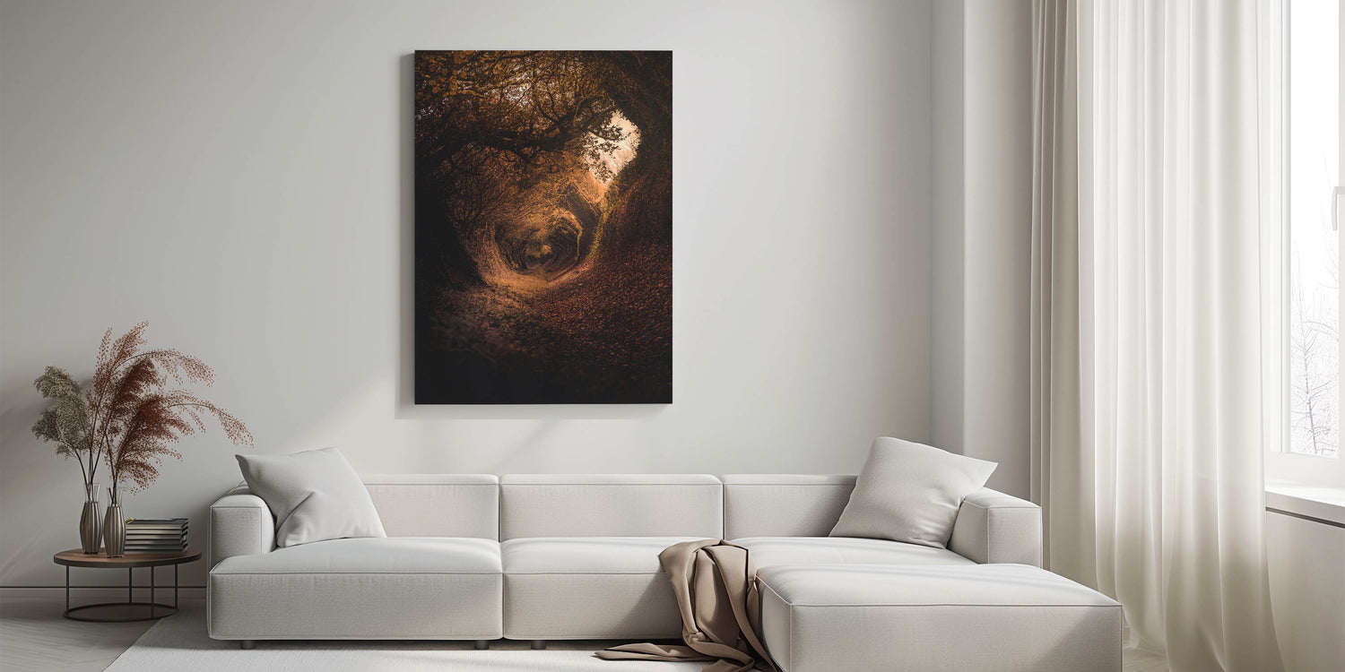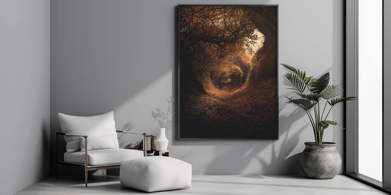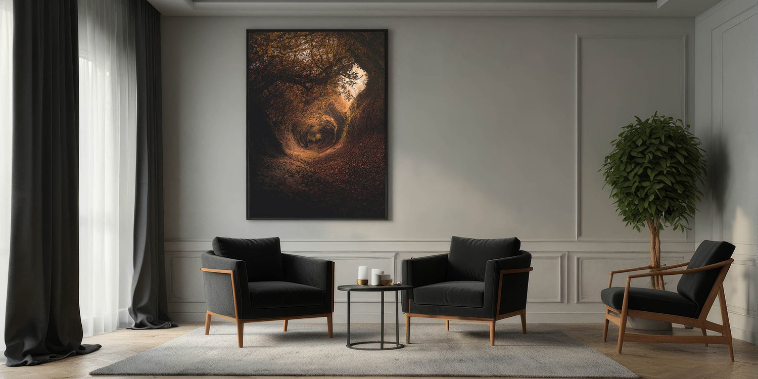 This fall art print evokes a sense of wonder, inviting viewers to imagine walking through this enchanted autumn passage. Whether used as seasonal decor or a permanent statement piece, this autumn wall decor transforms your space into a world of mystery and beauty.