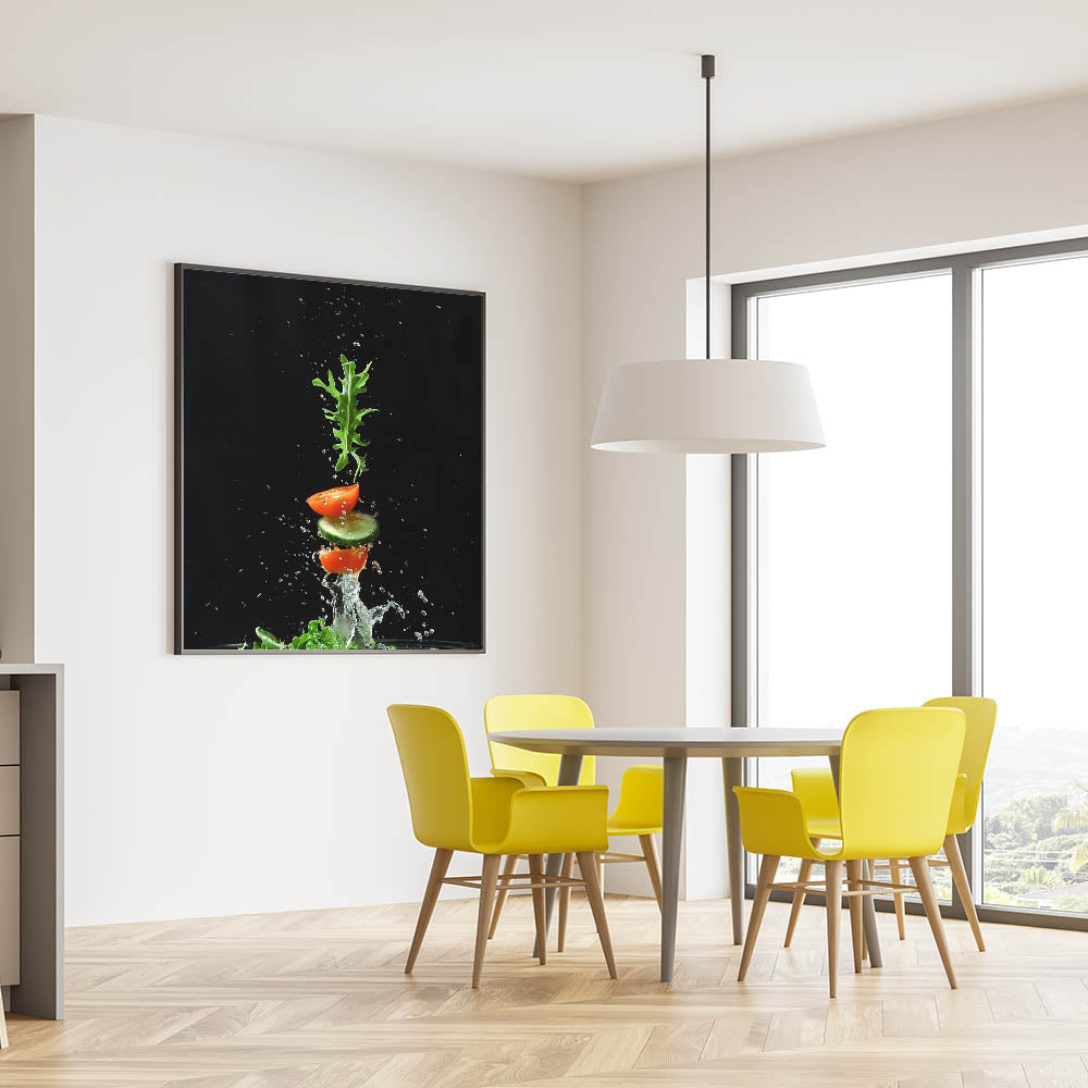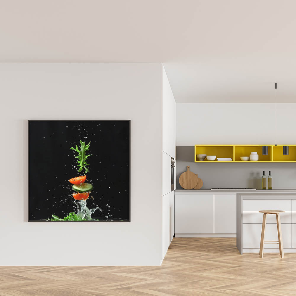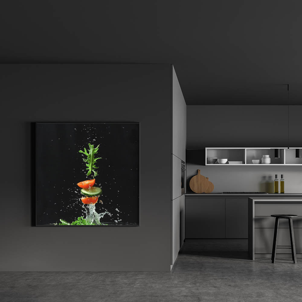 Capture the essence of freshness with this fruit photography art, a striking addition to your kitchen fruit decor. This dynamic composition showcases sliced tomatoes, crisp cucumber, and fresh arugula splashing in midair against a dramatic black background. The fruit still life art style, combined with high-speed photography, creates an energizing and modern aesthetic that stands out in any space.