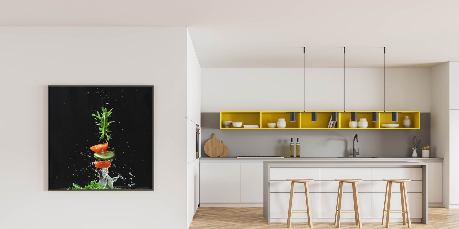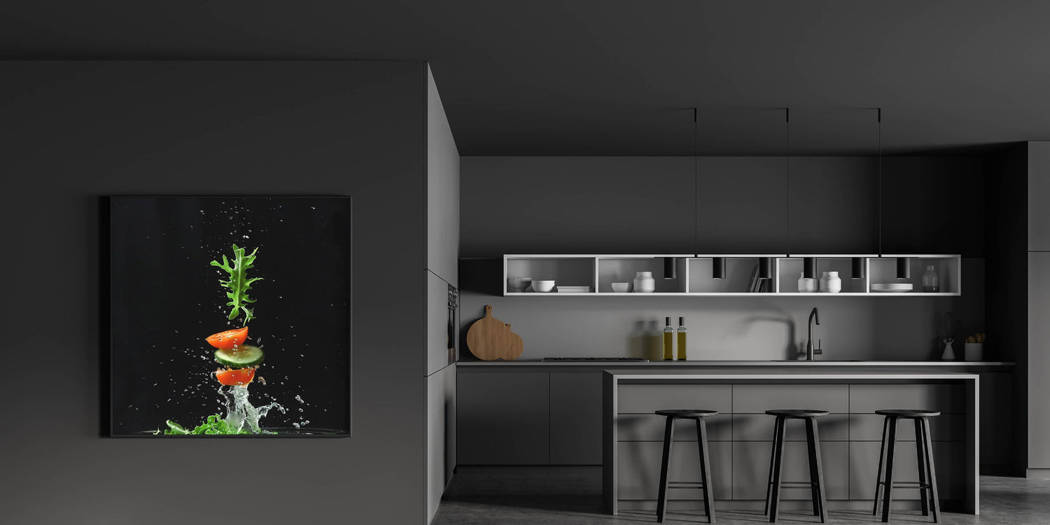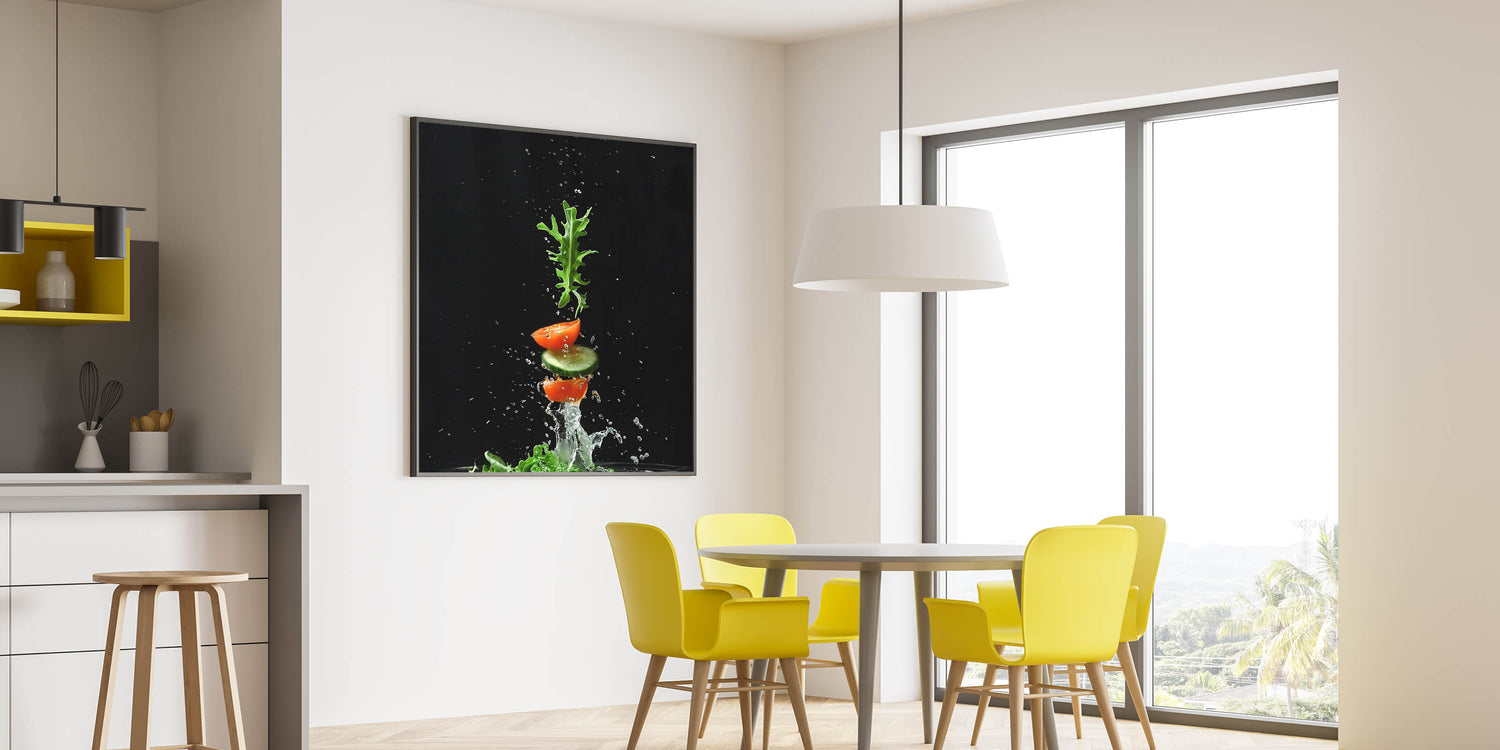 Capture the essence of freshness with this fruit photography art, a striking addition to your kitchen fruit decor. This dynamic composition showcases sliced tomatoes, crisp cucumber, and fresh arugula splashing in midair against a dramatic black background. The fruit still life art style, combined with high-speed photography, creates an energizing and modern aesthetic that stands out in any space.