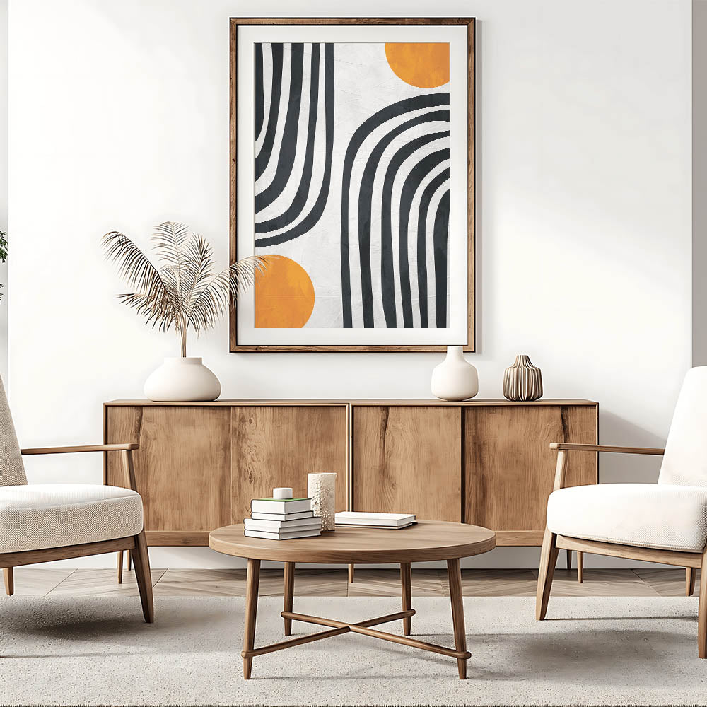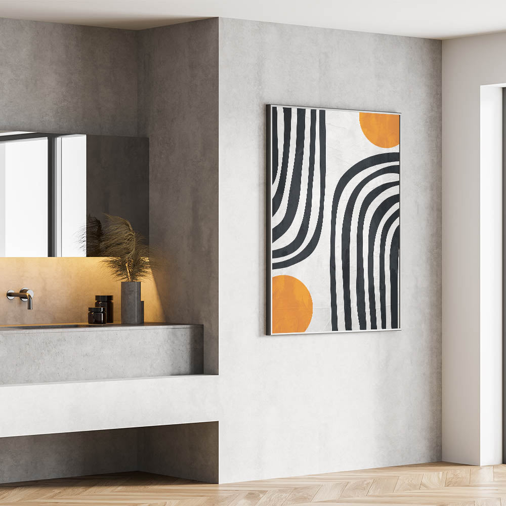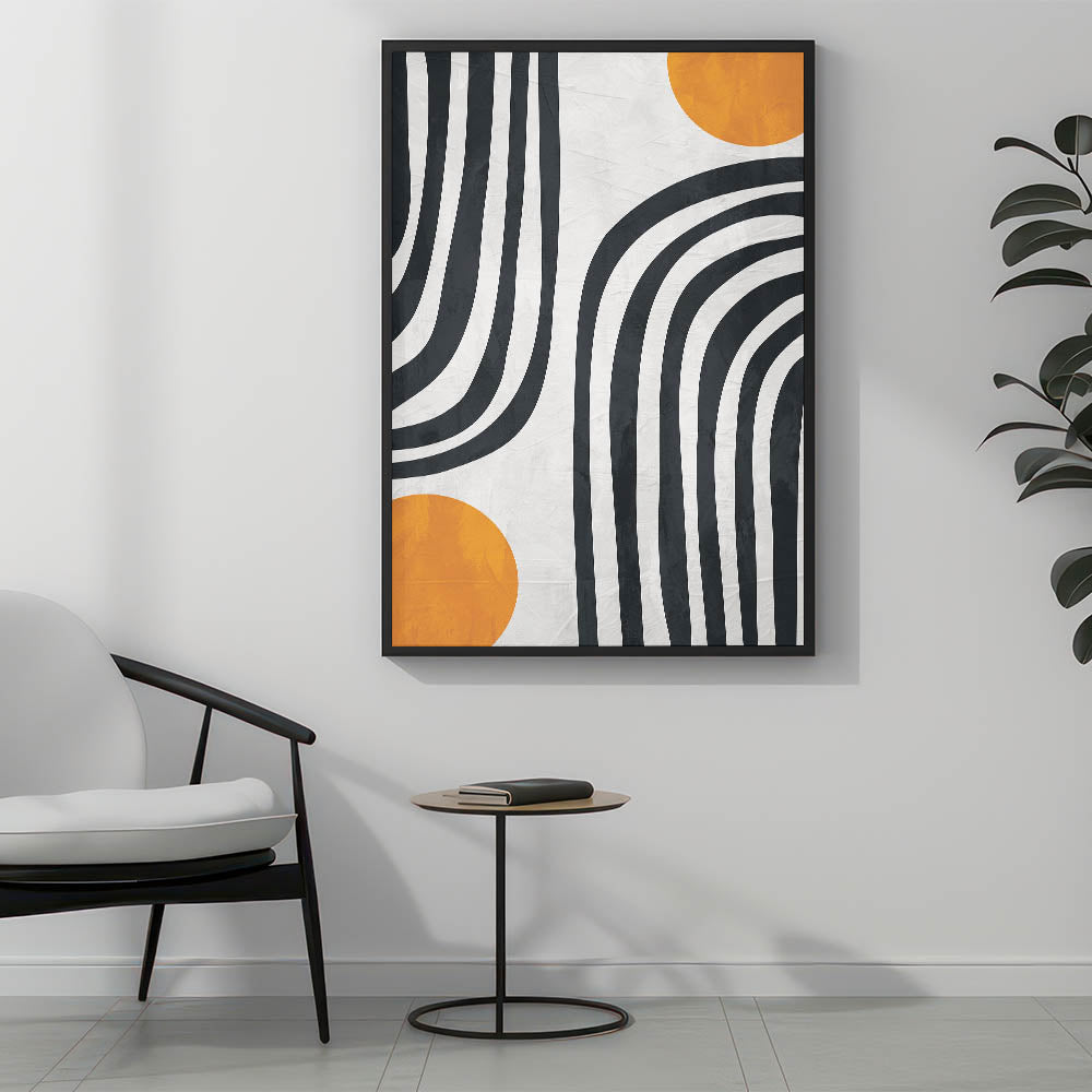 Make a statement with this geometric abstract painting, featuring bold black curving lines intertwined with vibrant orange circles on a neutral background. The contrast between structured lines and fluid motion creates a modern and eye-catching aesthetic, making this contemporary canvas print ideal for those who appreciate dynamic design. Whether placed in a living room, hallway, or office, this piece enhances your space with energy and movement.