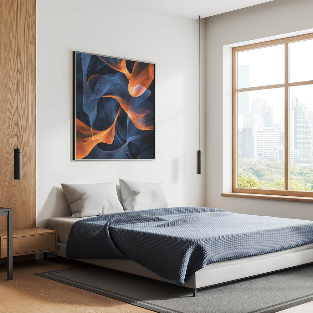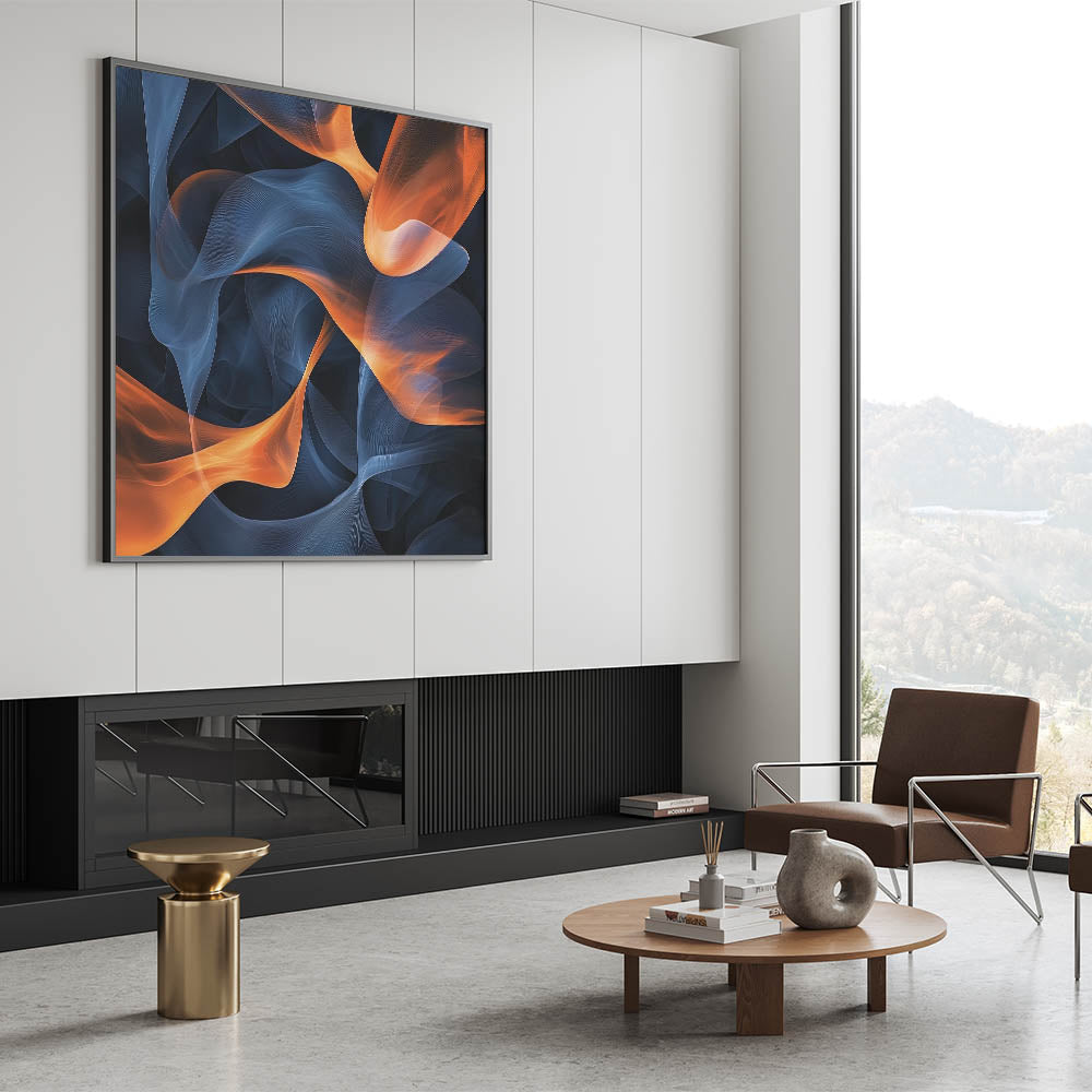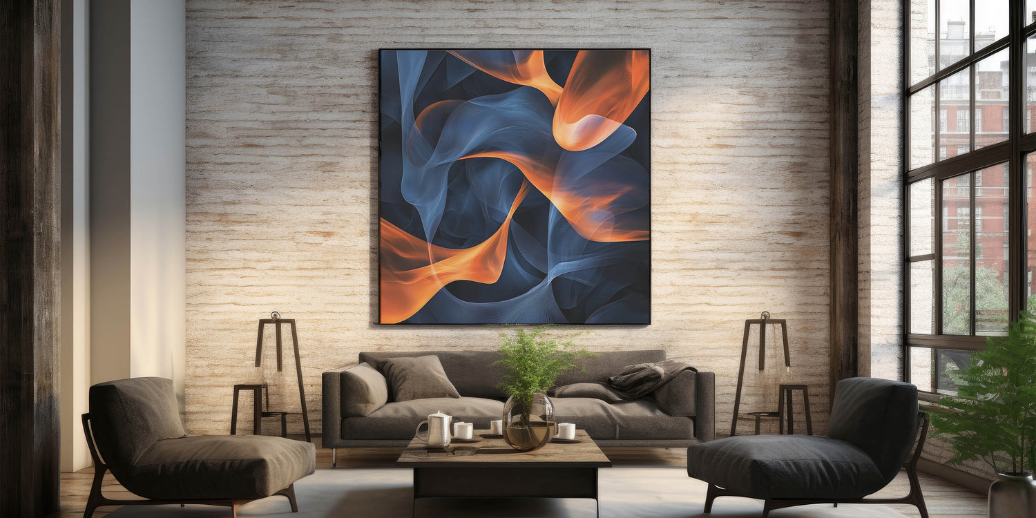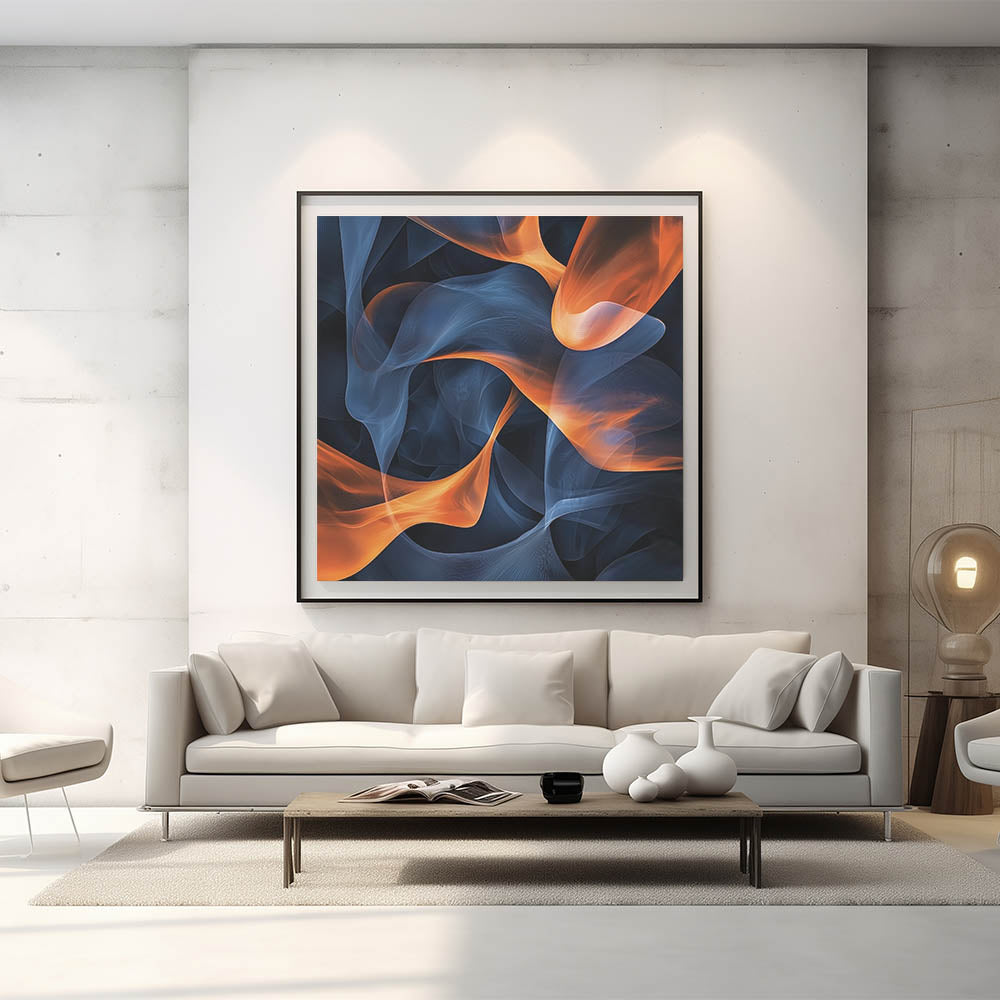Add a touch of drama and movement to your space with this large abstract painting, a mesmerizing blend of deep navy blue and vibrant fiery orange. This modern abstract wall art features fluid, smoke-like swirls that create a sense of energy and depth, making it a perfect statement piece for contemporary interiors. The high-contrast color palette brings warmth and intensity, making this artwork a striking focal point for any room.