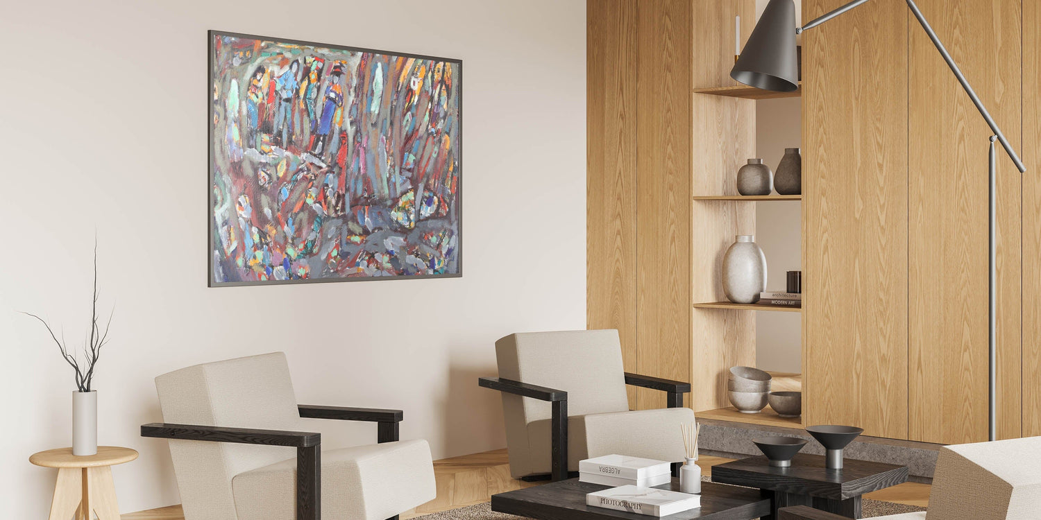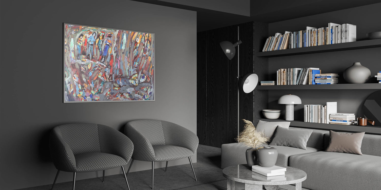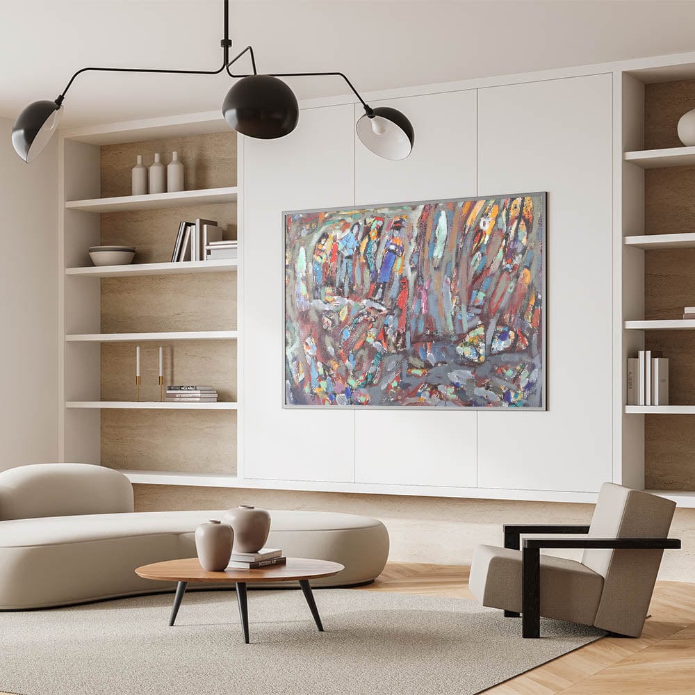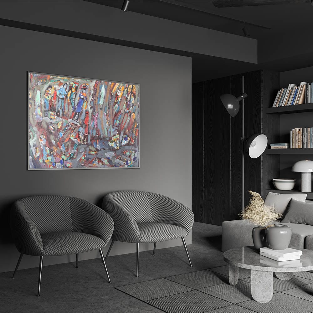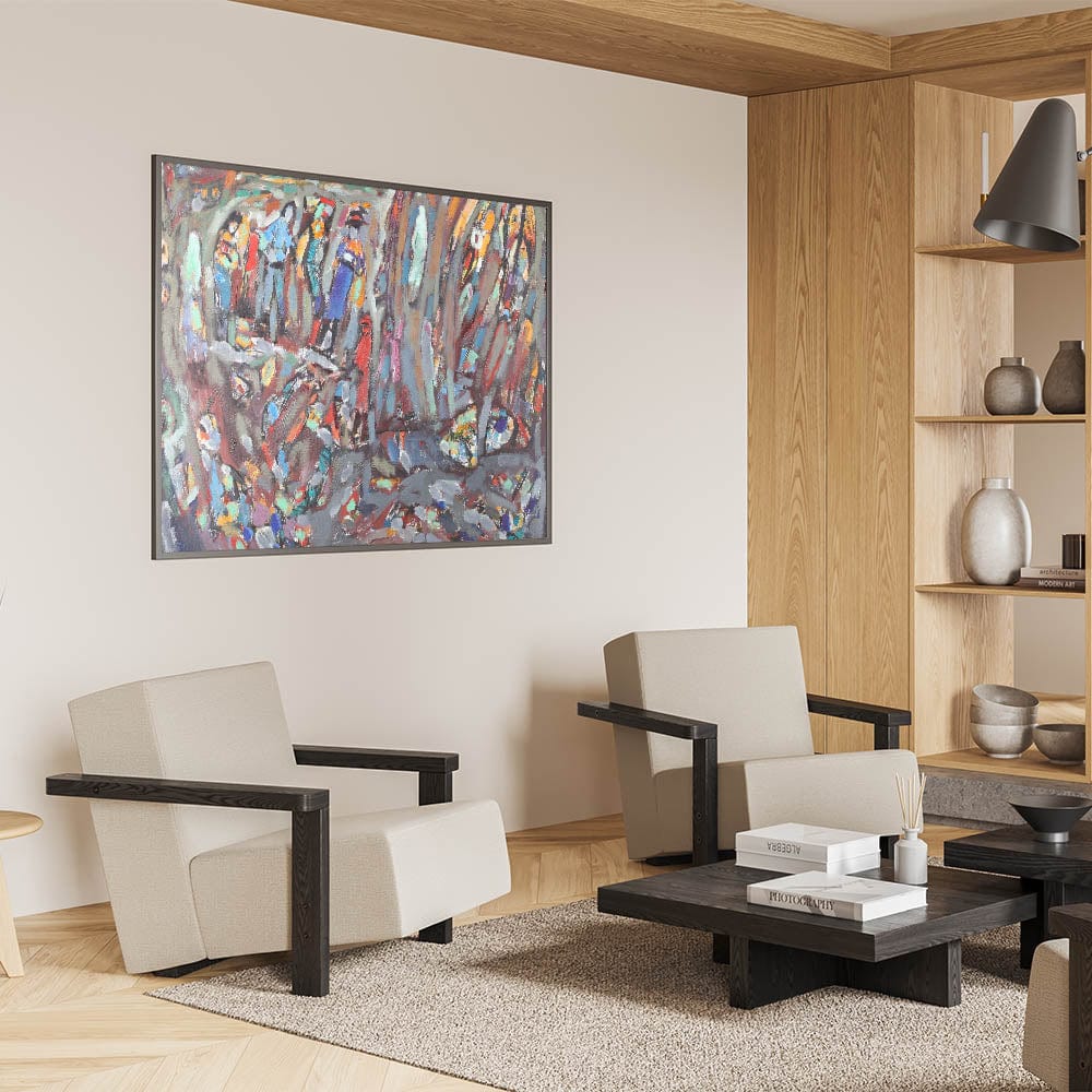Make a bold statement with this large abstract wall art, a striking blend of deep reds, blues, grays, and earthy tones. The expressive brushstrokes and layered figures bring depth and energy, making this modern abstract painting a compelling piece for contemporary interiors. Whether displayed in a living room, study, or gallery, this artwork adds artistic intrigue.