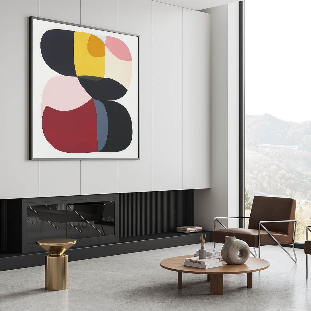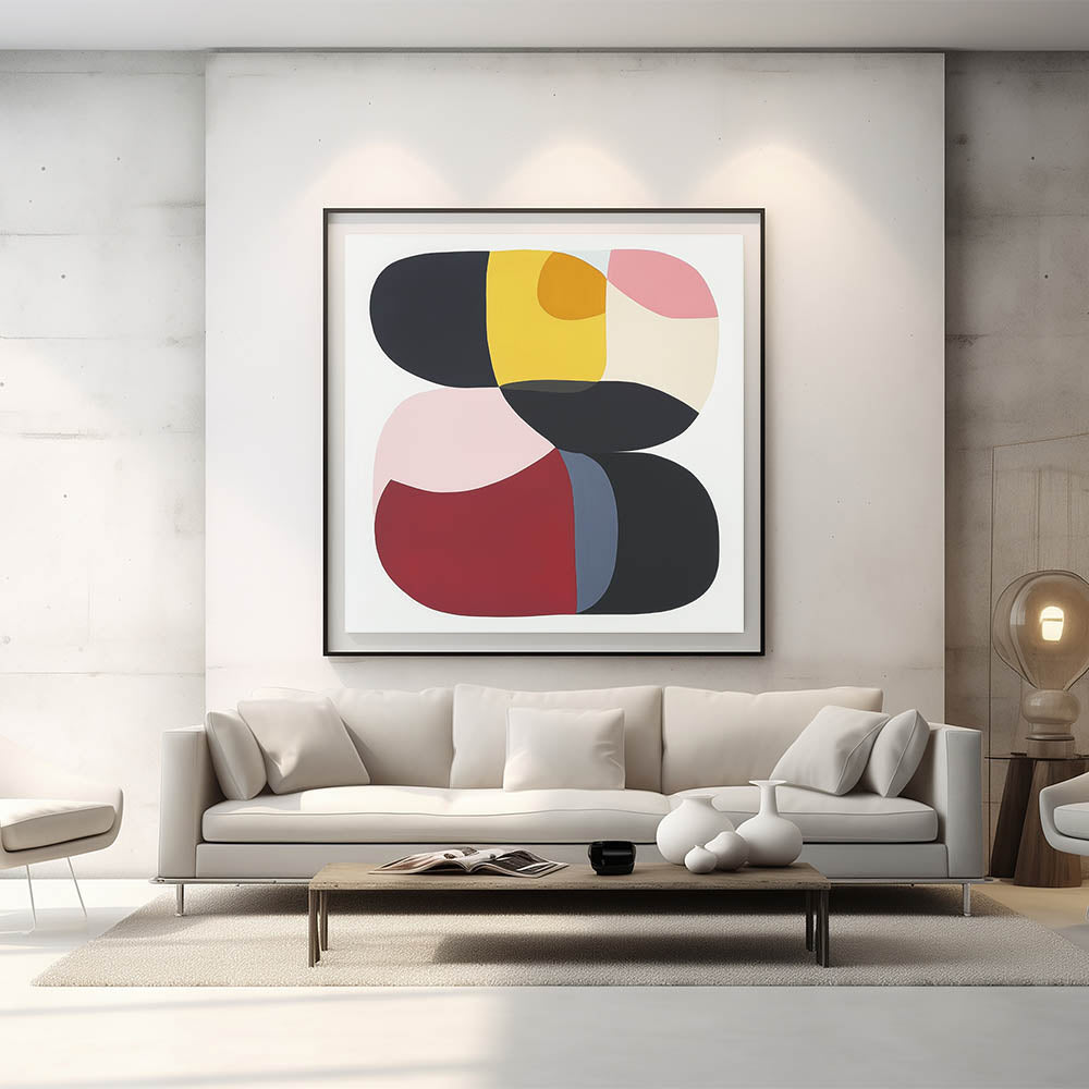 Make an unforgettable statement with this large abstract wall art, designed to bring bold personality and color into your space. Featuring oversized organic forms in black, burgundy, mustard yellow, blush pink, and navy, this piece commands attention while maintaining a soft, artistic flow.