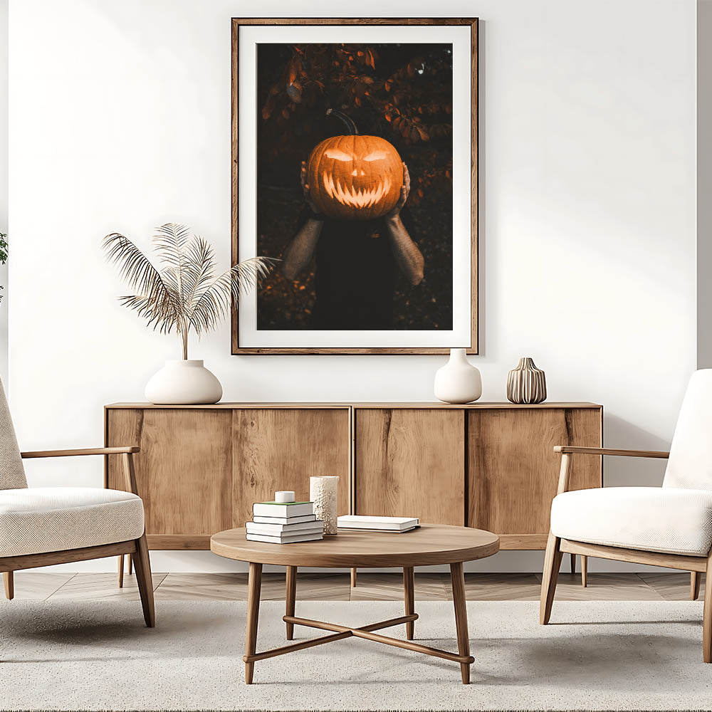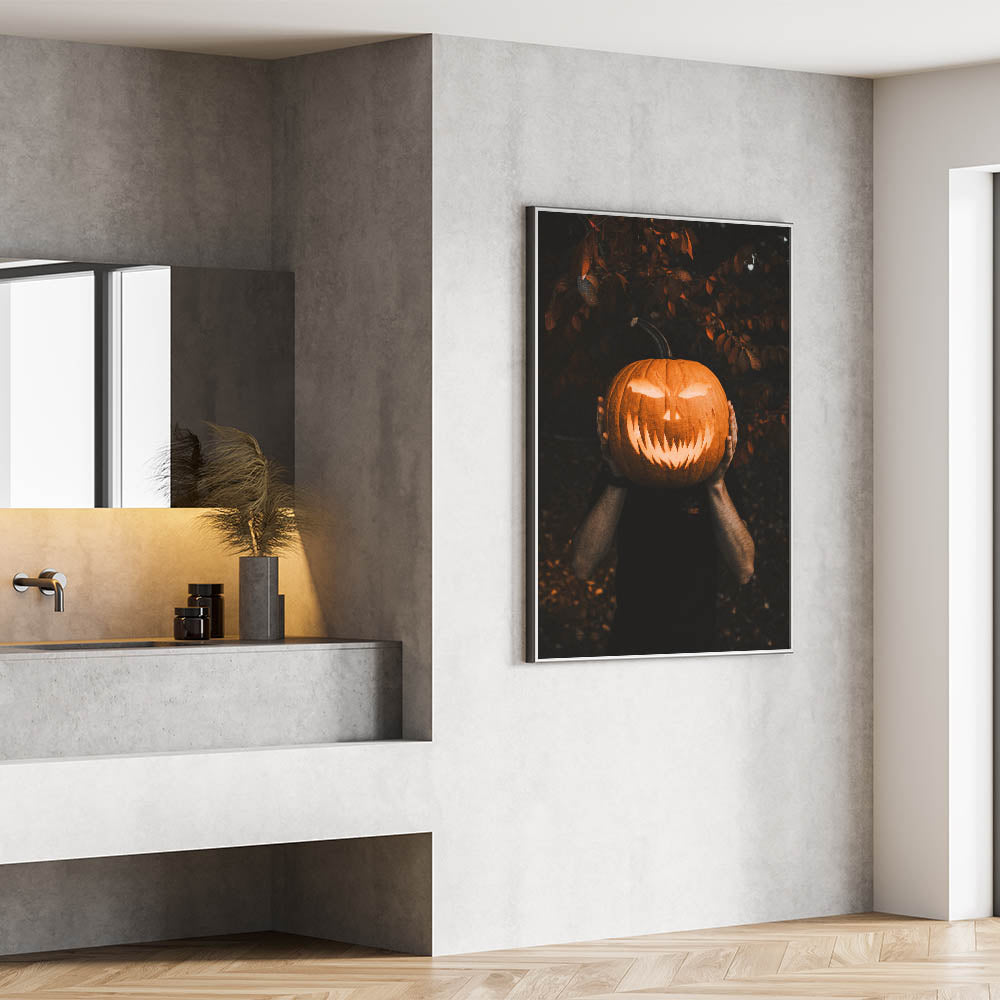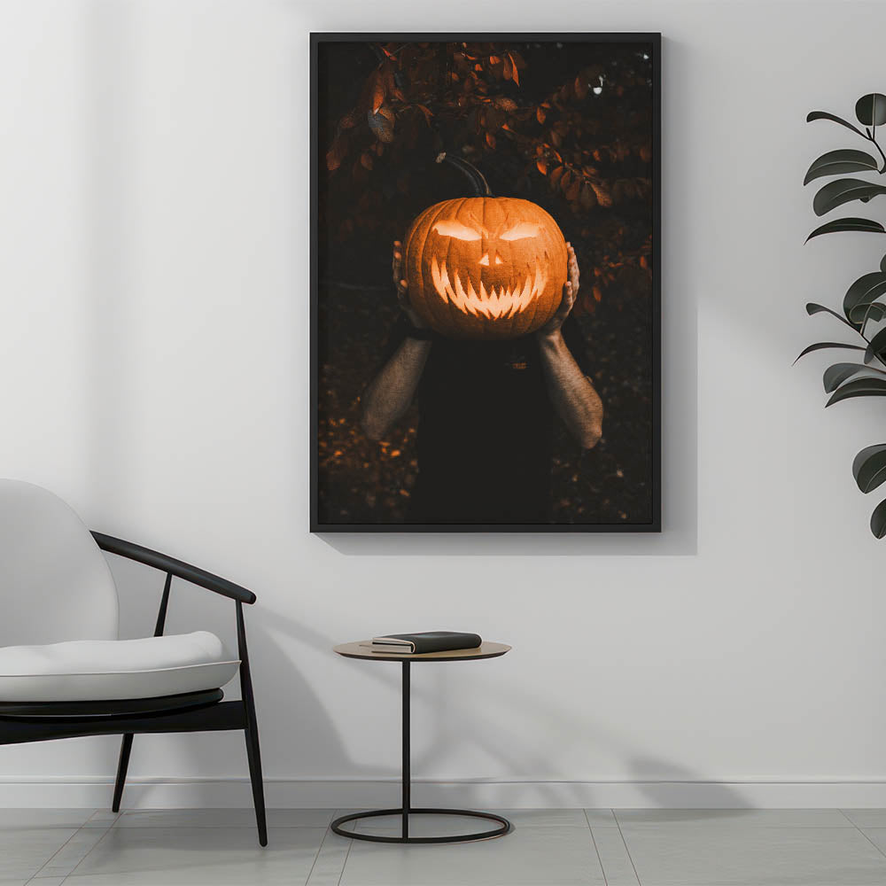 Celebrate the spirit of fall and Halloween with this spooky fall wall art, featuring a glowing jack-o’-lantern held in front of a mysterious figure. The deep orange tones of the pumpkin contrast beautifully against the dark, shadowy background, creating a haunting yet mesmerizing visual effect. The surrounding autumn leaves add warmth to the composition, making this autumn canvas art a striking choice for seasonal décor.
