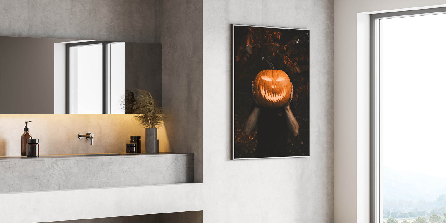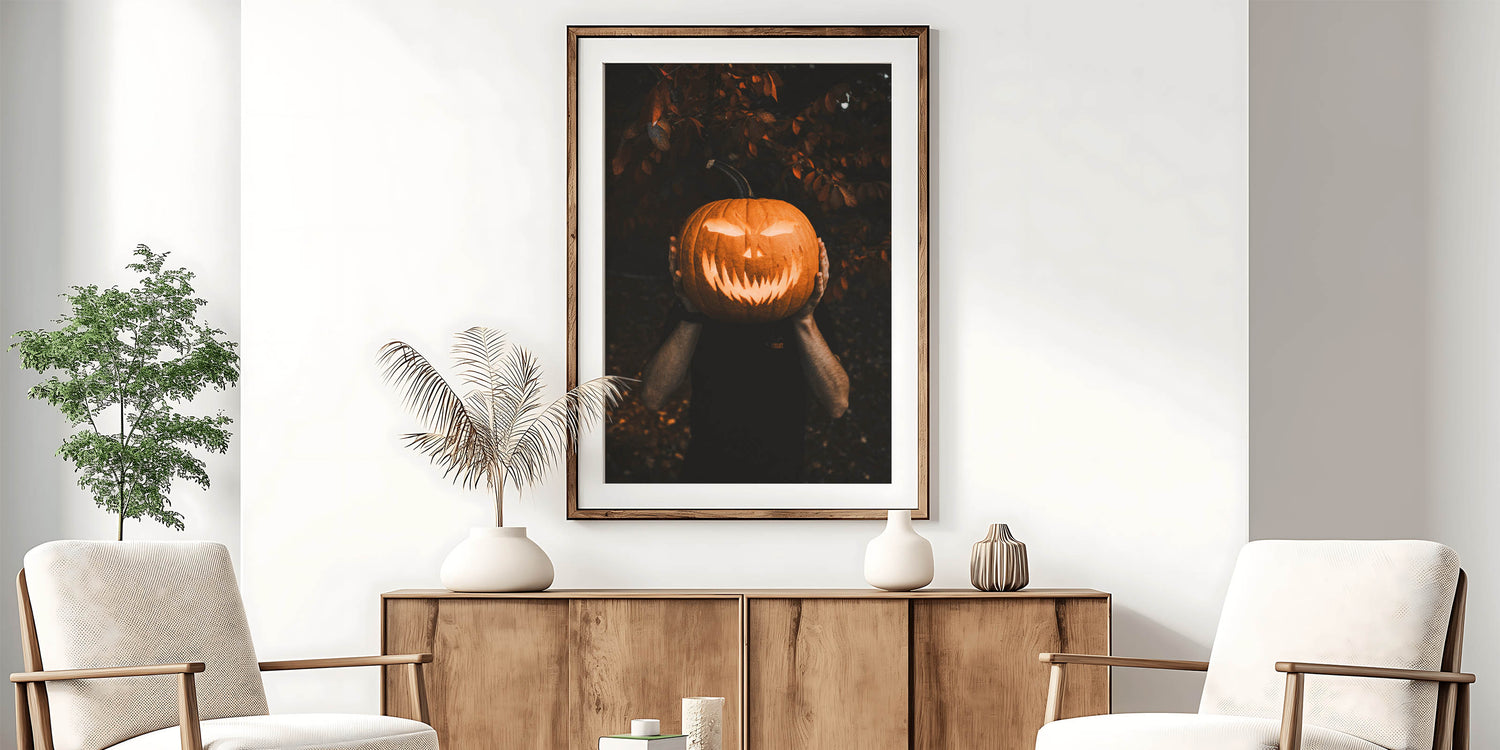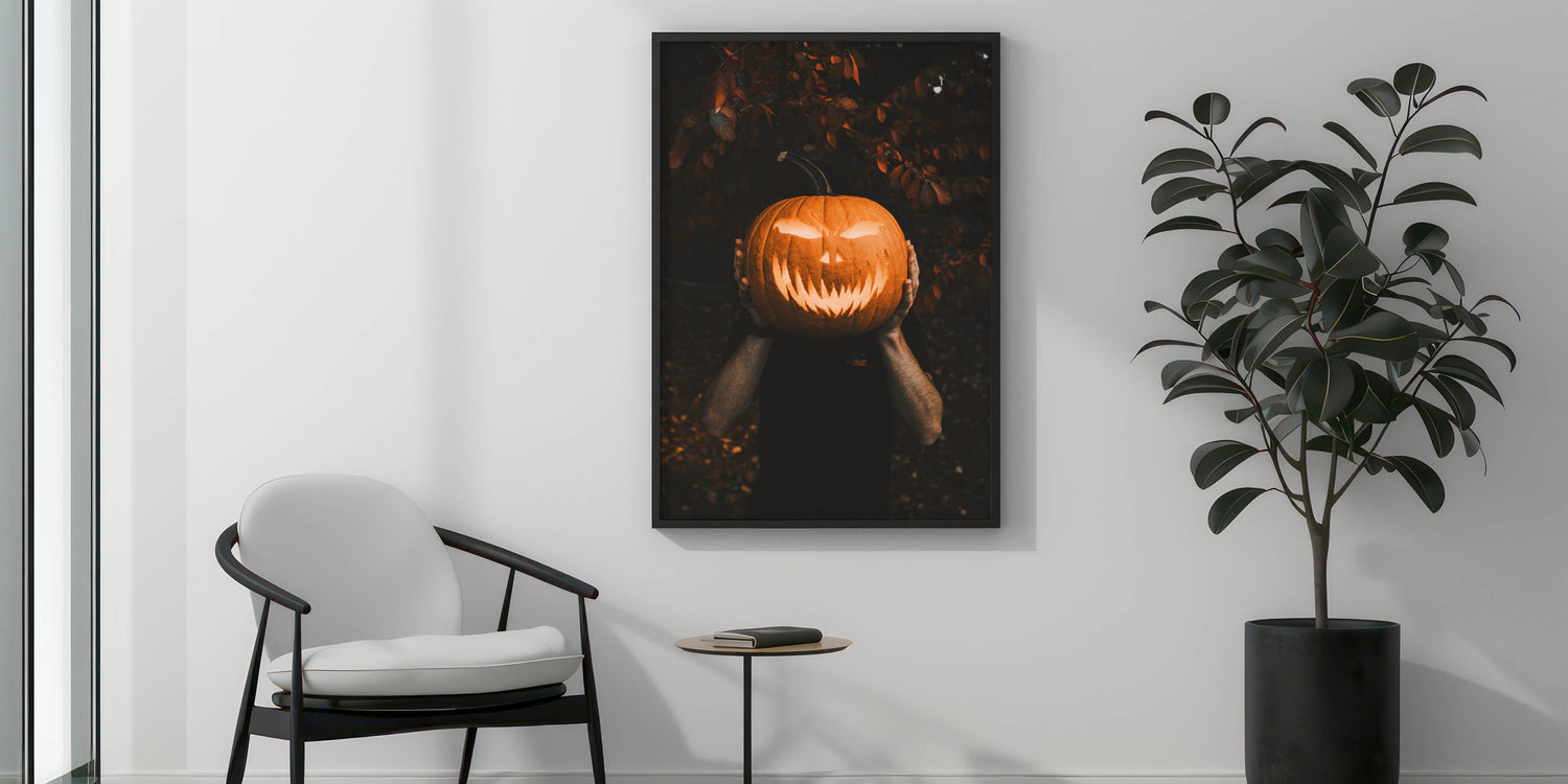 Celebrate the spirit of fall and Halloween with this spooky fall wall art, featuring a glowing jack-o’-lantern held in front of a mysterious figure. The deep orange tones of the pumpkin contrast beautifully against the dark, shadowy background, creating a haunting yet mesmerizing visual effect. The surrounding autumn leaves add warmth to the composition, making this autumn canvas art a striking choice for seasonal décor.