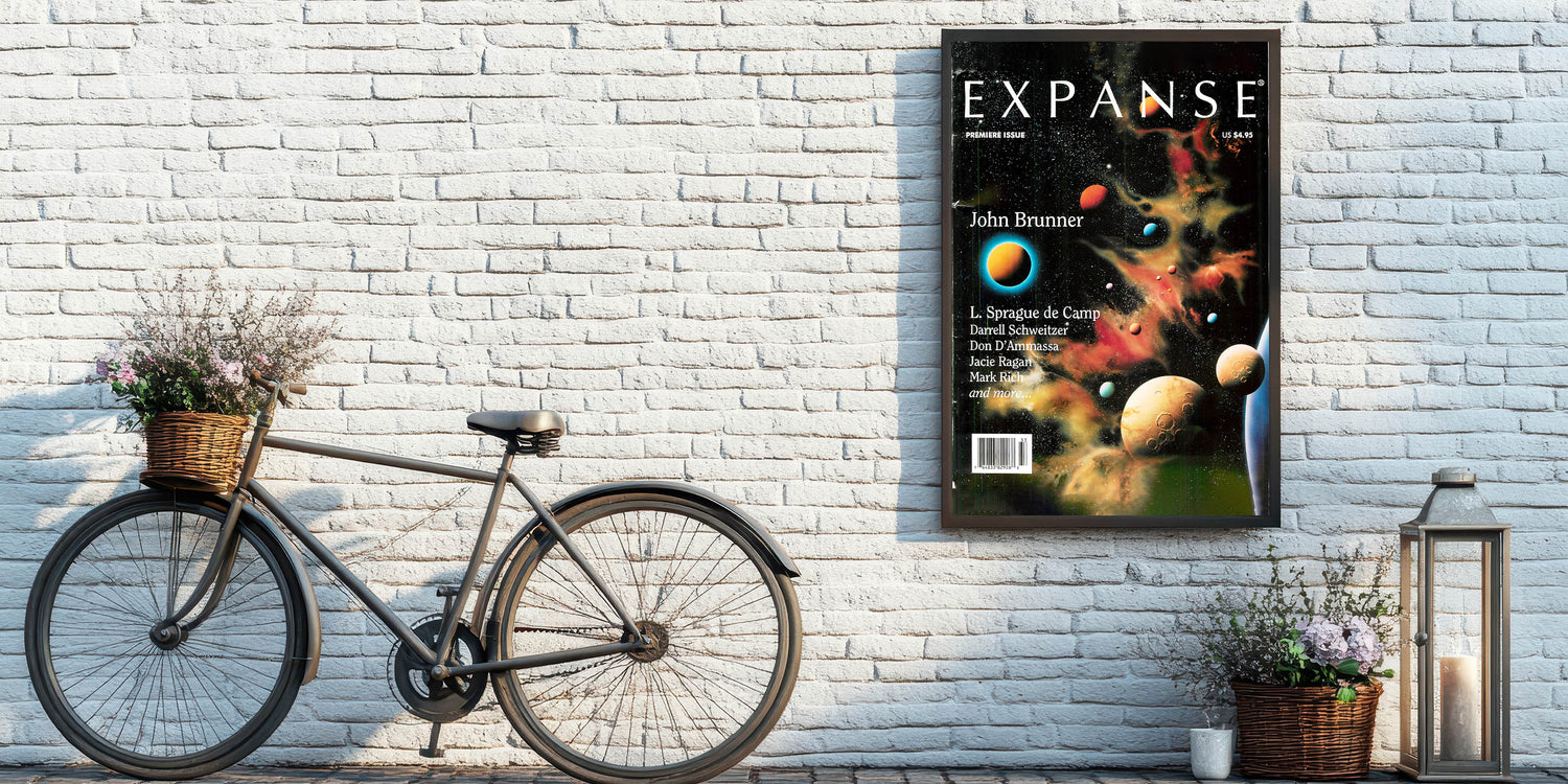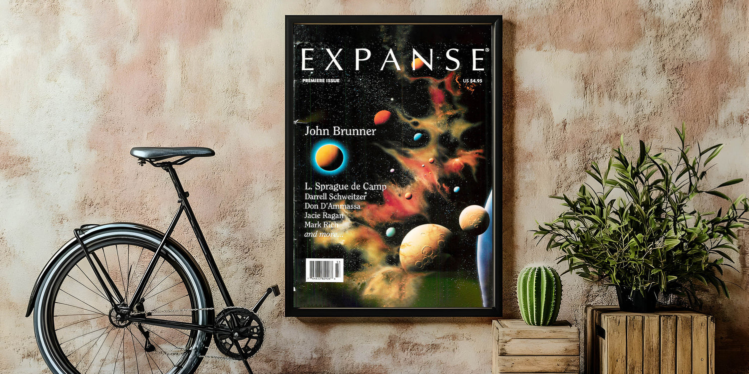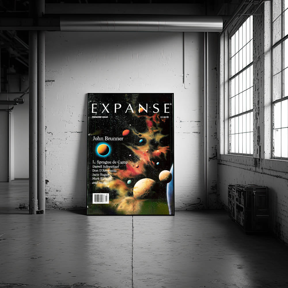 Bring the wonder of space exploration into your home with this vintage magazine cover wall art, featuring a striking retro sci-fi space scene. This classic magazine cover artwork from the EXPANSE premiere issue showcases vibrant planets, glowing nebulae, and a mesmerizing cosmic landscape, making it the perfect nostalgic vintage decor print for any space enthusiast or collector.