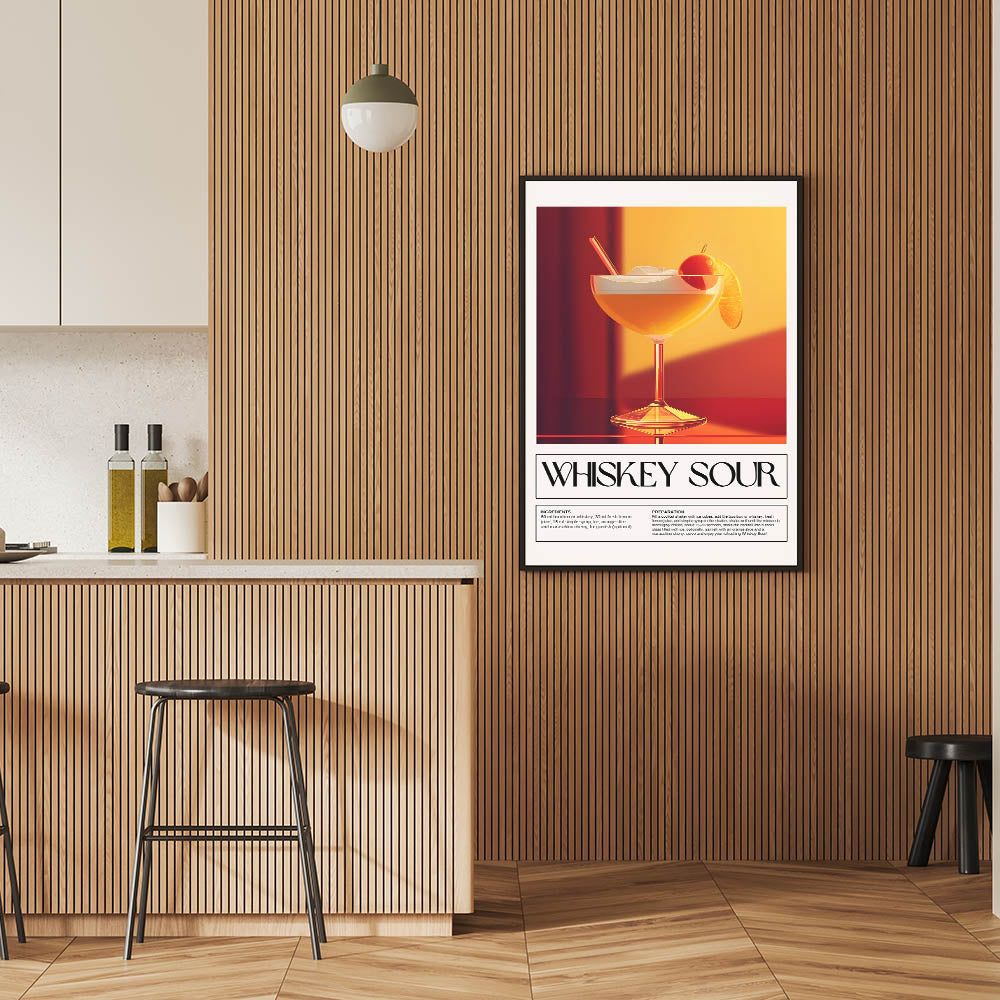 Enhance your bar decor with this stylish Whiskey Sour cocktail wall art. Featuring a beautifully detailed whiskey glass illustration, complete with citrus garnish and rich tones of gold, orange, and red, this beverage wall art is perfect for whiskey lovers and cocktail enthusiasts. The artwork also includes the classic Whiskey Sour recipe, making it both decorative and informative.
