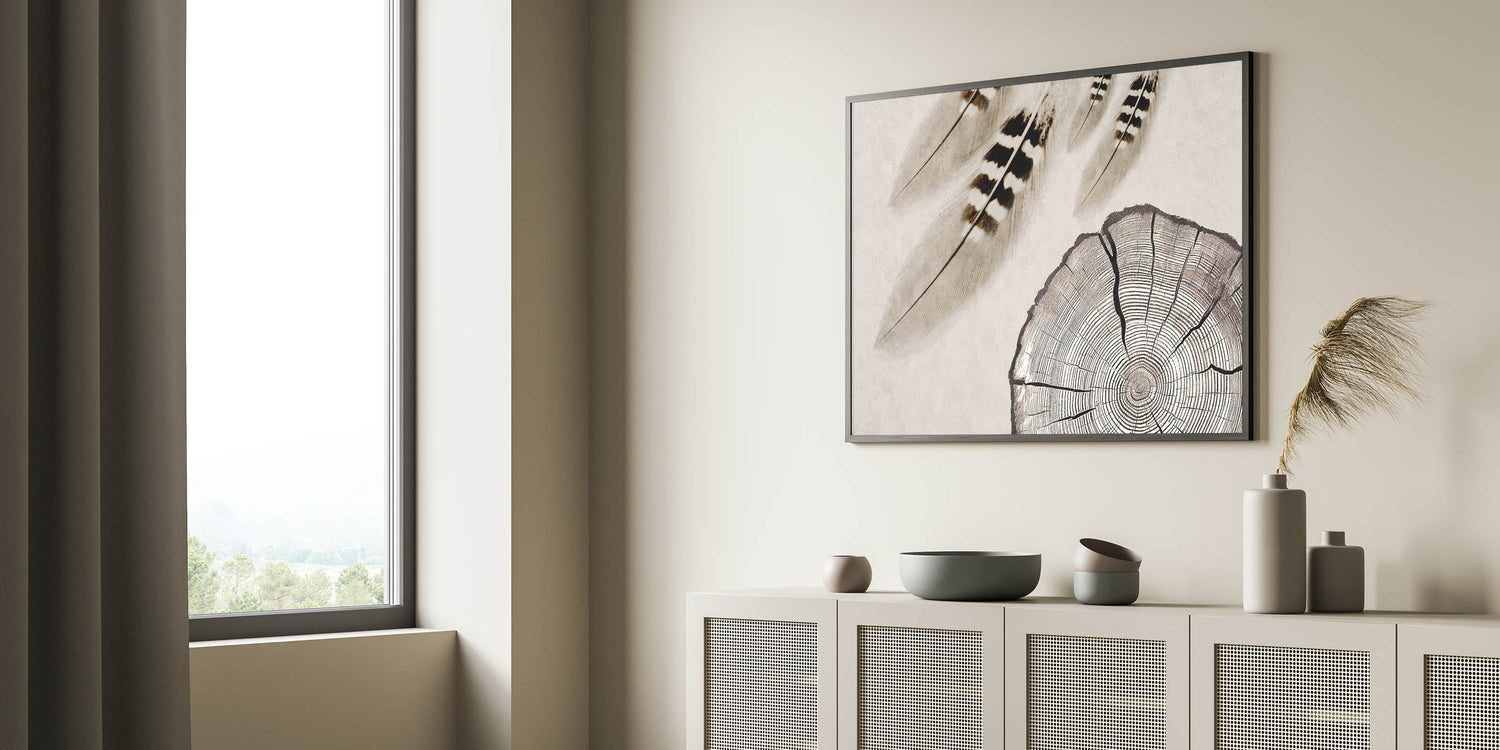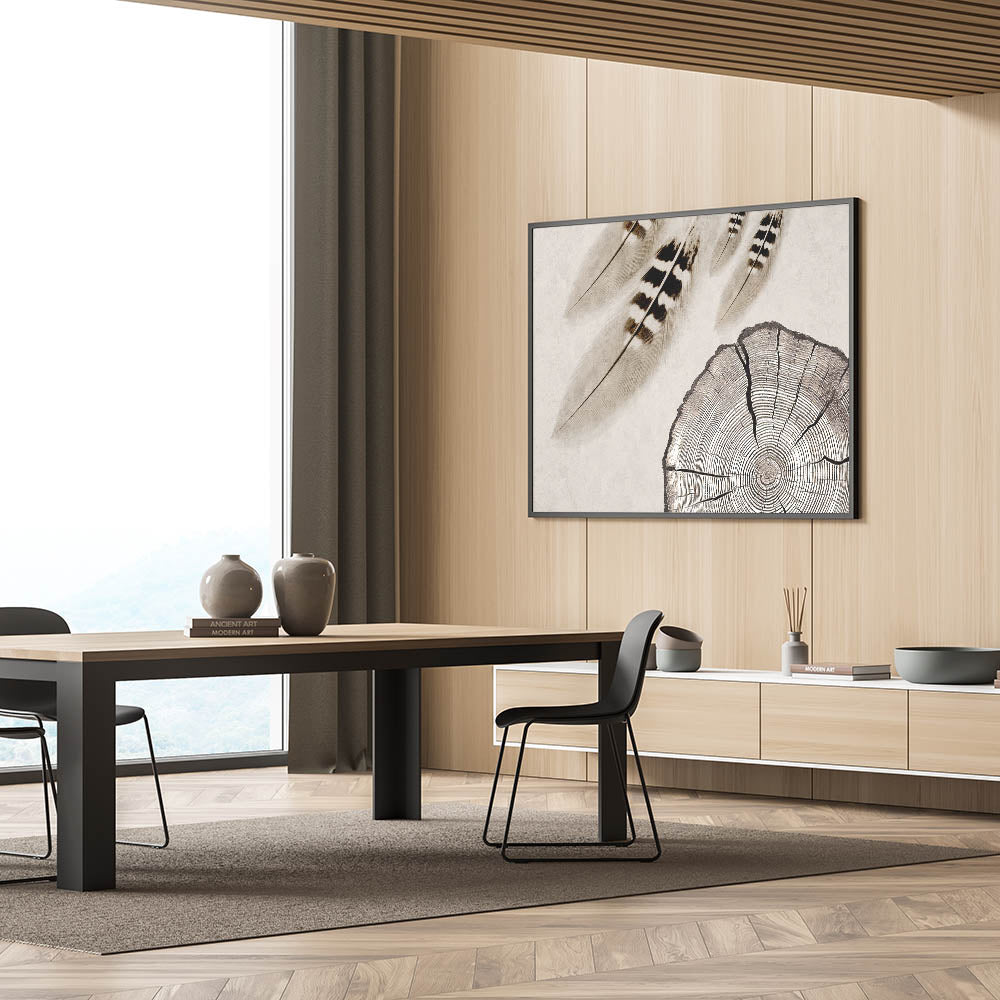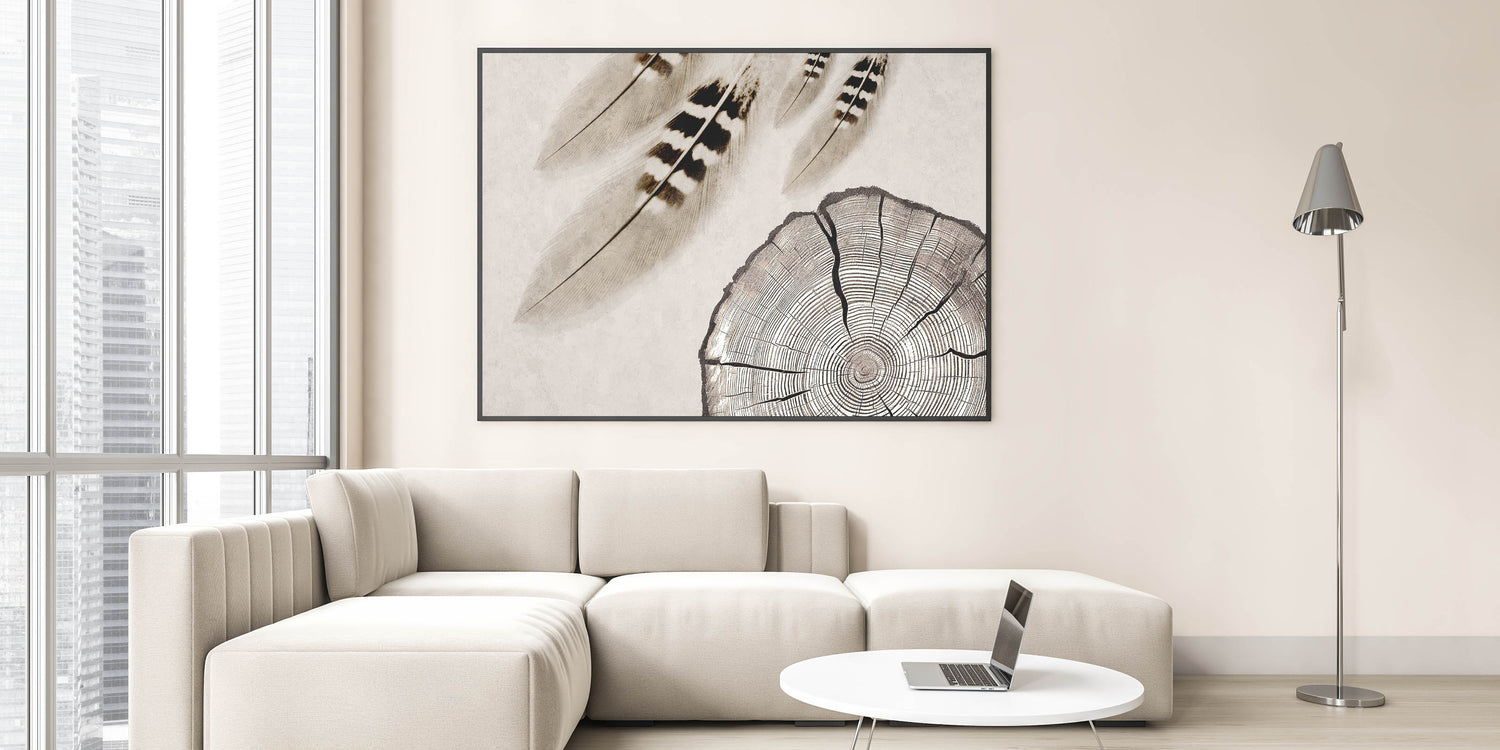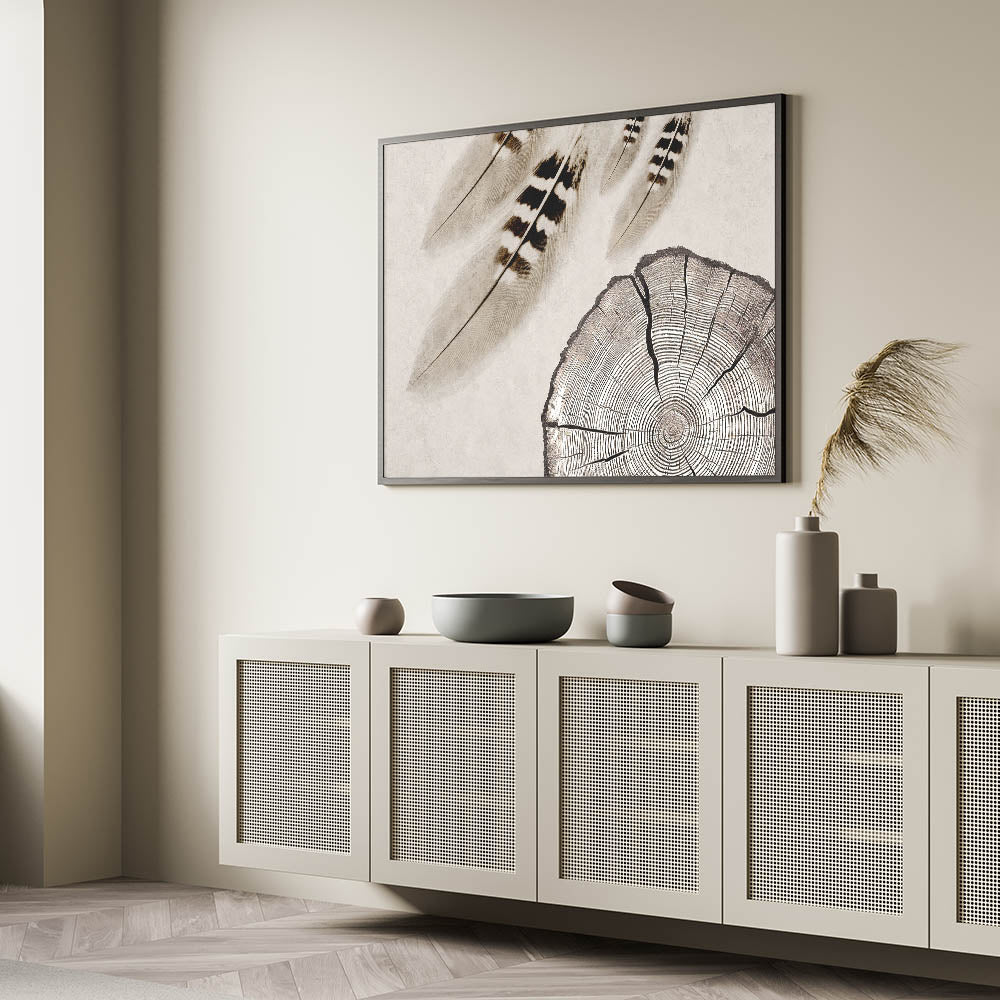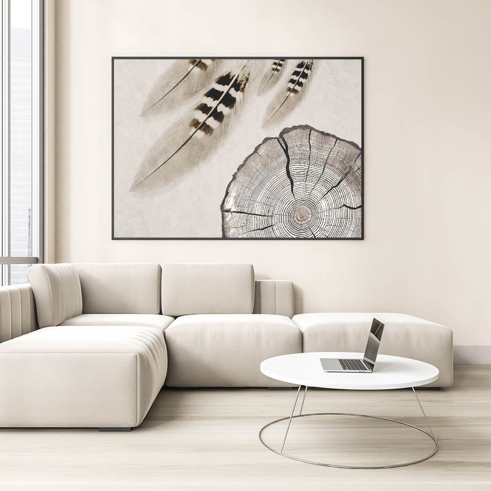 Embrace the natural beauty of the outdoors with this feather and tree rings art. This captivating design features intricately detailed feathers paired with the timeless elegance of tree rings, creating a harmonious blend of nature and modern rustic aesthetics. The soft earthy tones and subtle textures make this artwork a perfect addition to any space that celebrates the serenity of the natural world.