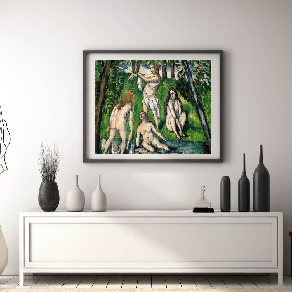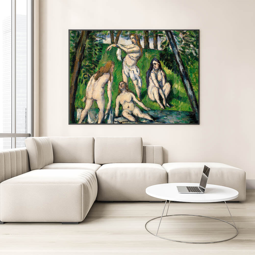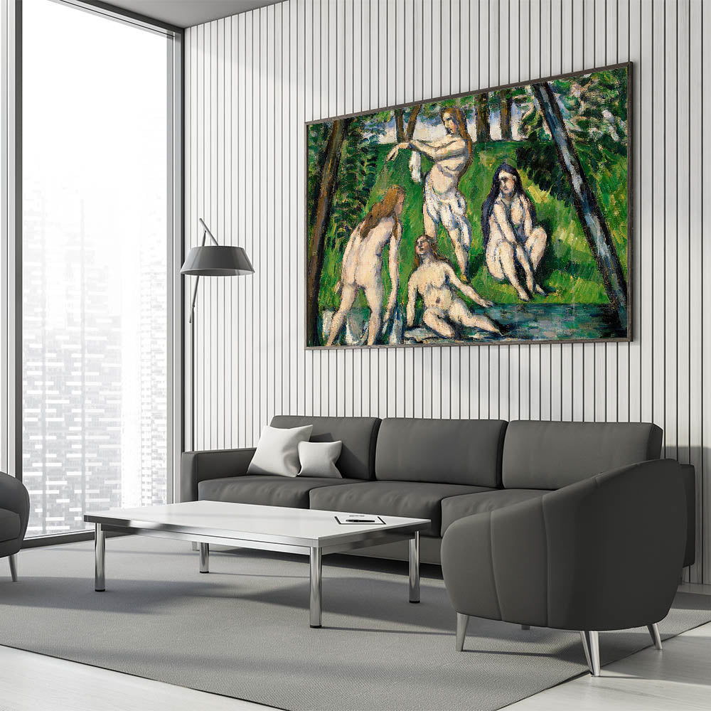 Bring the elegance of nature and human form into your home with "Four Bathers," a timeless piece of modern wall art by Paul Cézanne. This captivating artwork portrays a serene scene of four bathers surrounded by lush greenery, with rich textures and bold brushstrokes that convey movement and depth. Perfect for trendy home decor, this artwork is a celebration of natural beauty and artistic mastery.