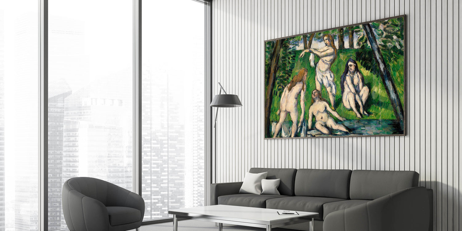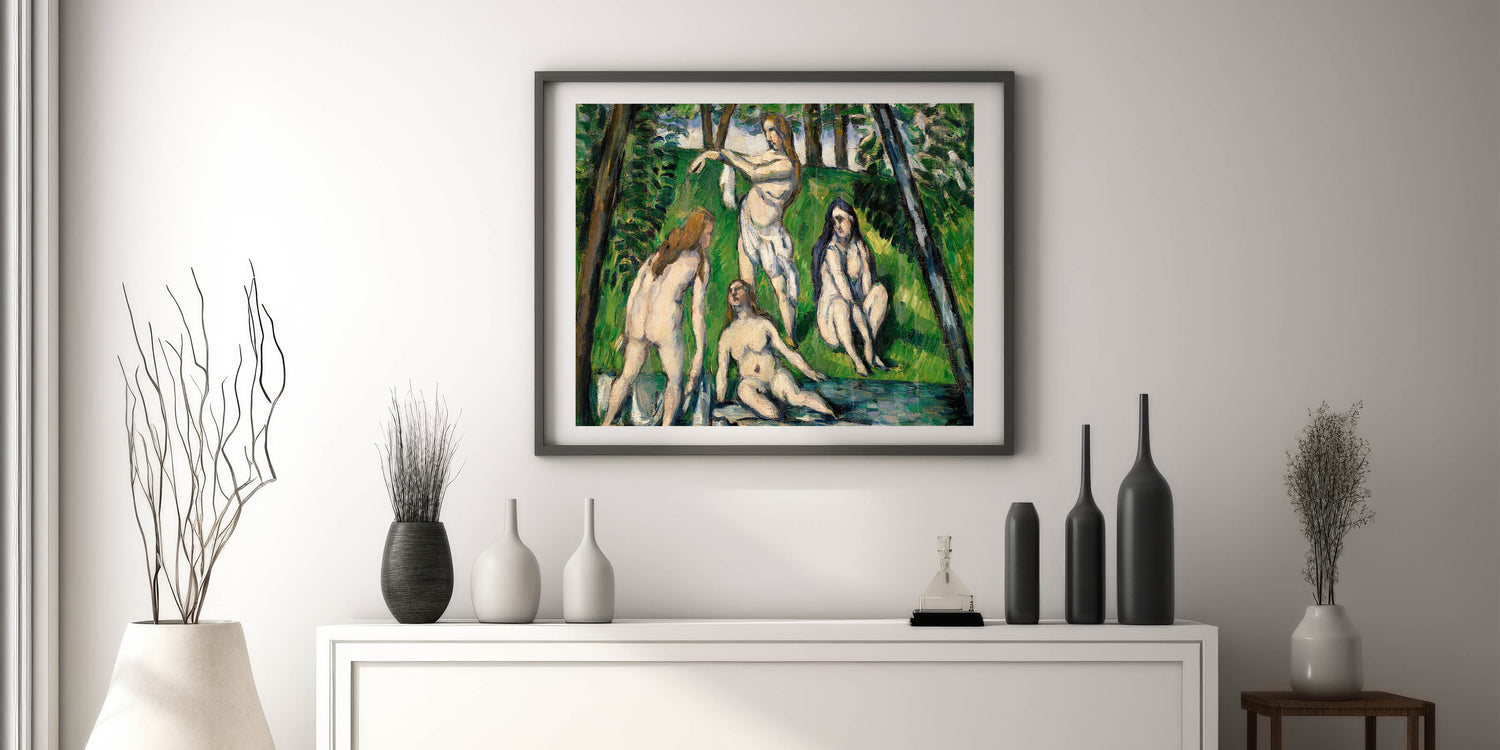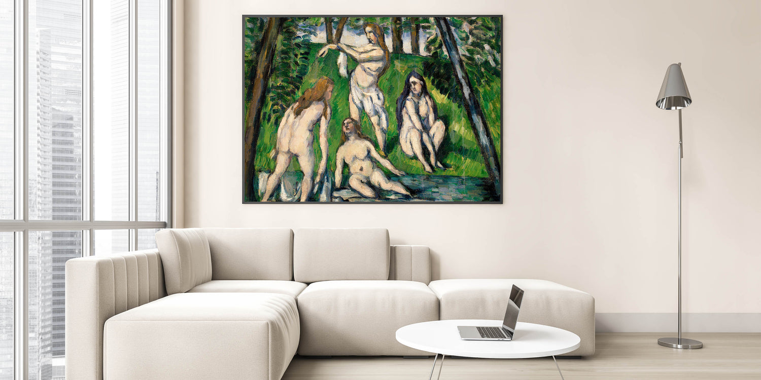 Bring the elegance of nature and human form into your home with "Four Bathers," a timeless piece of modern wall art by Paul Cézanne. This captivating artwork portrays a serene scene of four bathers surrounded by lush greenery, with rich textures and bold brushstrokes that convey movement and depth. Perfect for trendy home decor, this artwork is a celebration of natural beauty and artistic mastery.