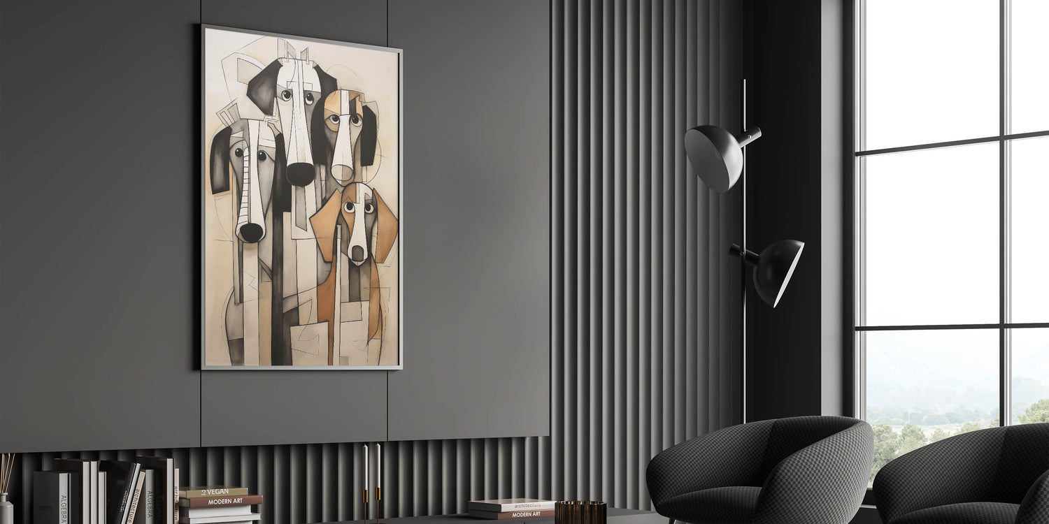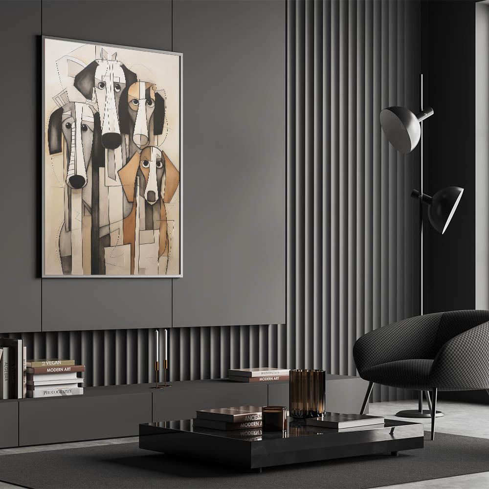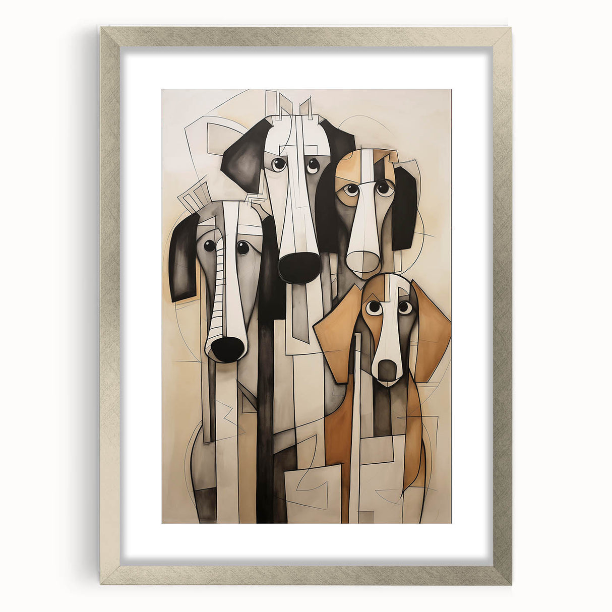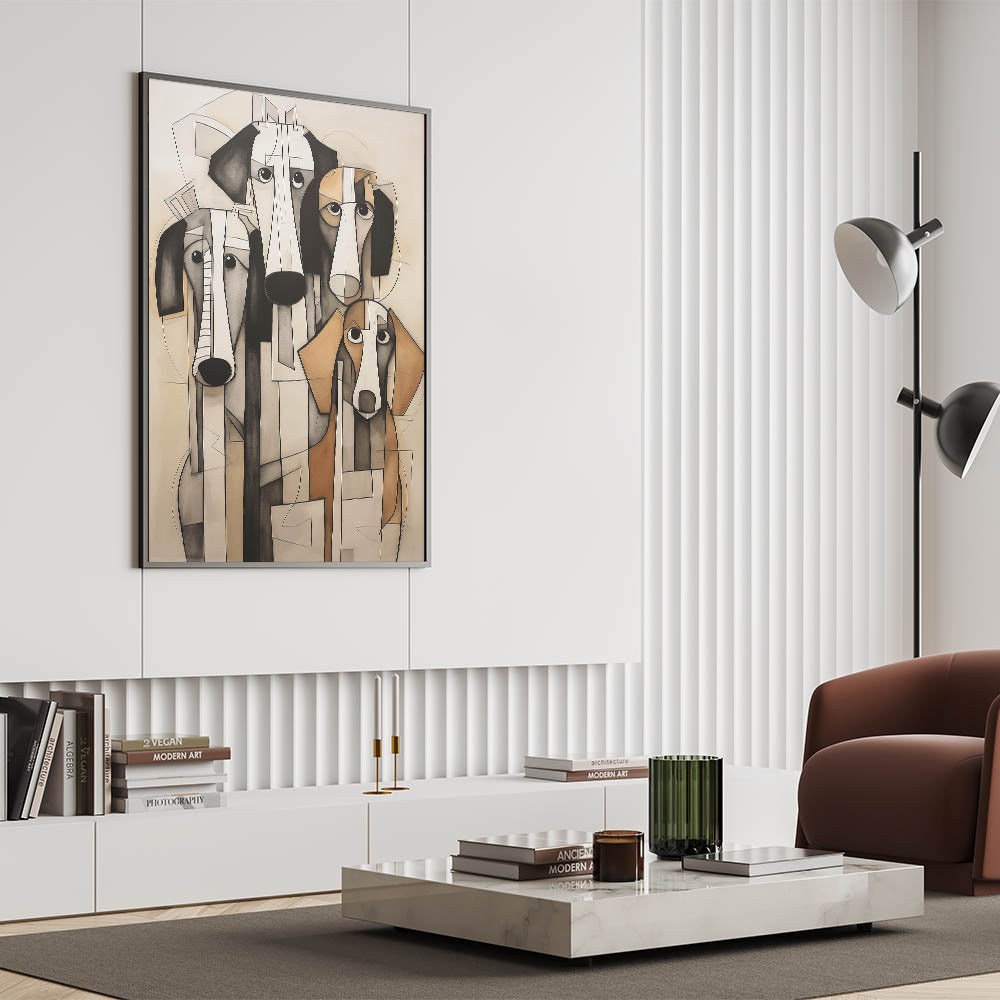 Bring a playful touch to your space with our Abstract Figurative Dog Art, a delightful piece that blends geometric design with charming canine figures. This artwork features four stylized dogs rendered in bold lines and a mix of neutral and earthy tones, creating a visually engaging piece that captures the essence of modern abstract art. Perfect for dog lovers and contemporary art enthusiasts alike, this piece adds character and warmth to any room.