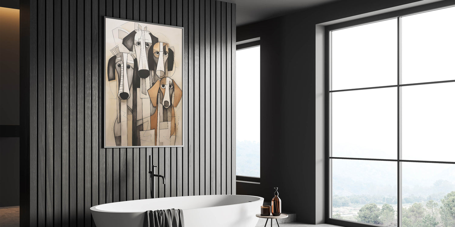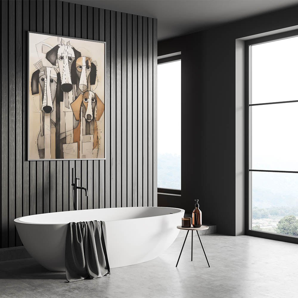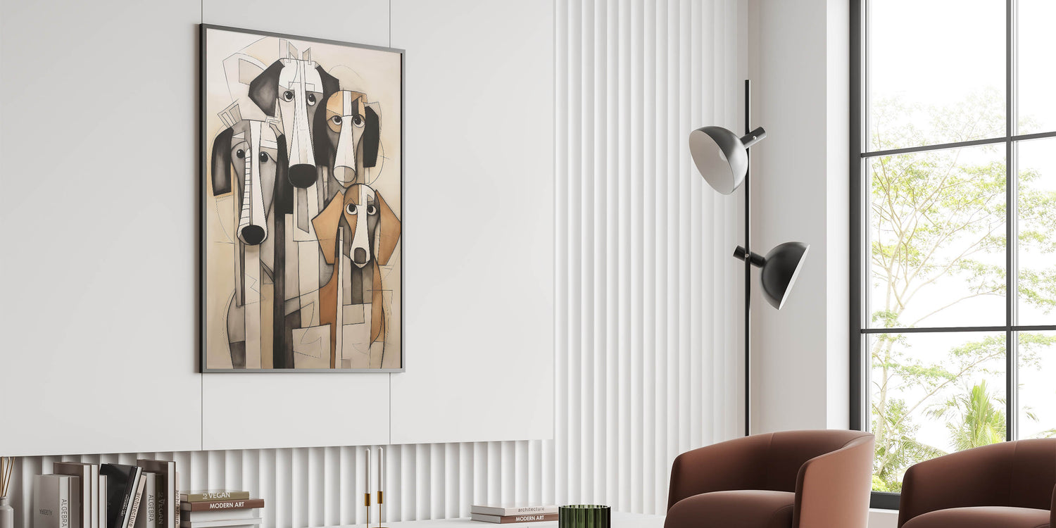 Bring a playful touch to your space with our Abstract Figurative Dog Art, a delightful piece that blends geometric design with charming canine figures. This artwork features four stylized dogs rendered in bold lines and a mix of neutral and earthy tones, creating a visually engaging piece that captures the essence of modern abstract art. Perfect for dog lovers and contemporary art enthusiasts alike, this piece adds character and warmth to any room.