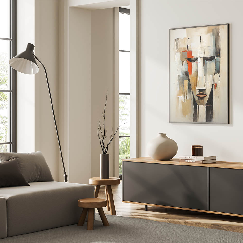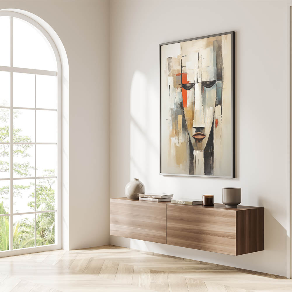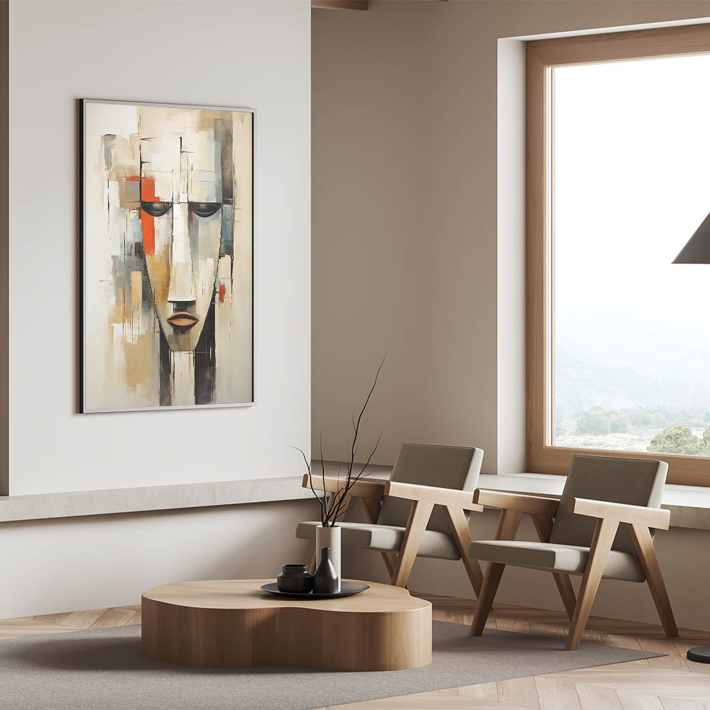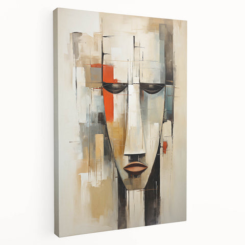 Introducing our Contemporary Abstract Face wall art, a captivating piece that merges modern design with artistic flair. This artwork, featuring a striking abstract face in a palette of neutral tones with bold accents, is sure to be a standout addition to any contemporary space.