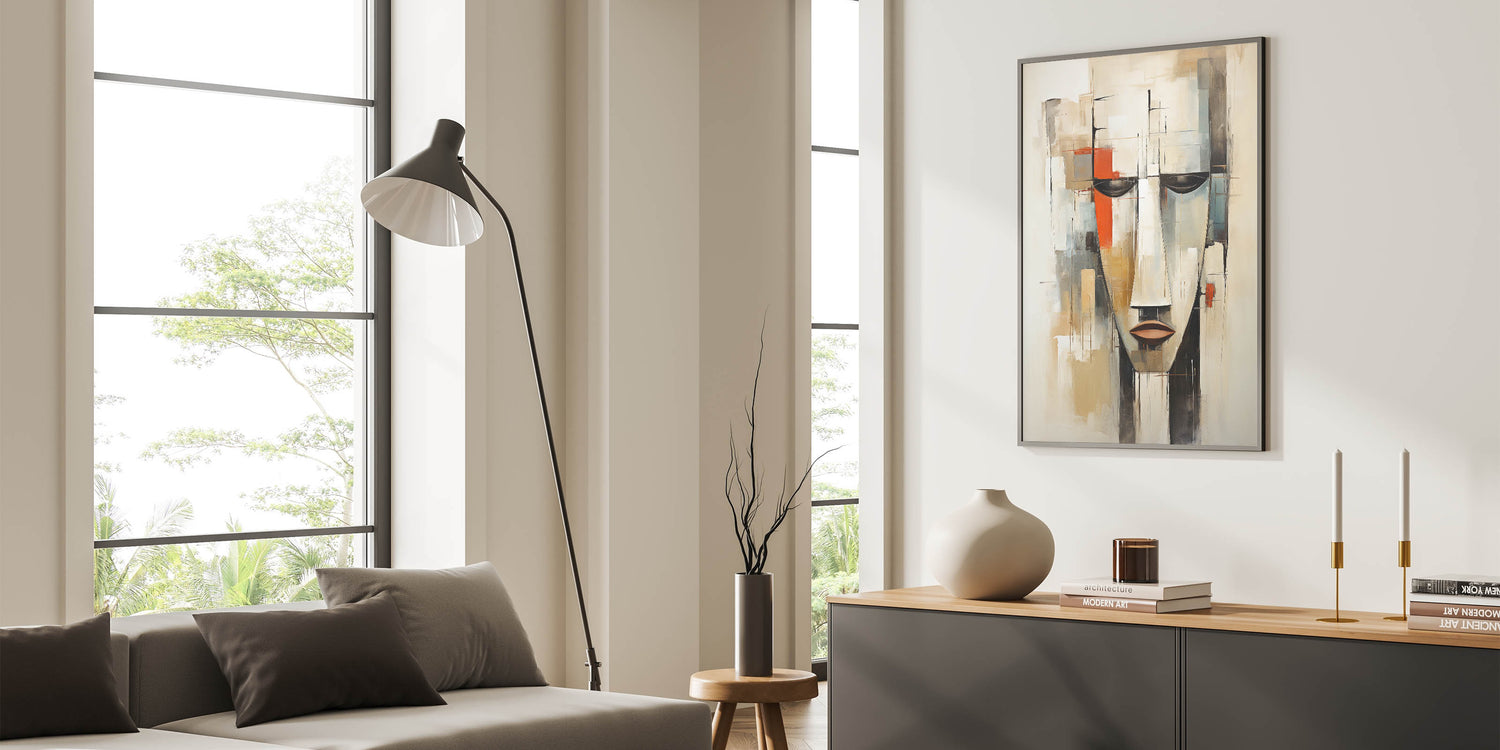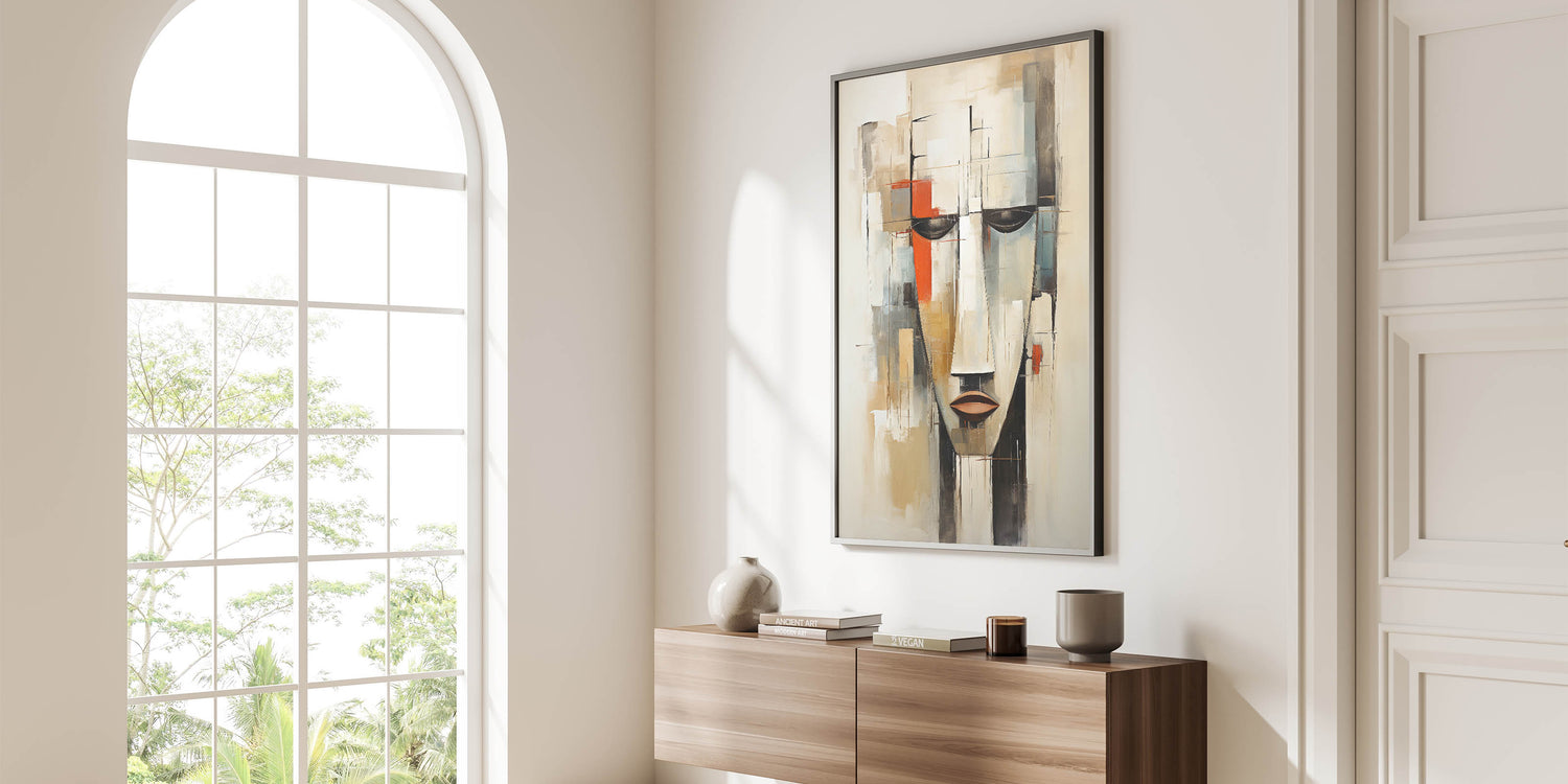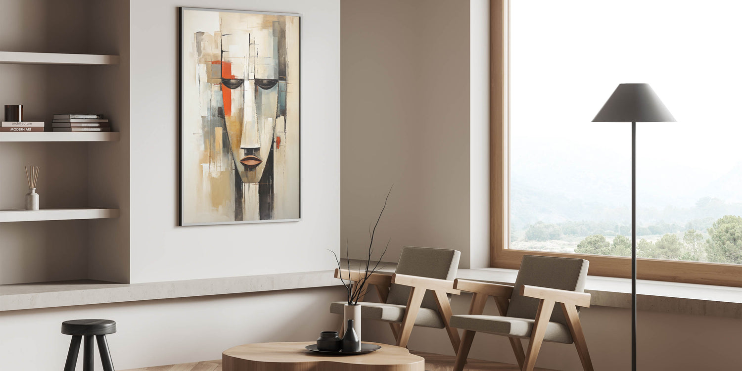 Introducing our Contemporary Abstract Face wall art, a captivating piece that merges modern design with artistic flair. This artwork, featuring a striking abstract face in a palette of neutral tones with bold accents, is sure to be a standout addition to any contemporary space.