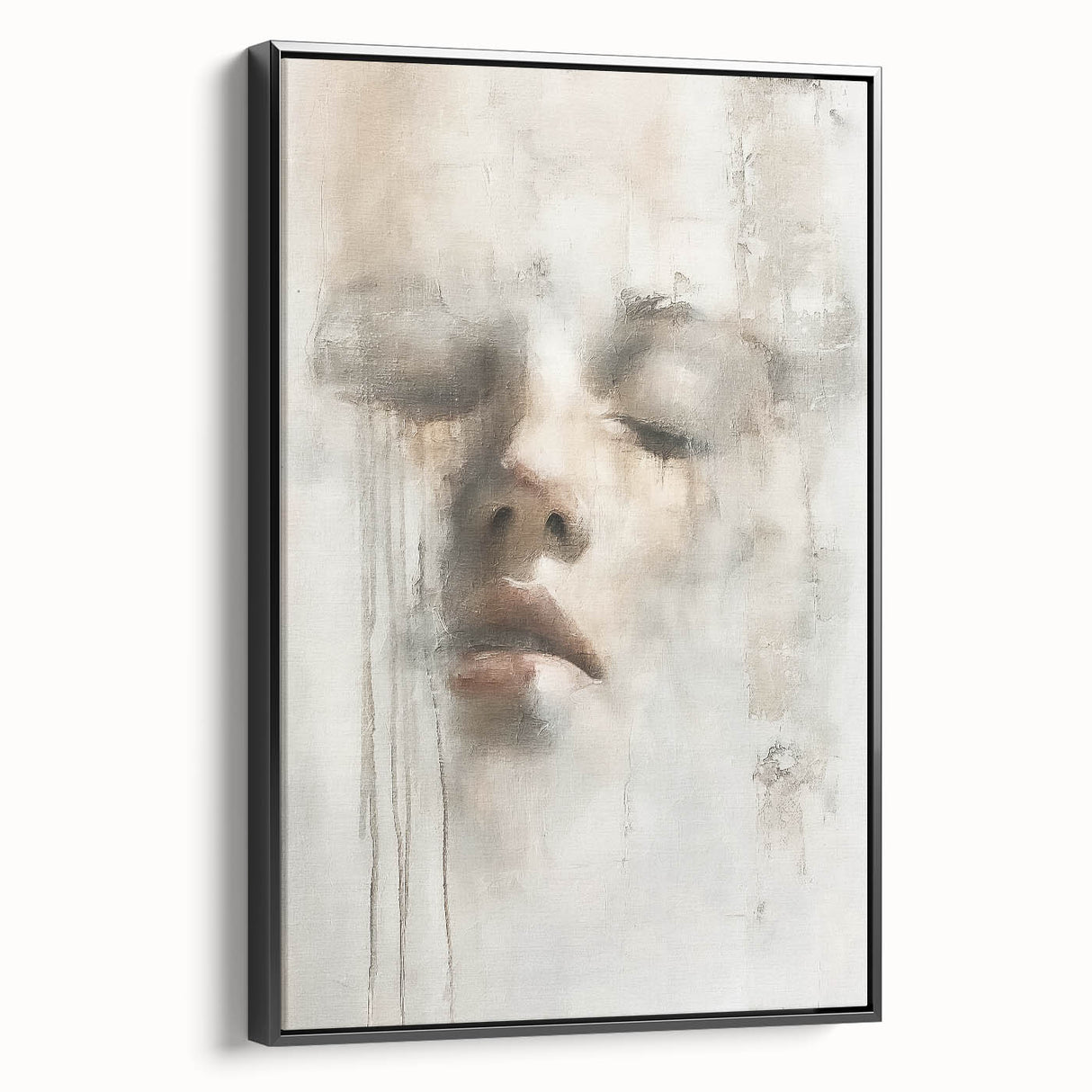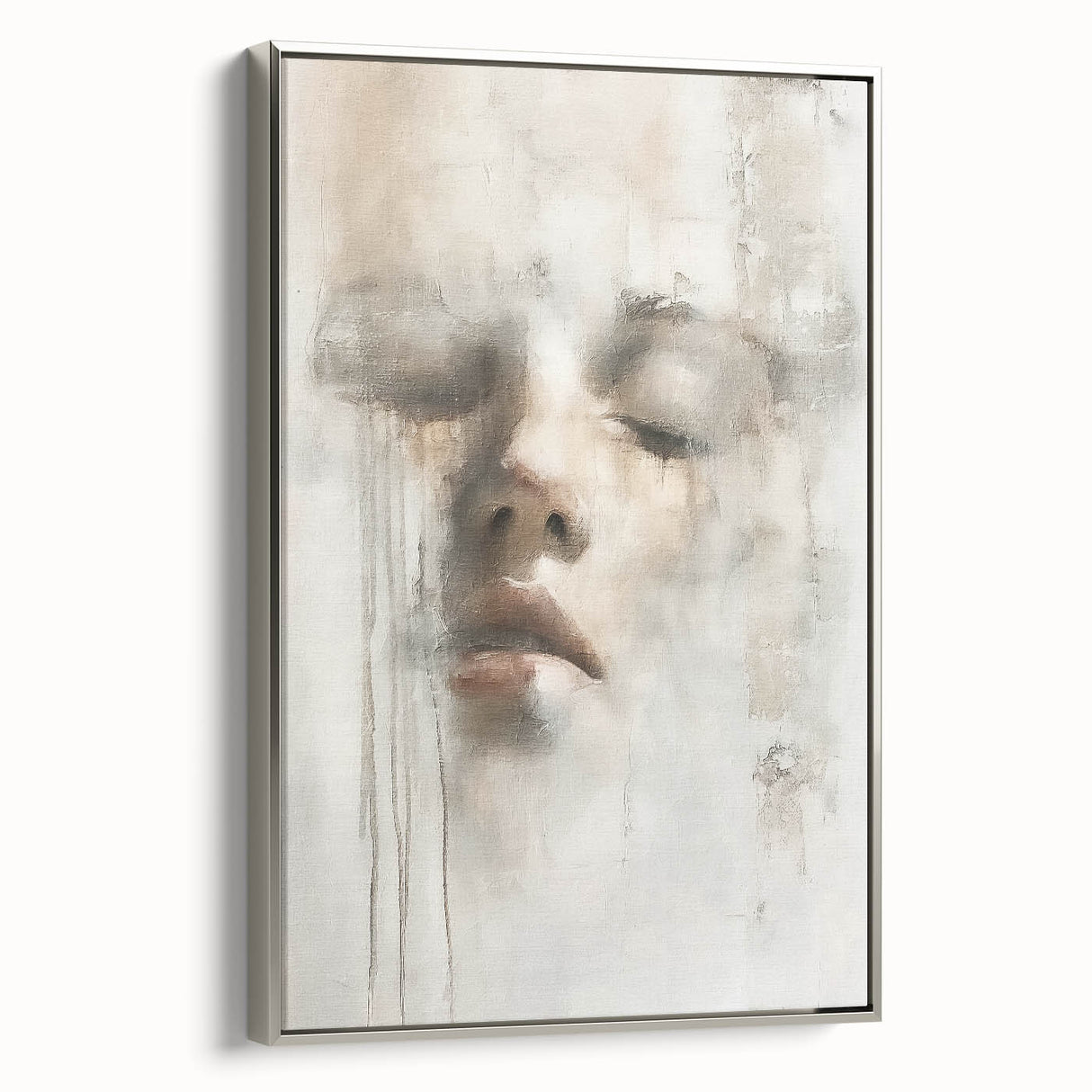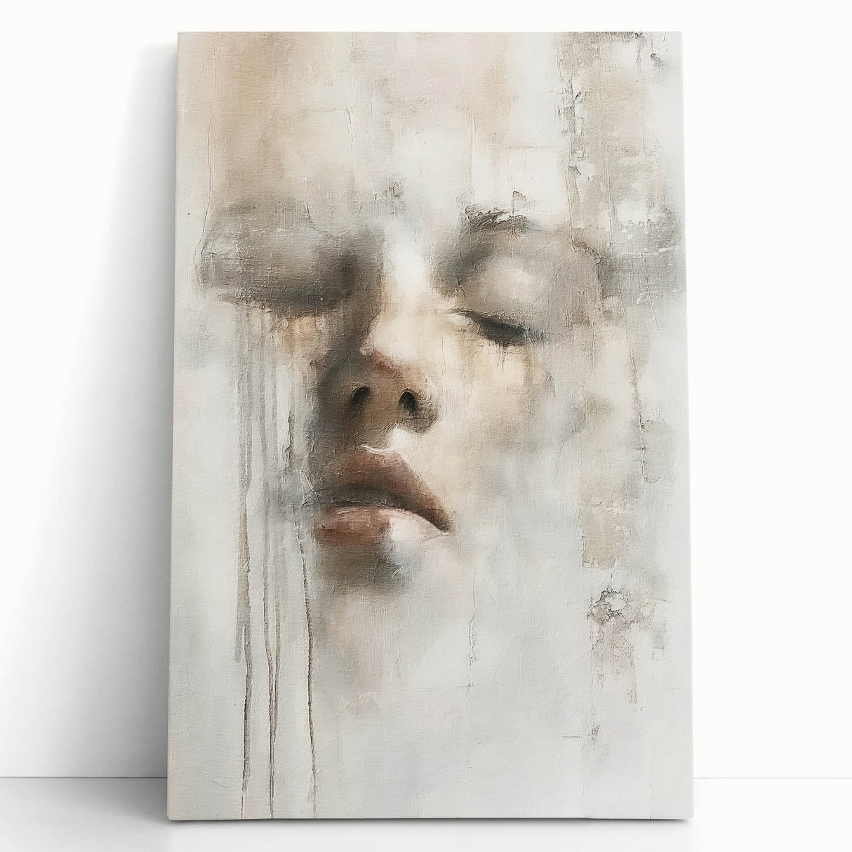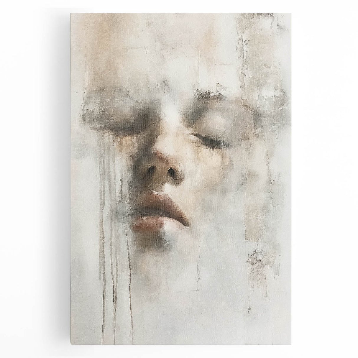 This dreamy abstract figurative canvas from our Abstracts collection brings a sense of calm and introspection to your decor. Featuring a serene face with closed eyes, softly blended in warm neutral tones, this artwork embodies tranquility and elegance. The delicate layering of cream, beige, and light gray tones adds depth, making it a refined choice for contemporary and minimalist interiors.