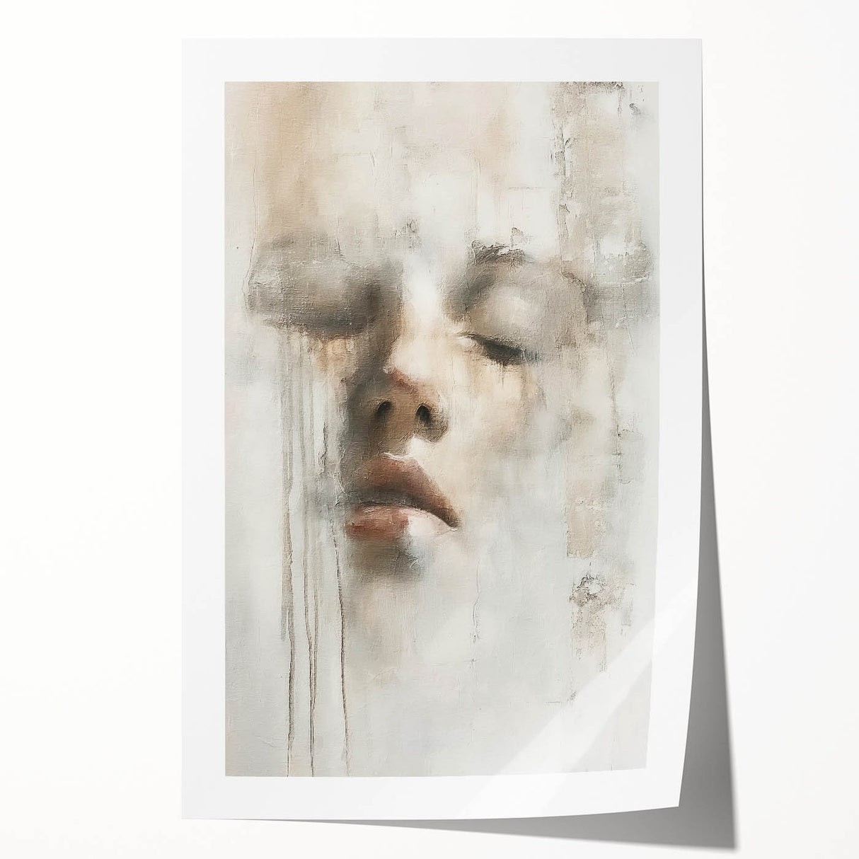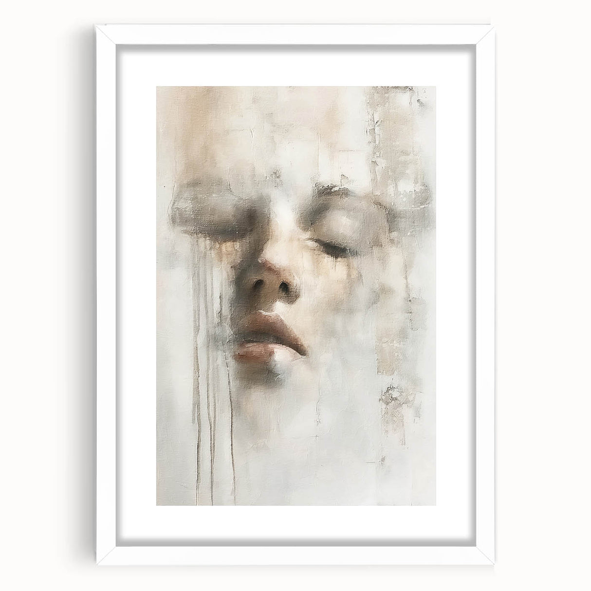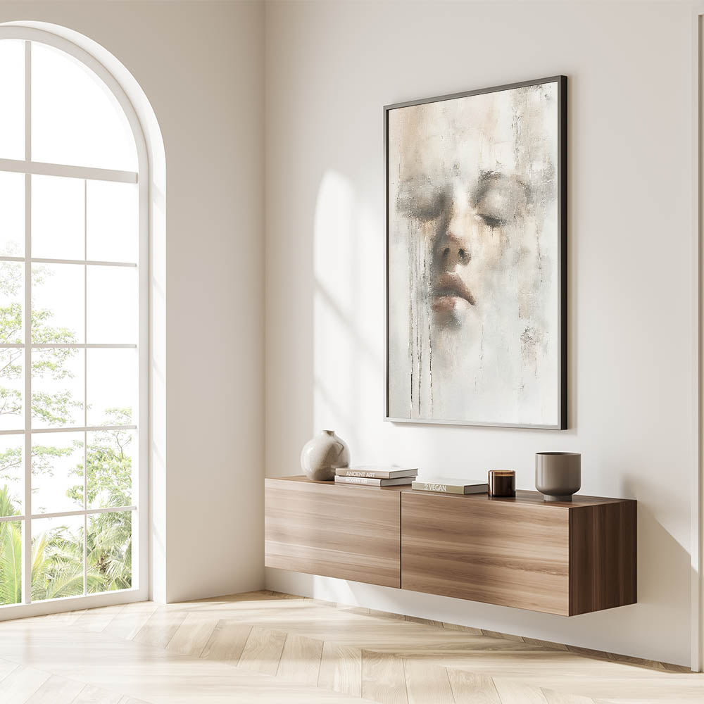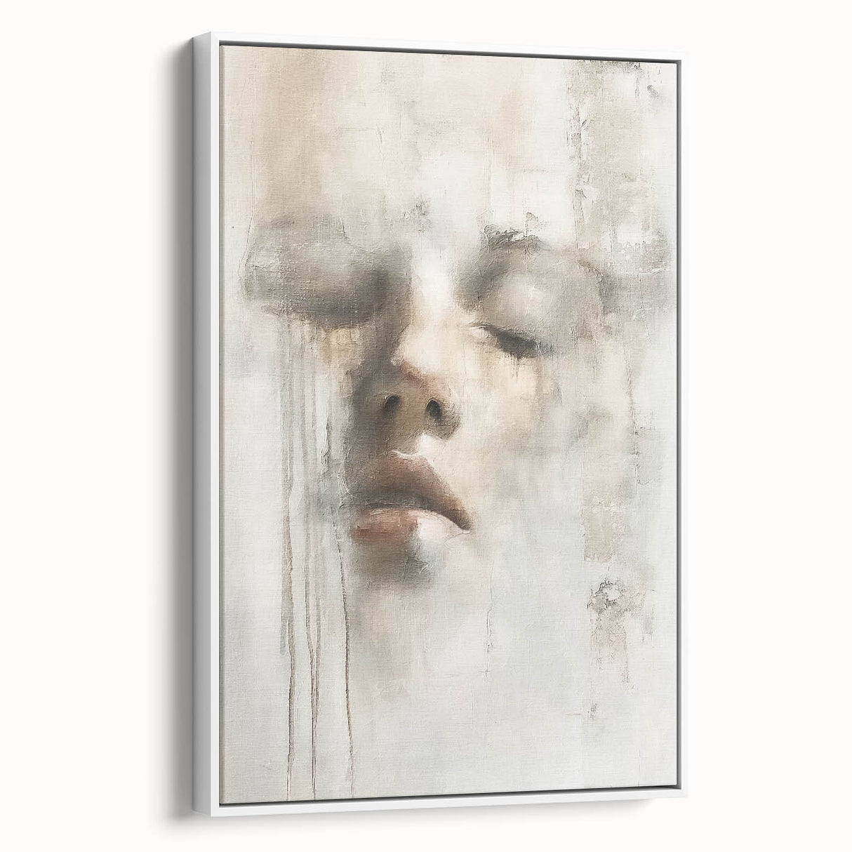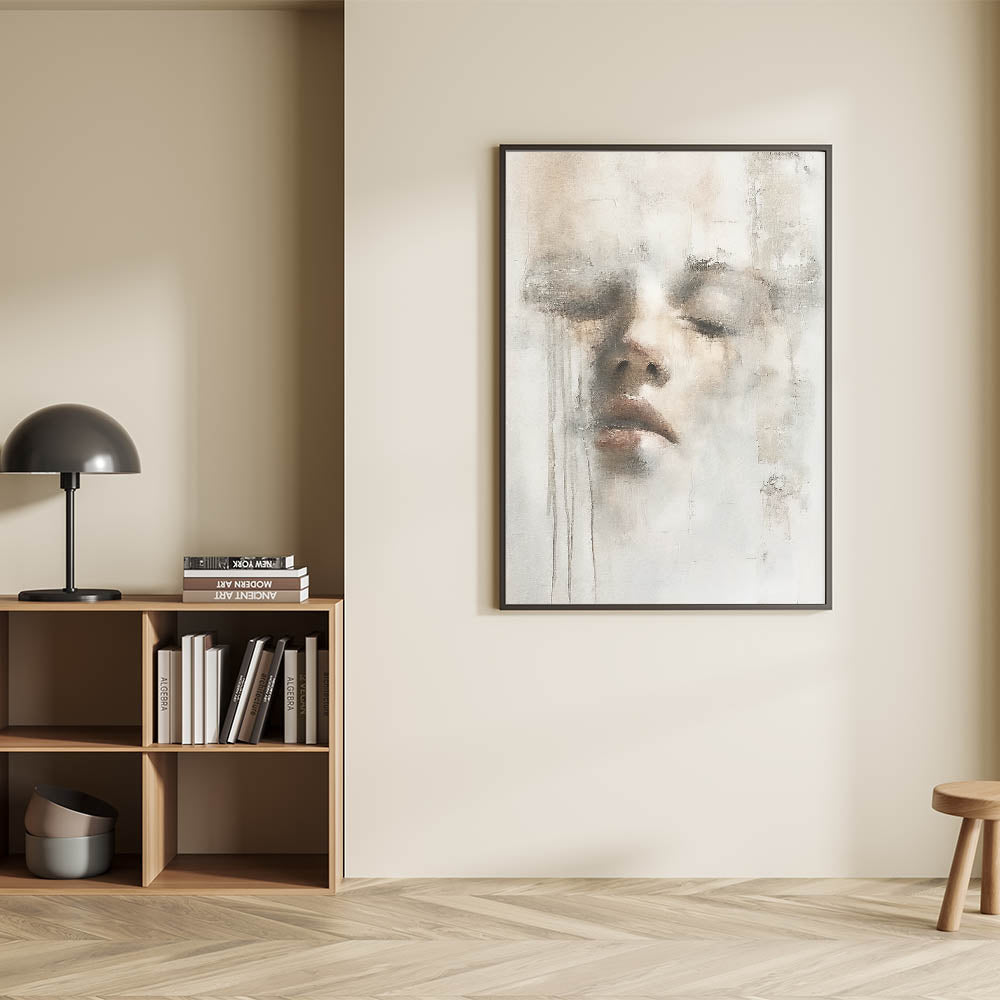 This dreamy abstract figurative canvas from our Abstracts collection brings a sense of calm and introspection to your decor. Featuring a serene face with closed eyes, softly blended in warm neutral tones, this artwork embodies tranquility and elegance. The delicate layering of cream, beige, and light gray tones adds depth, making it a refined choice for contemporary and minimalist interiors.