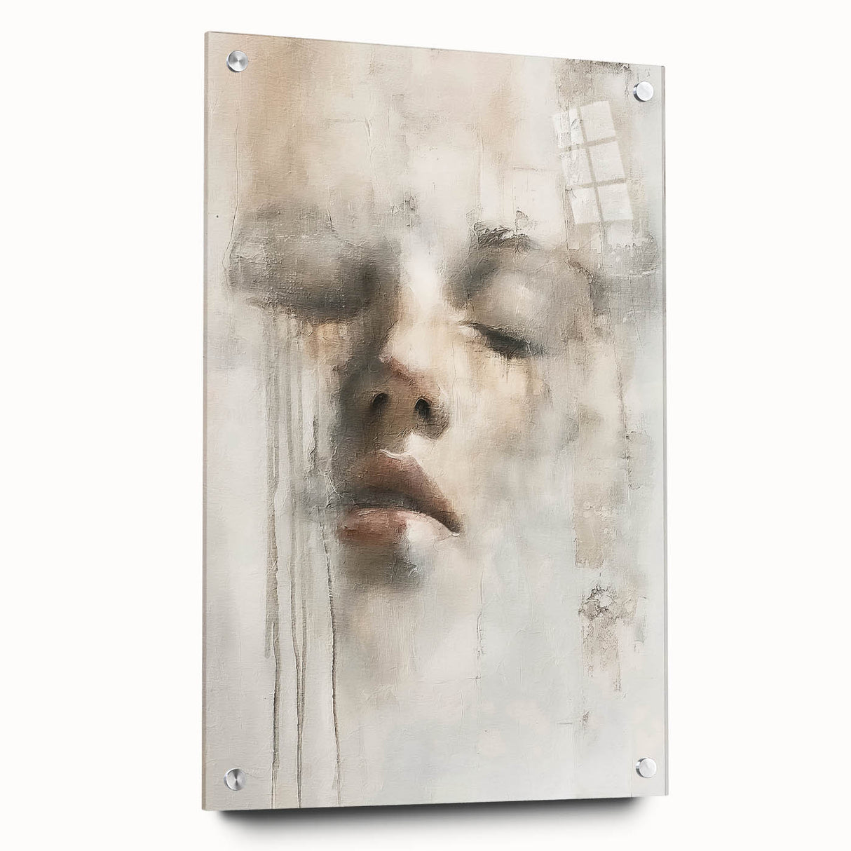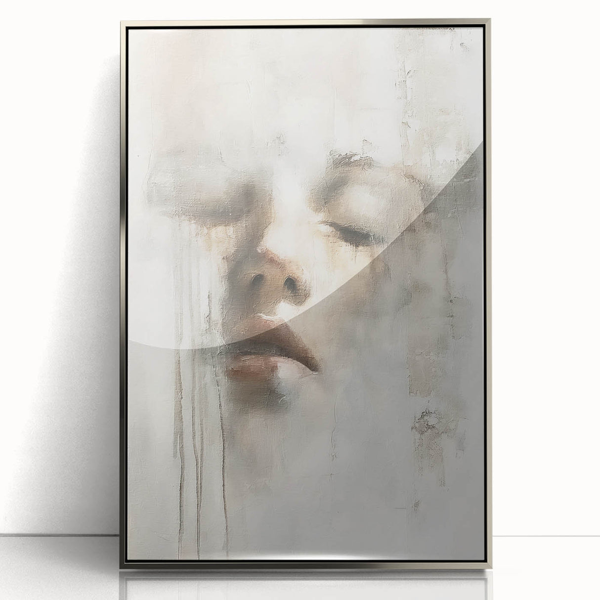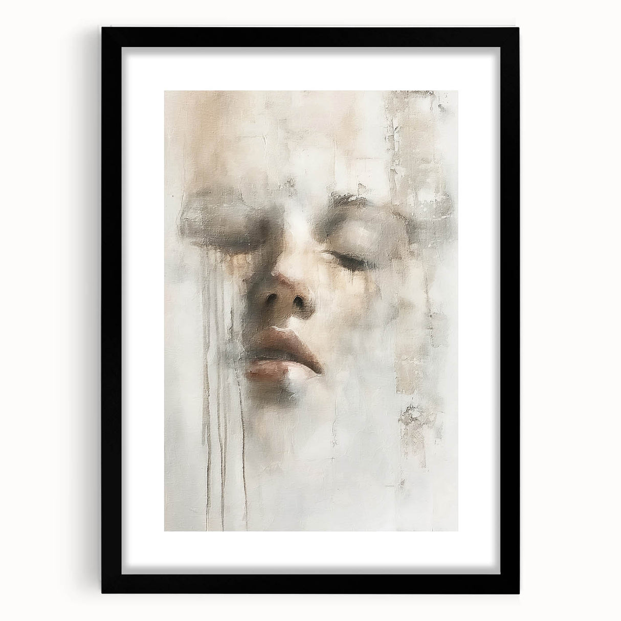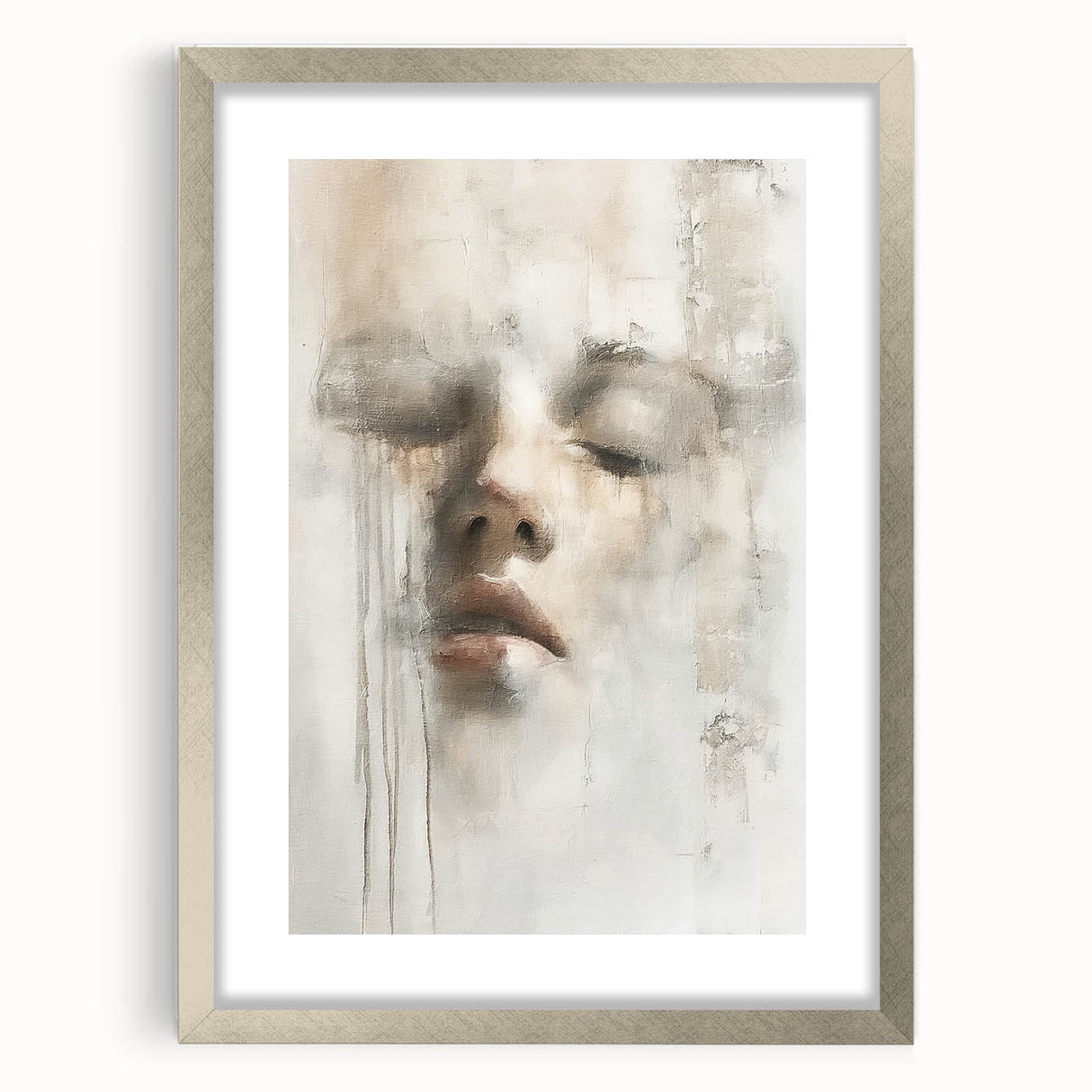 This dreamy abstract figurative canvas from our Abstracts collection brings a sense of calm and introspection to your decor. Featuring a serene face with closed eyes, softly blended in warm neutral tones, this artwork embodies tranquility and elegance. The delicate layering of cream, beige, and light gray tones adds depth, making it a refined choice for contemporary and minimalist interiors.