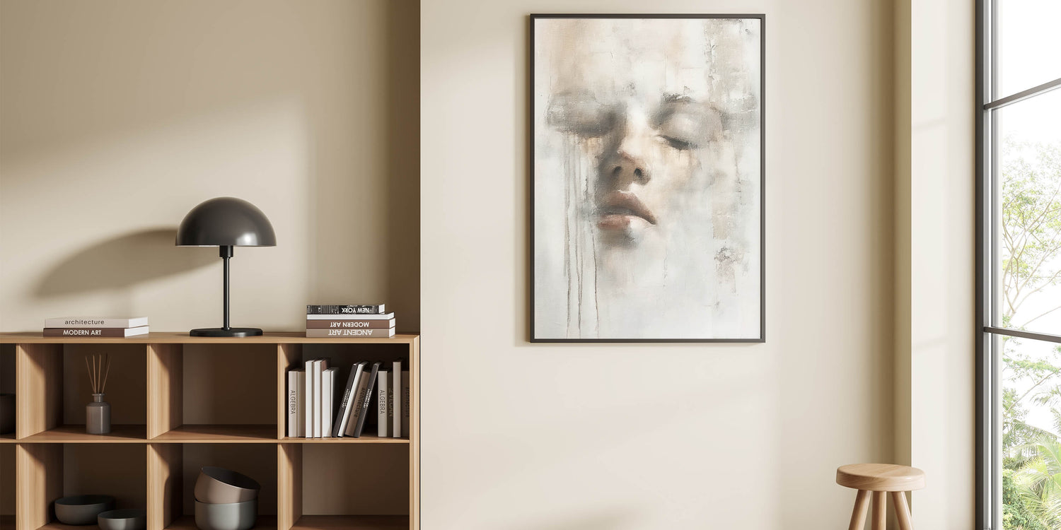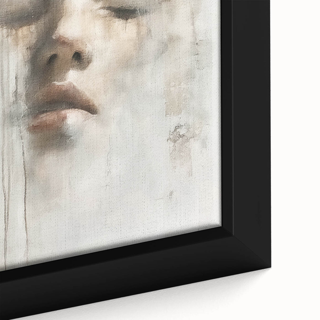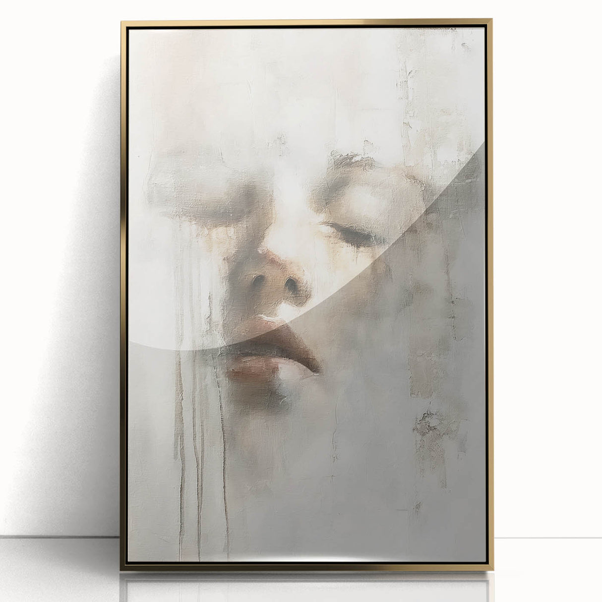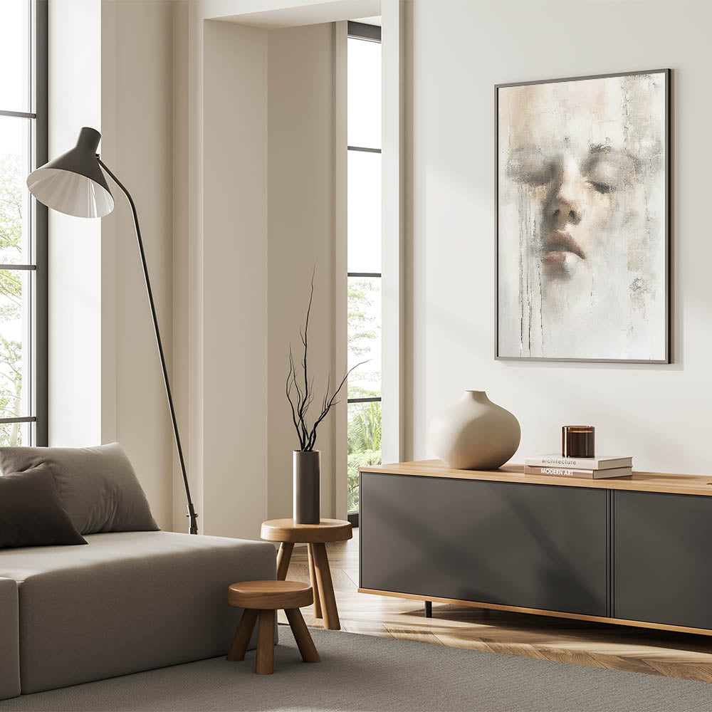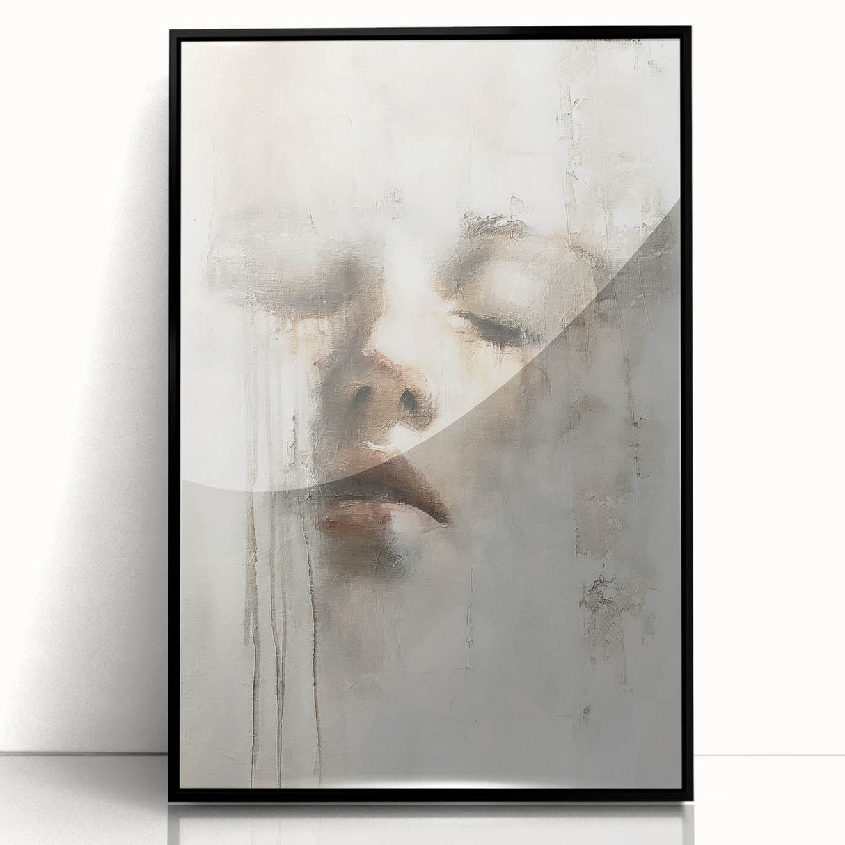 This dreamy abstract figurative canvas from our Abstracts collection brings a sense of calm and introspection to your decor. Featuring a serene face with closed eyes, softly blended in warm neutral tones, this artwork embodies tranquility and elegance. The delicate layering of cream, beige, and light gray tones adds depth, making it a refined choice for contemporary and minimalist interiors.