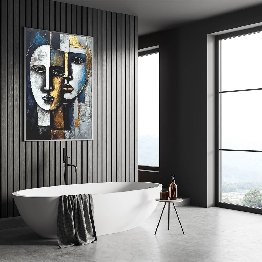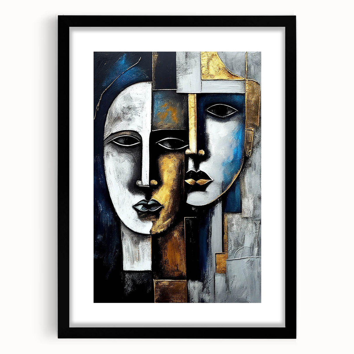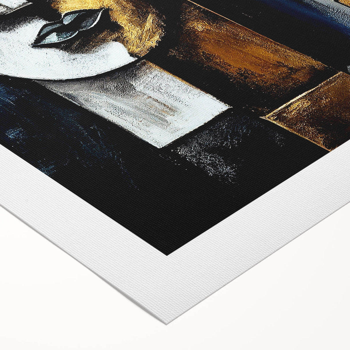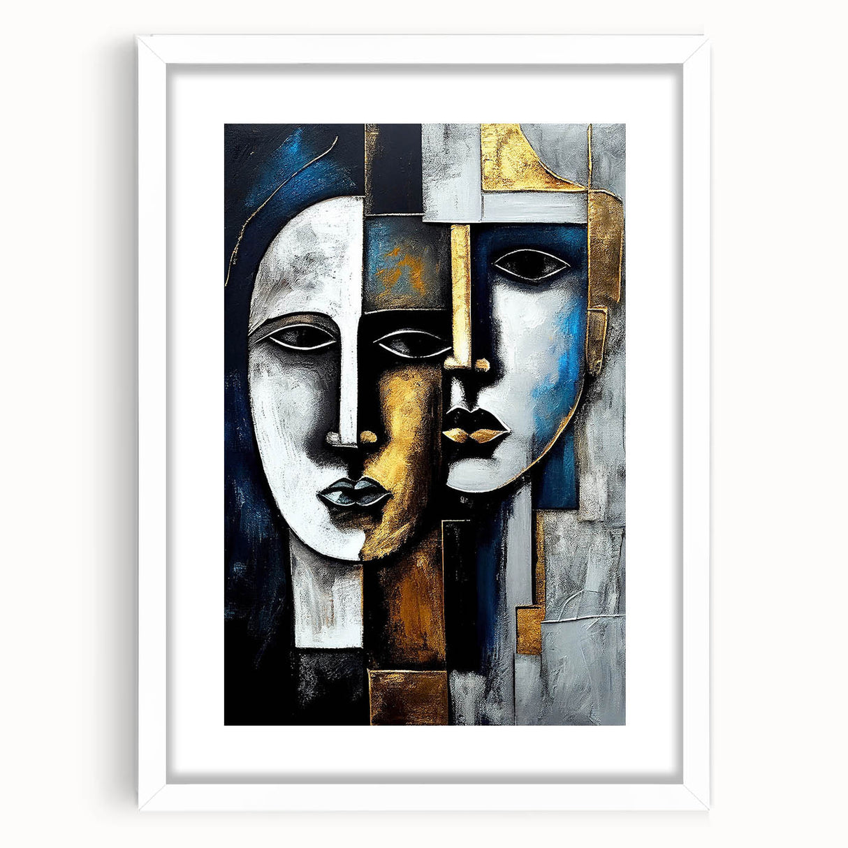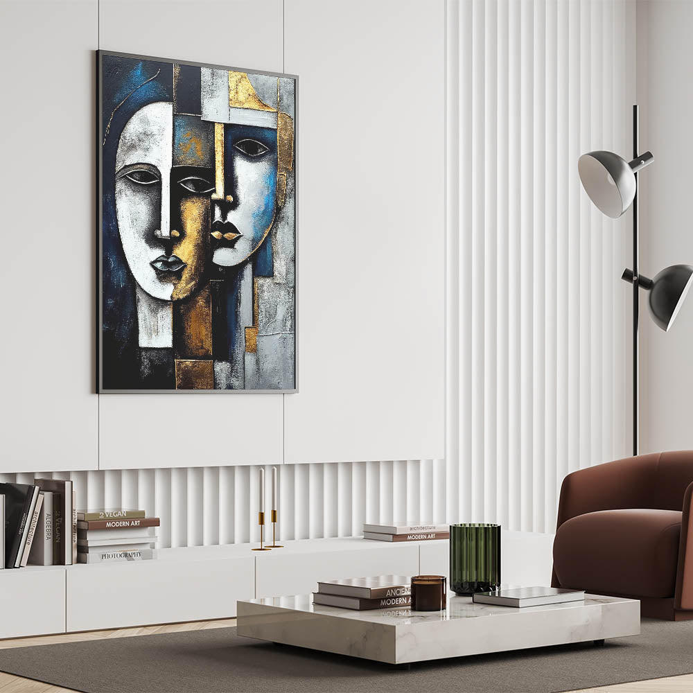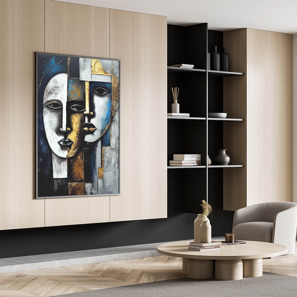 Introducing our Dual Faces in Gold and Blue wall art, a stunning piece that merges modern geometric design with abstract figurative art. This artwork features two faces intertwined, rendered in a luxurious palette of gold, blue, and black, creating a captivating and sophisticated visual impact.