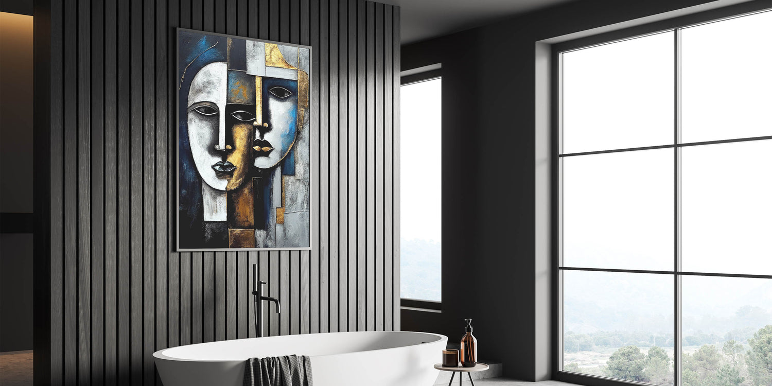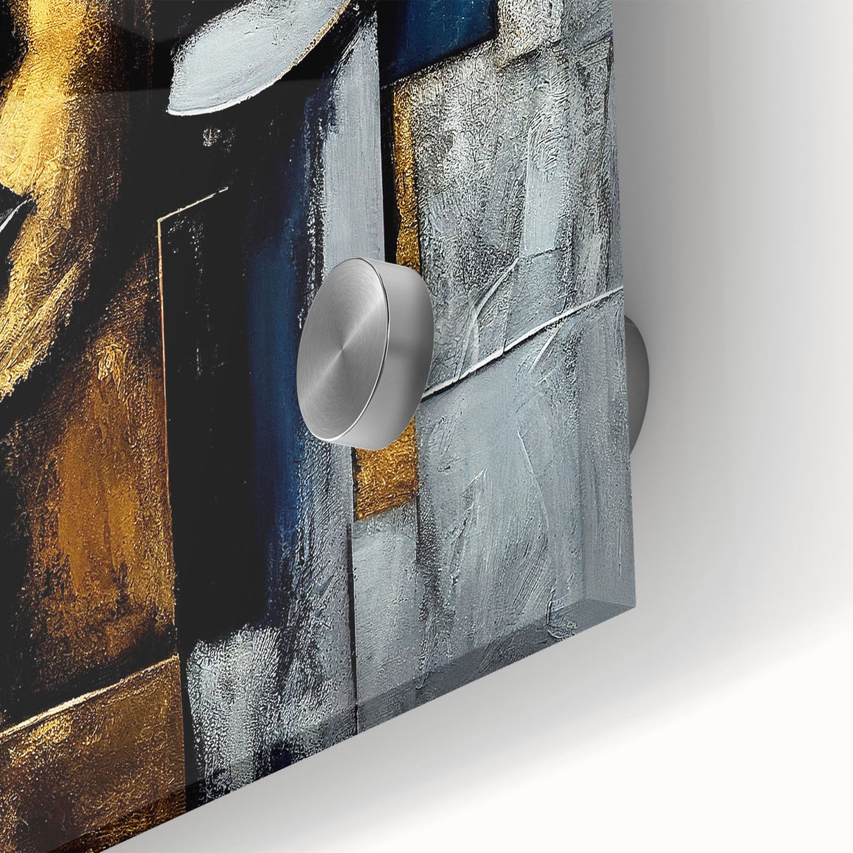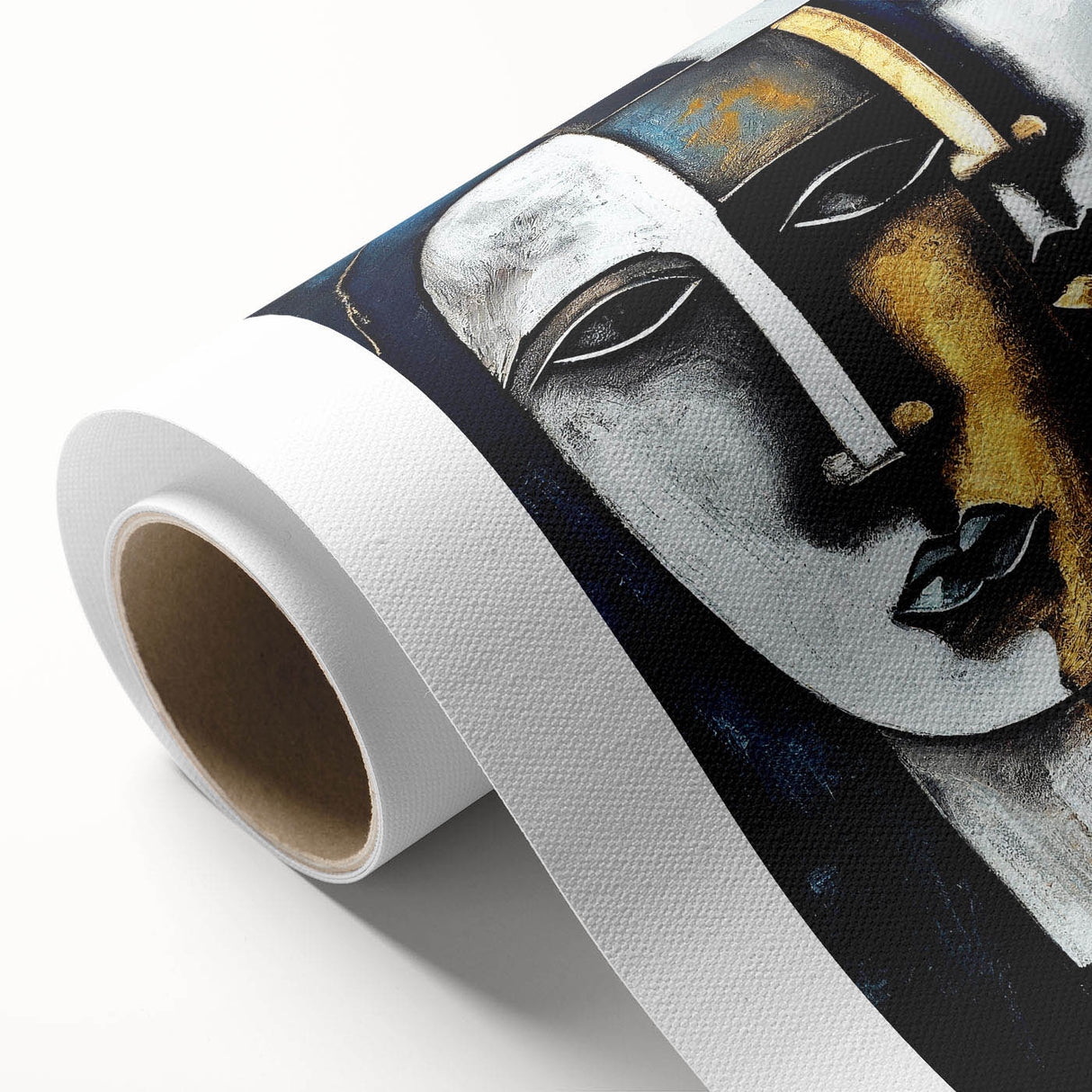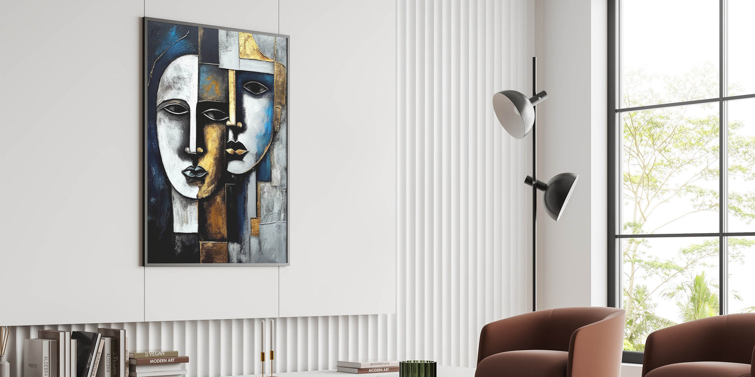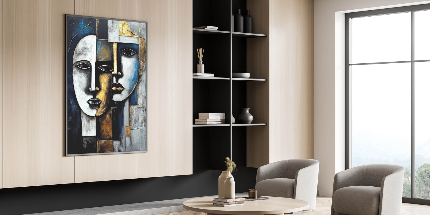 Introducing our Dual Faces in Gold and Blue wall art, a stunning piece that merges modern geometric design with abstract figurative art. This artwork features two faces intertwined, rendered in a luxurious palette of gold, blue, and black, creating a captivating and sophisticated visual impact.