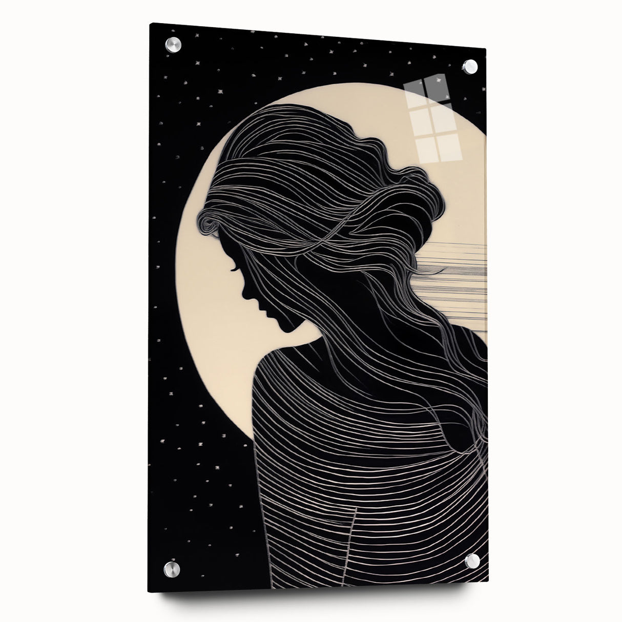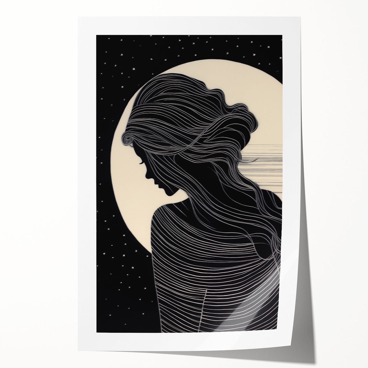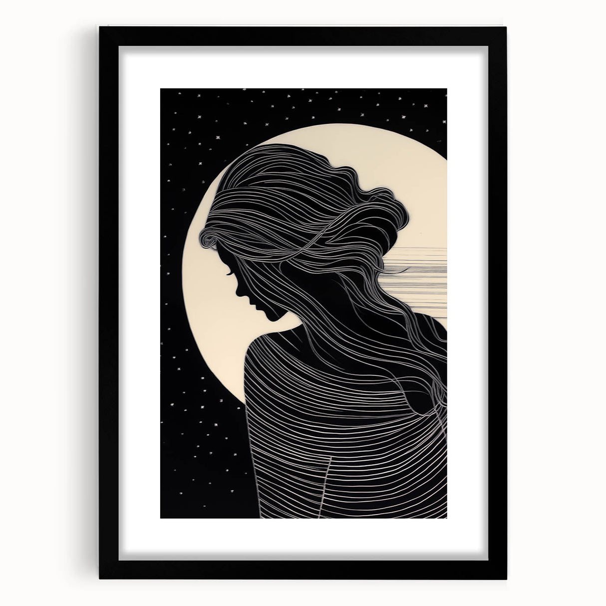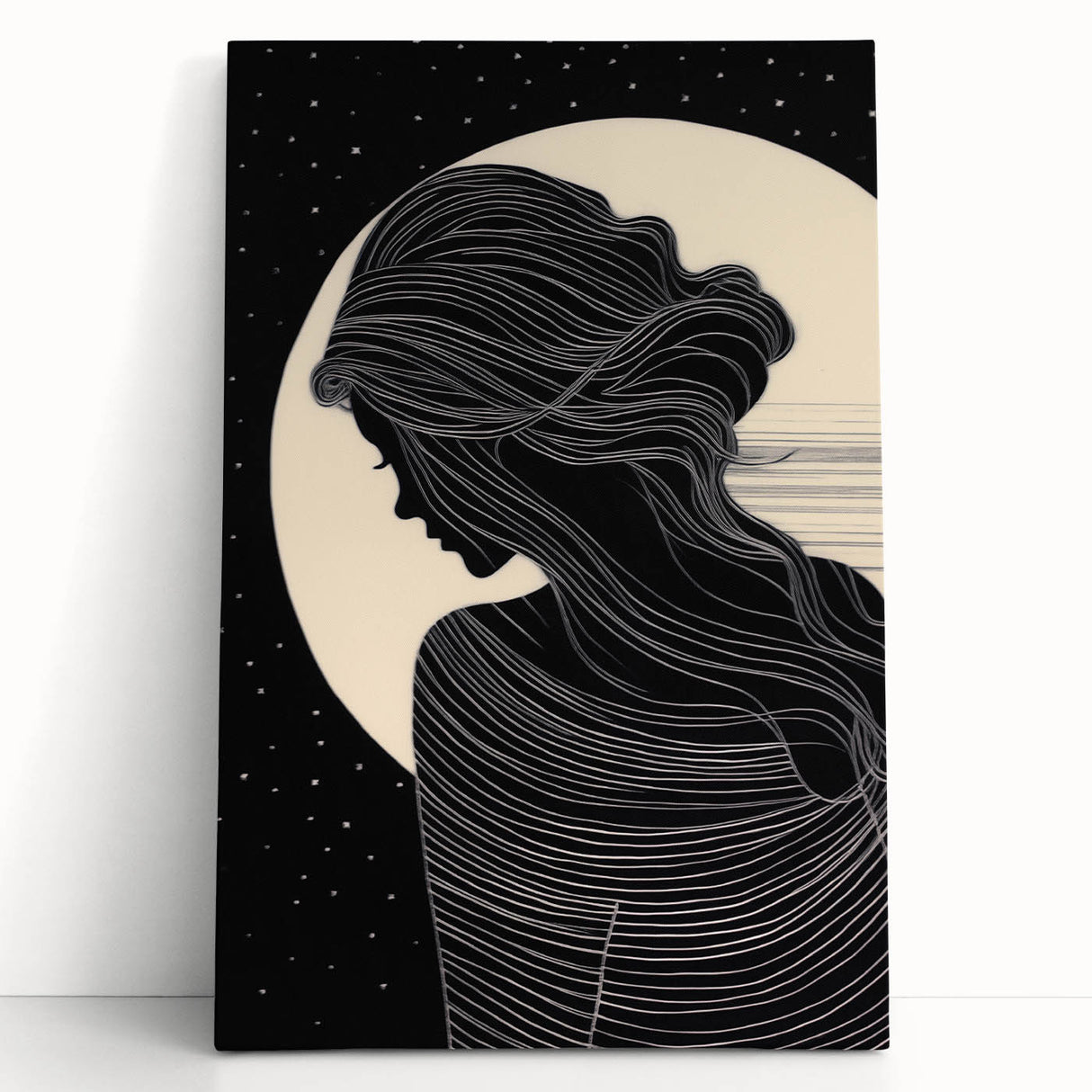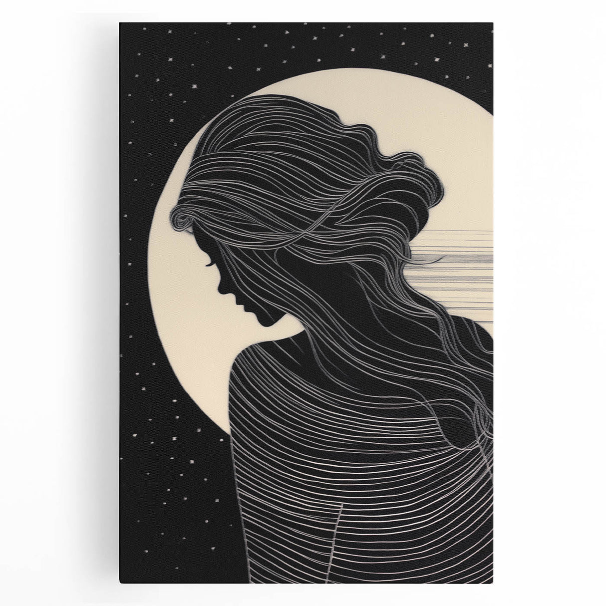 Add a touch of elegance and mystique to your space with our Elegant Abstract Moonlit Silhouette Art. This stunning piece features a serene silhouette of a woman against a full moon, rendered in striking black and white tones. The intricate lines and starry background create a mesmerizing visual effect that draws the viewer in. Perfect for modern interiors, this artwork brings a sense of tranquility and sophistication to any room.
