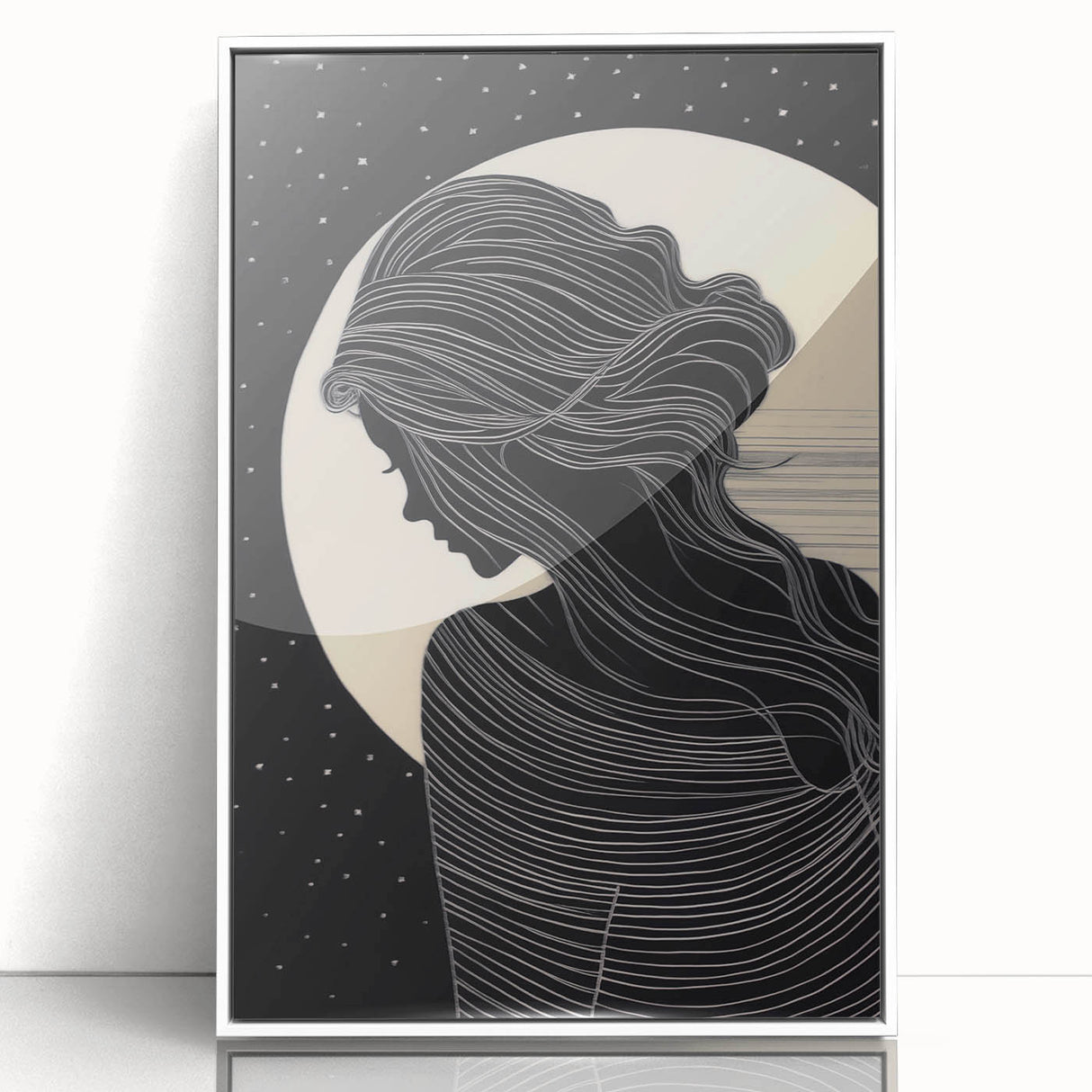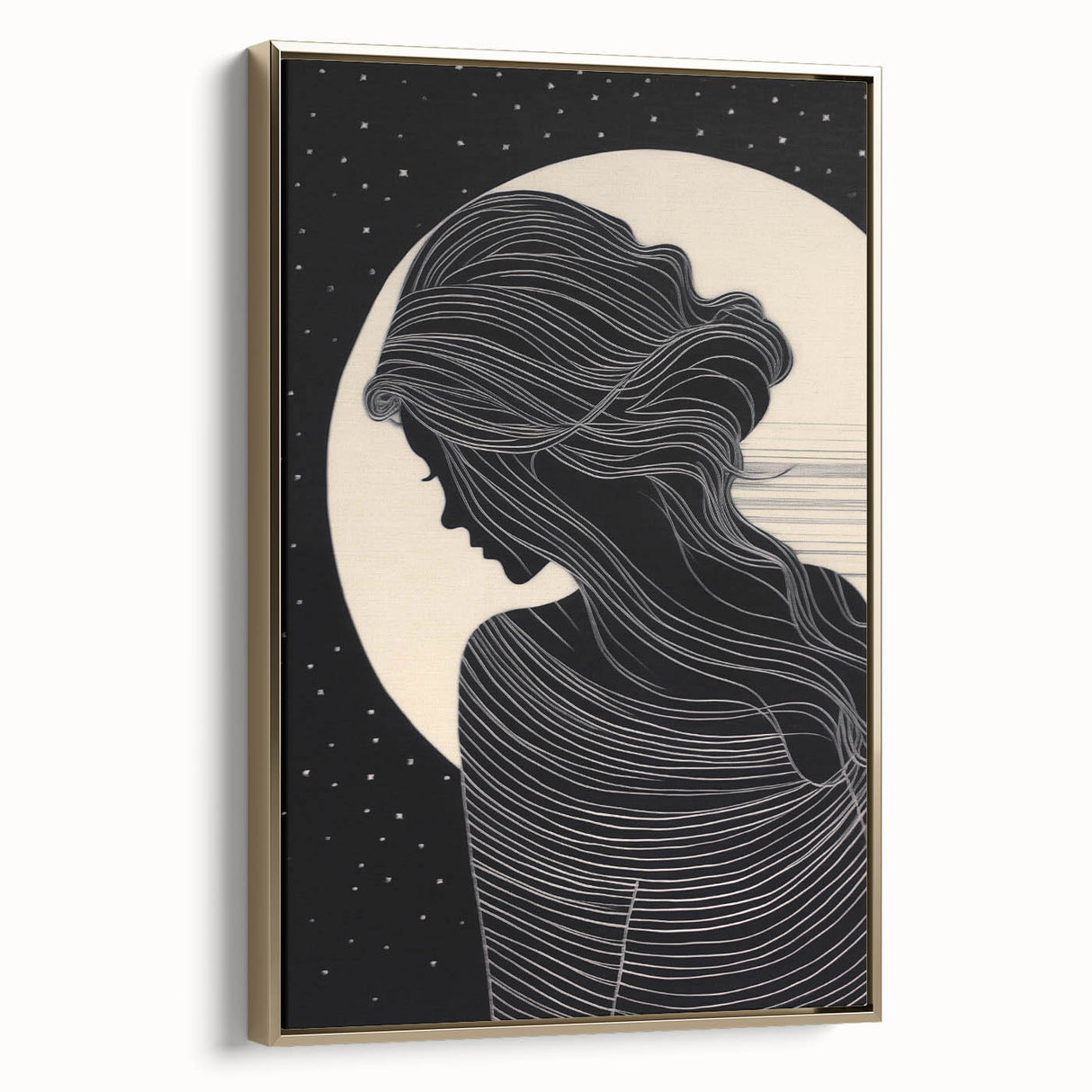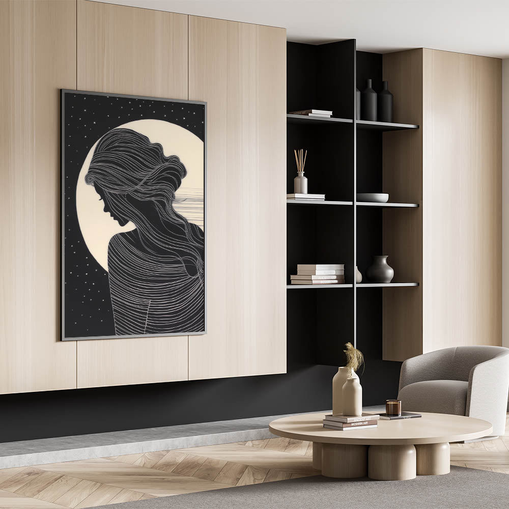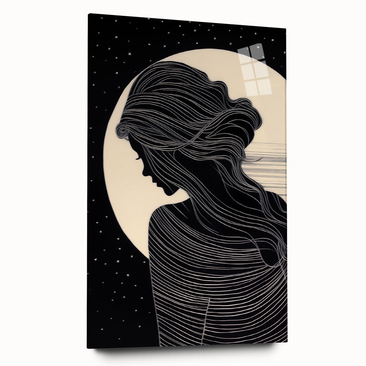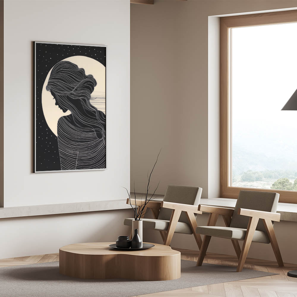 Add a touch of elegance and mystique to your space with our Elegant Abstract Moonlit Silhouette Art. This stunning piece features a serene silhouette of a woman against a full moon, rendered in striking black and white tones. The intricate lines and starry background create a mesmerizing visual effect that draws the viewer in. Perfect for modern interiors, this artwork brings a sense of tranquility and sophistication to any room.