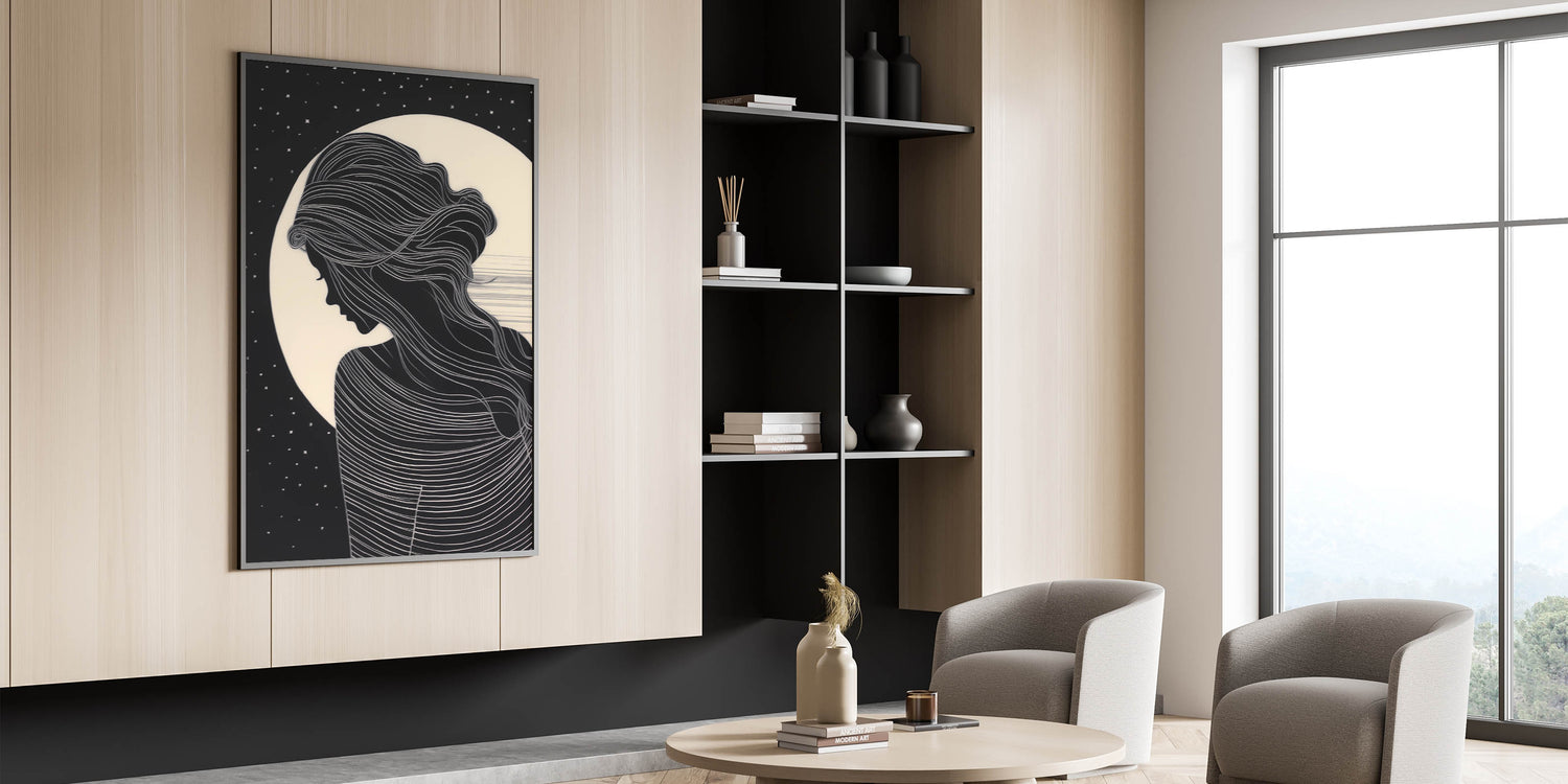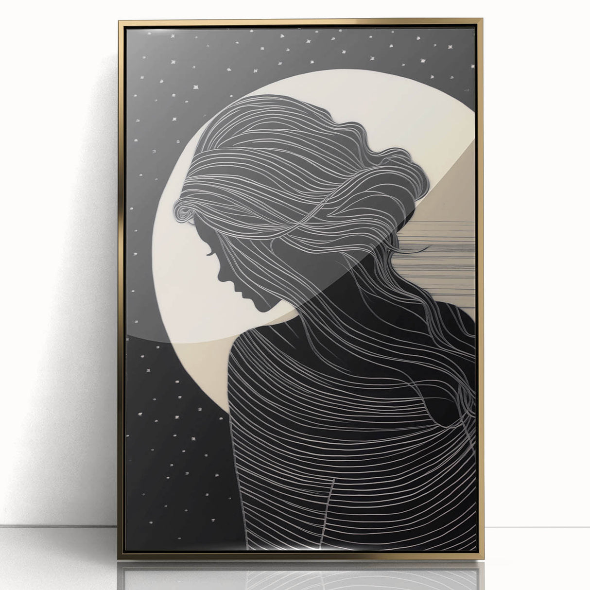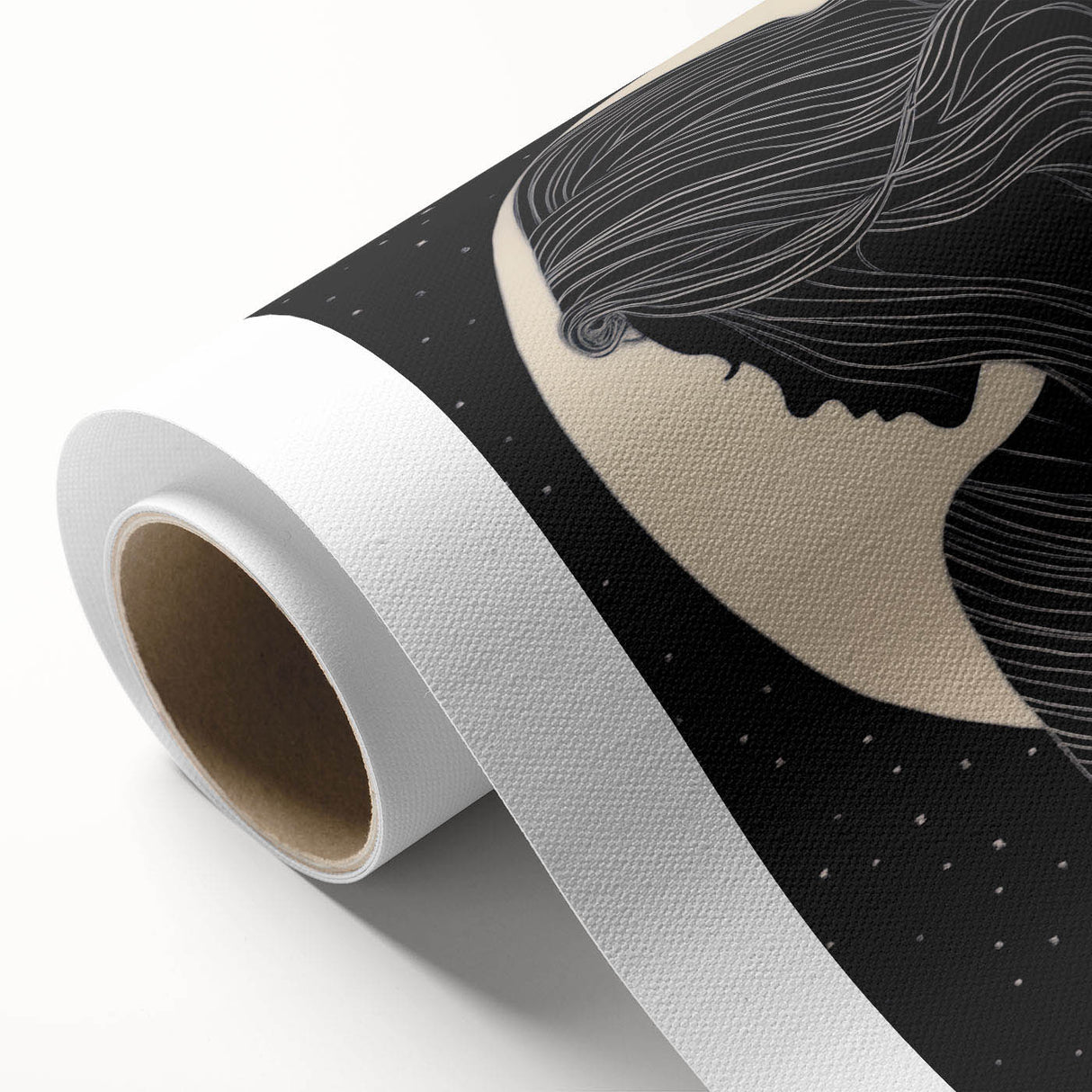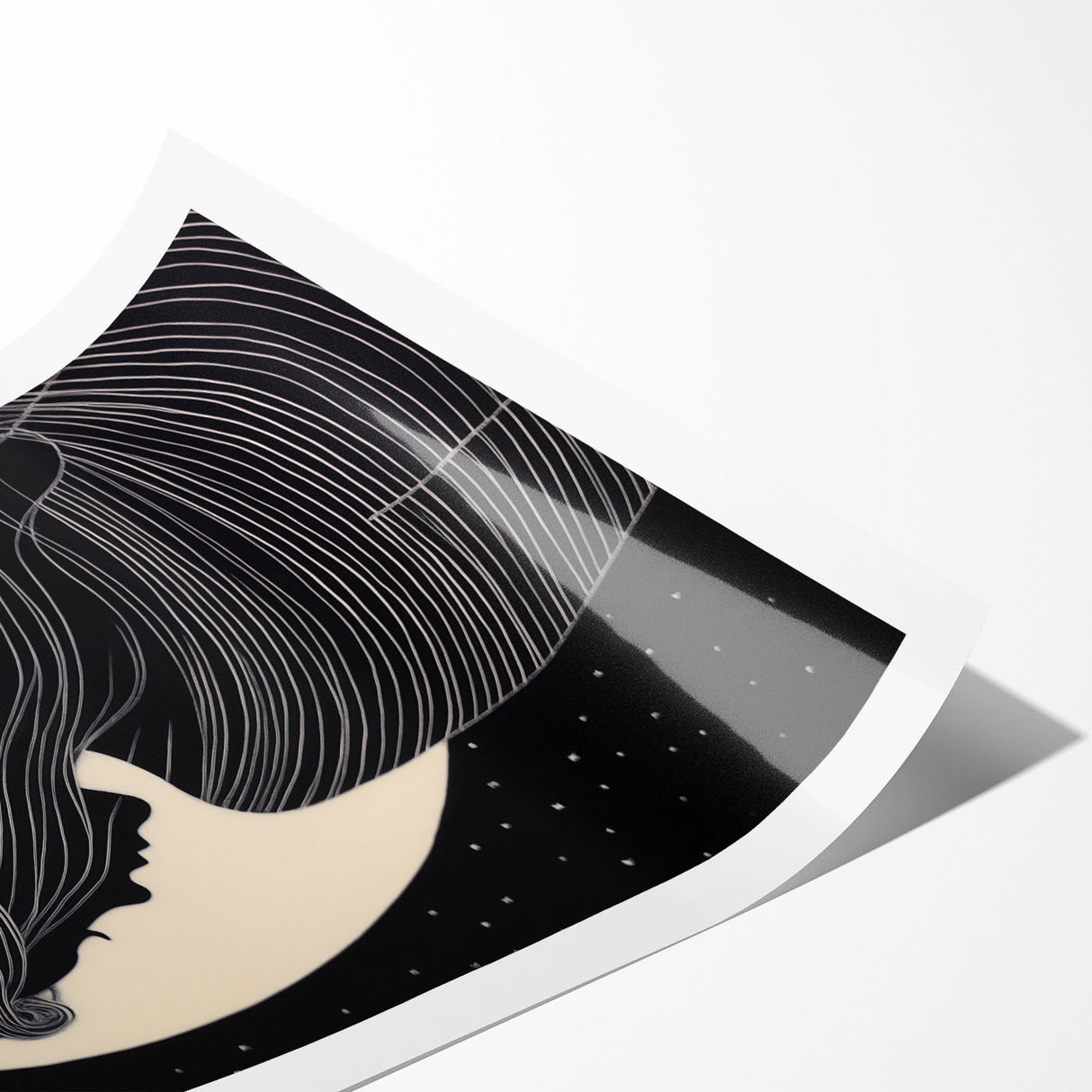 Add a touch of elegance and mystique to your space with our Elegant Abstract Moonlit Silhouette Art. This stunning piece features a serene silhouette of a woman against a full moon, rendered in striking black and white tones. The intricate lines and starry background create a mesmerizing visual effect that draws the viewer in. Perfect for modern interiors, this artwork brings a sense of tranquility and sophistication to any room.