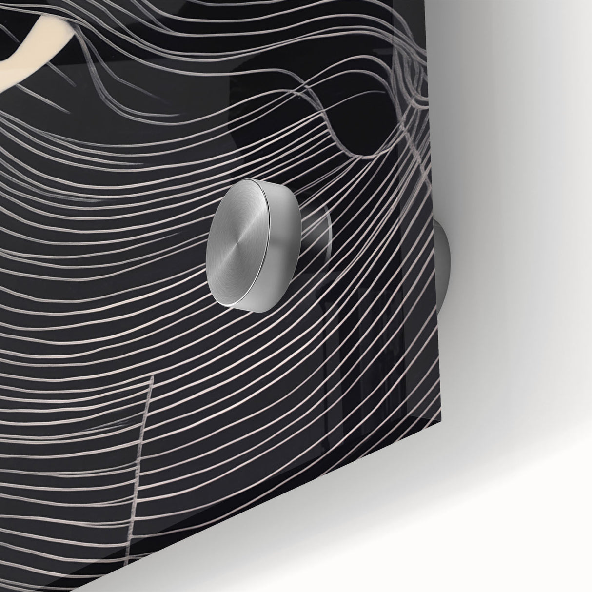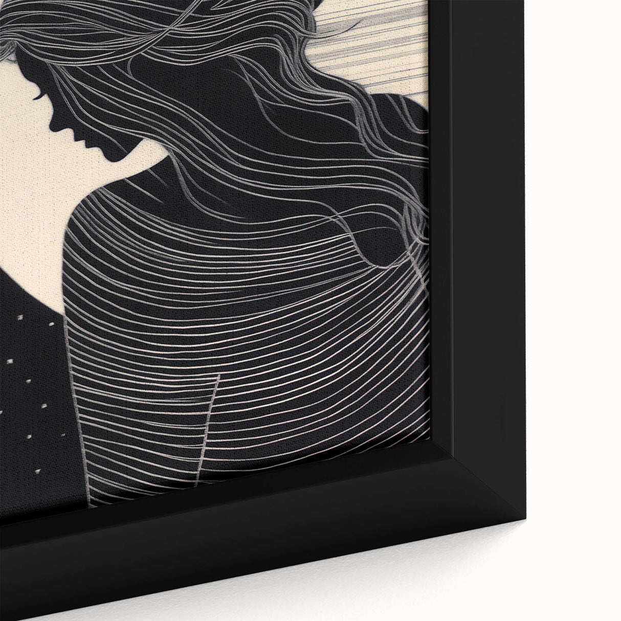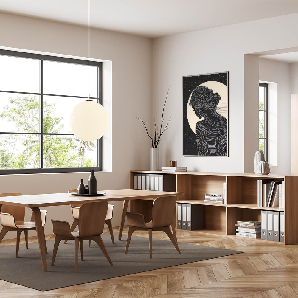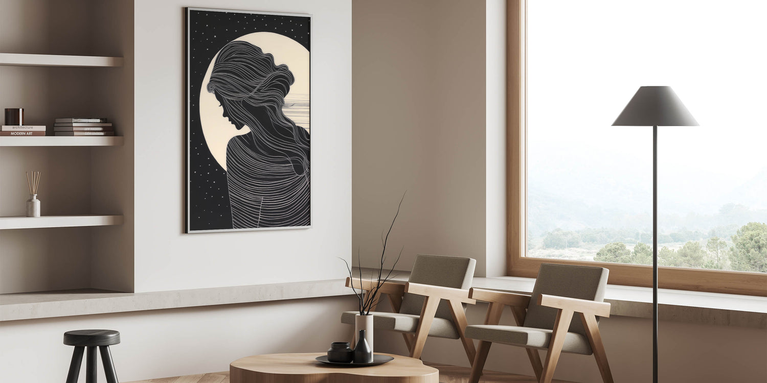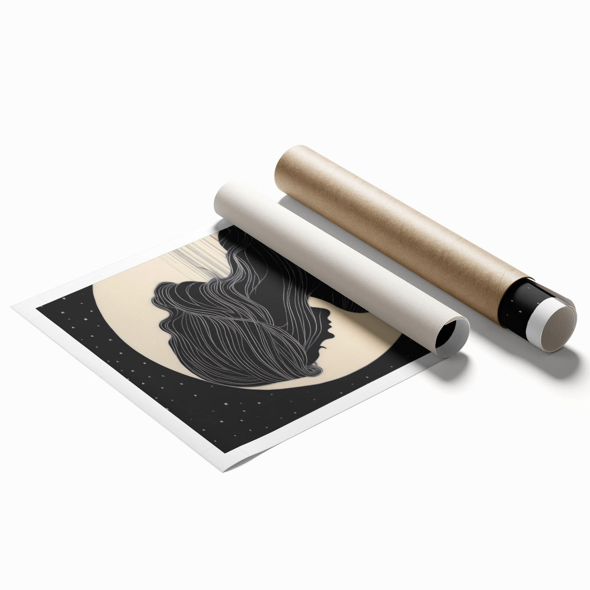 Add a touch of elegance and mystique to your space with our Elegant Abstract Moonlit Silhouette Art. This stunning piece features a serene silhouette of a woman against a full moon, rendered in striking black and white tones. The intricate lines and starry background create a mesmerizing visual effect that draws the viewer in. Perfect for modern interiors, this artwork brings a sense of tranquility and sophistication to any room.