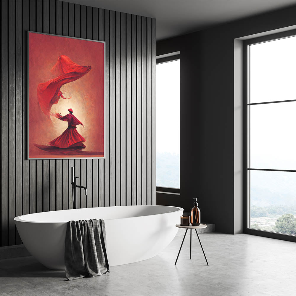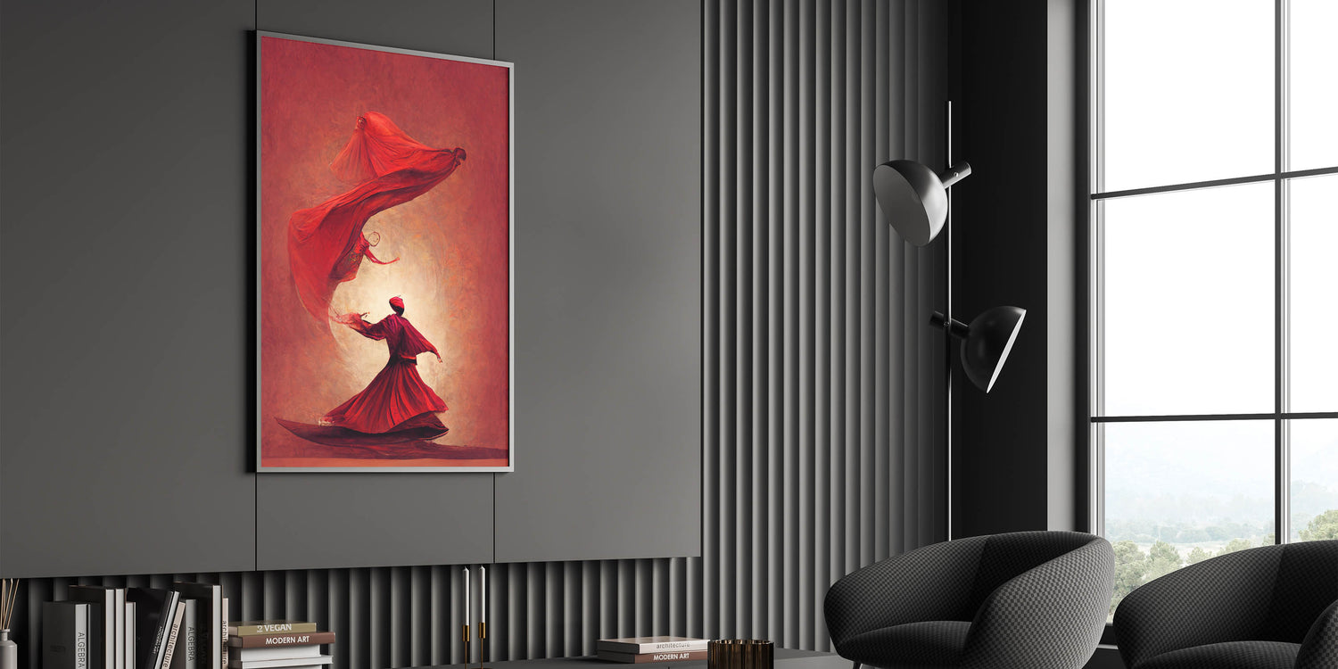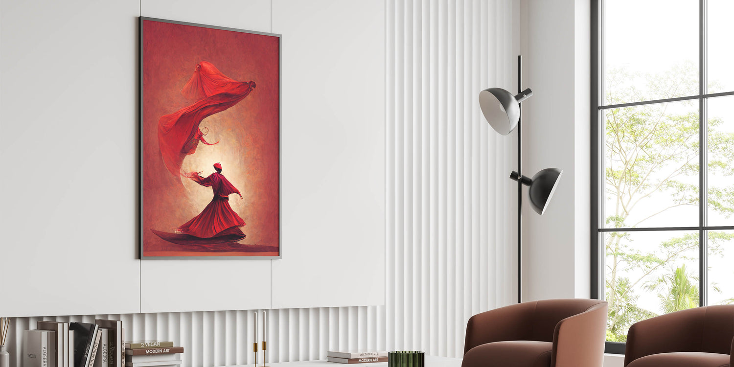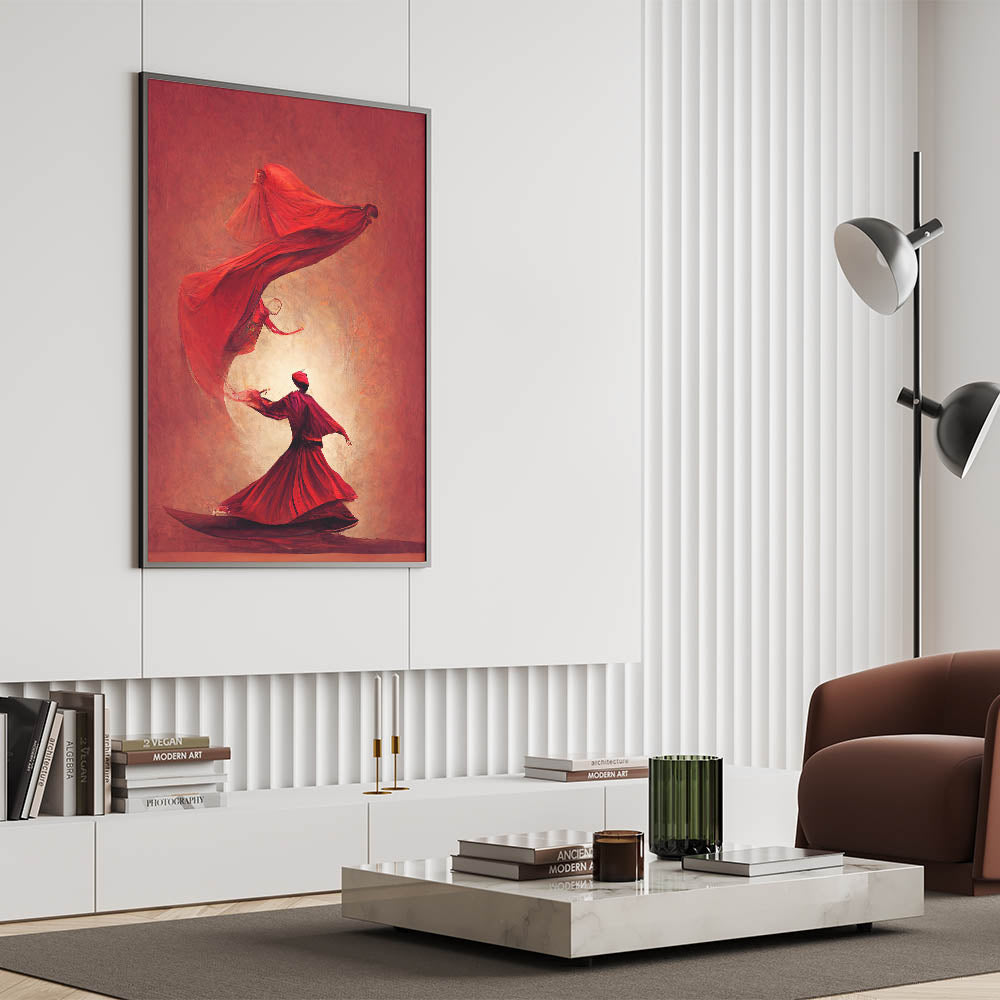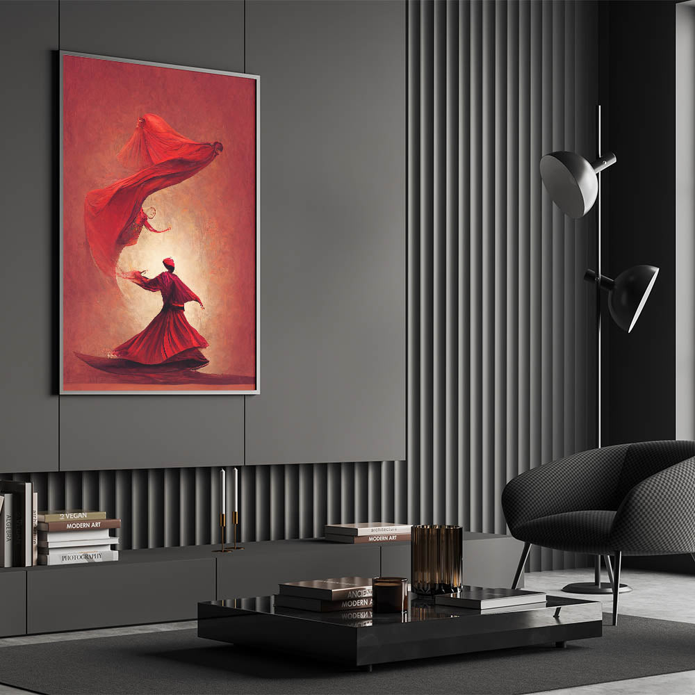 This fiery red abstract art piece captures the passionate movement of figures in a mesmerizing dance. The flowing forms and bold shades of red convey energy, power, and elegance, creating a sense of warmth and intensity. Each figure, beautifully rendered in flowing robes, appears to float in rhythmic harmony, evoking themes of spirituality and inner strength. This artwork is perfect for spaces that seek to make a bold, artistic statement.
