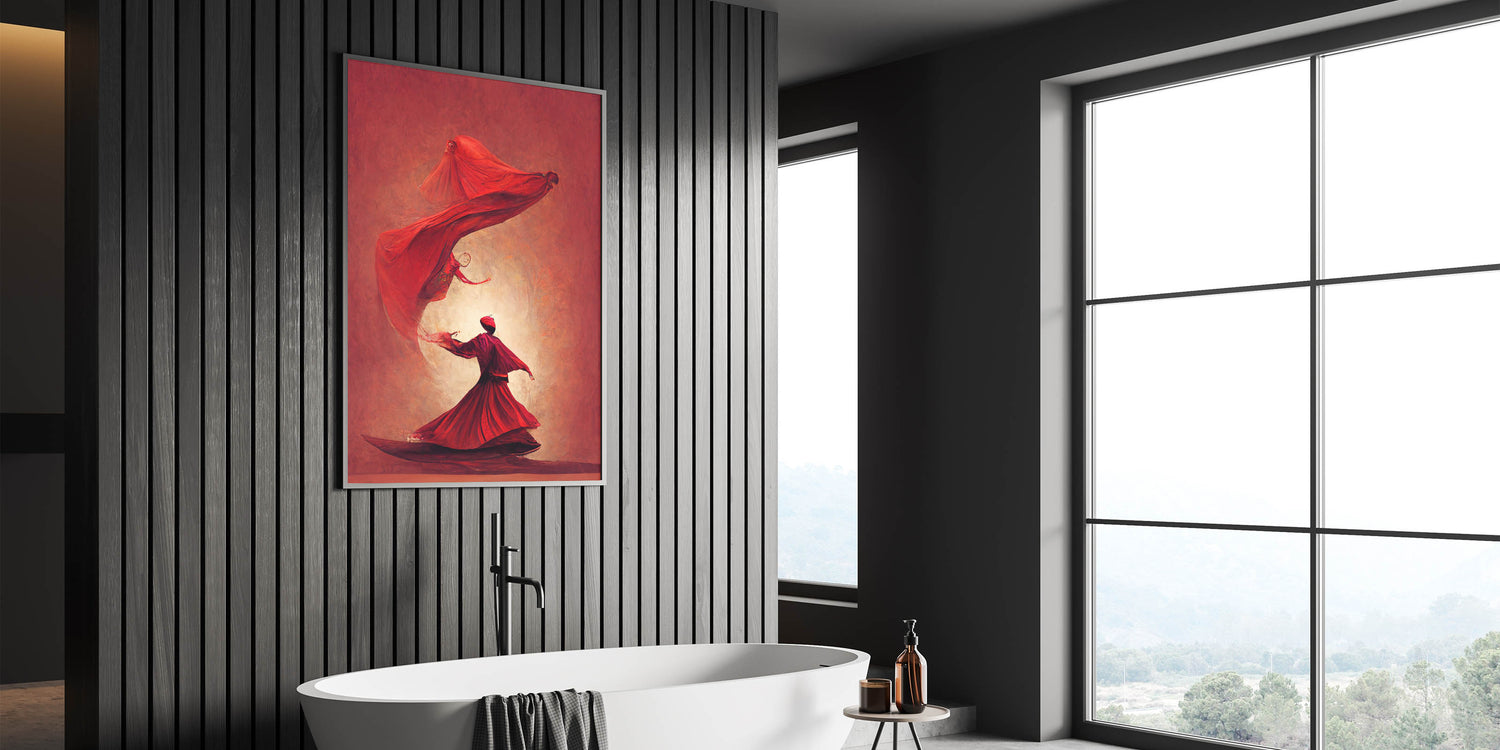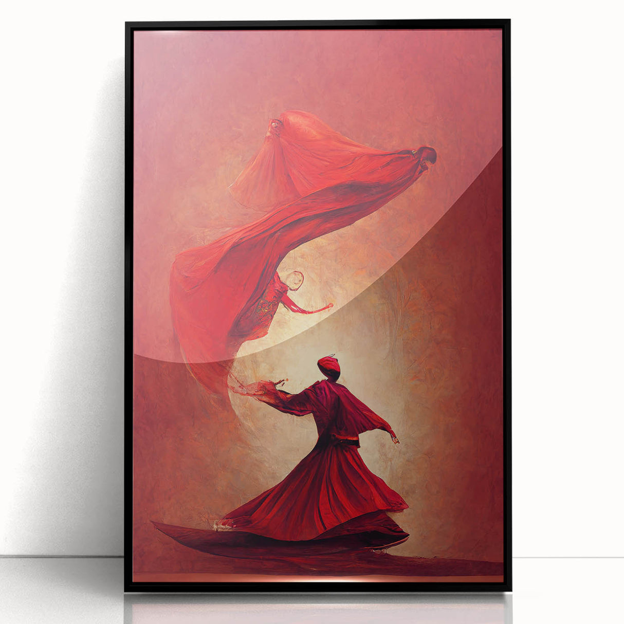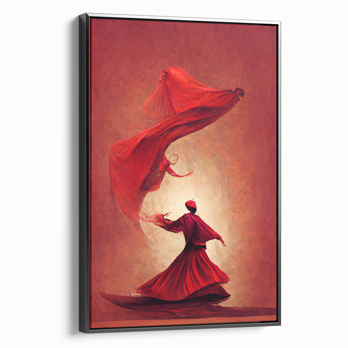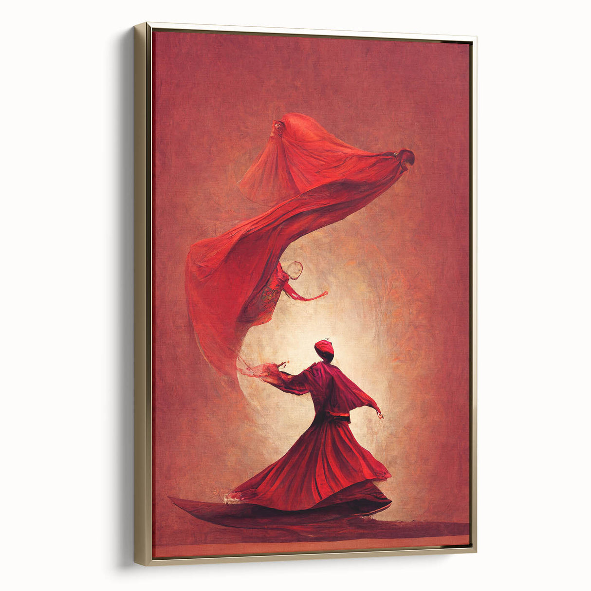 This fiery red abstract art piece captures the passionate movement of figures in a mesmerizing dance. The flowing forms and bold shades of red convey energy, power, and elegance, creating a sense of warmth and intensity. Each figure, beautifully rendered in flowing robes, appears to float in rhythmic harmony, evoking themes of spirituality and inner strength. This artwork is perfect for spaces that seek to make a bold, artistic statement.