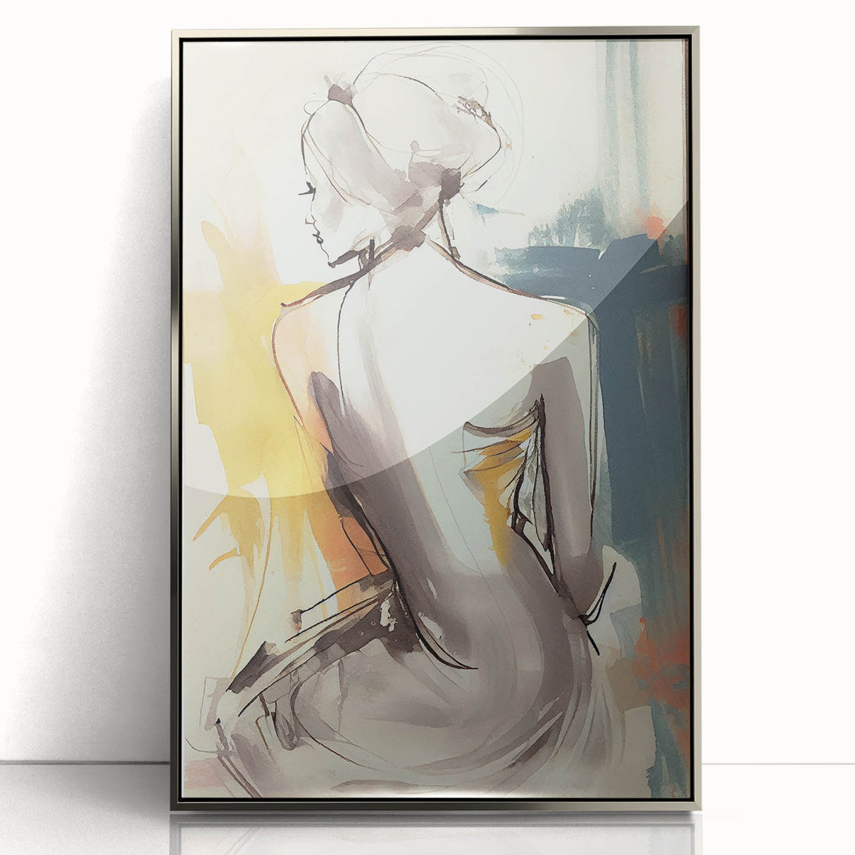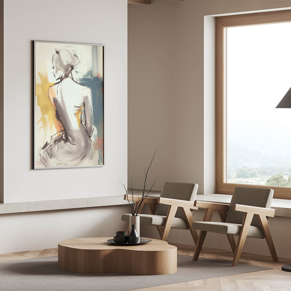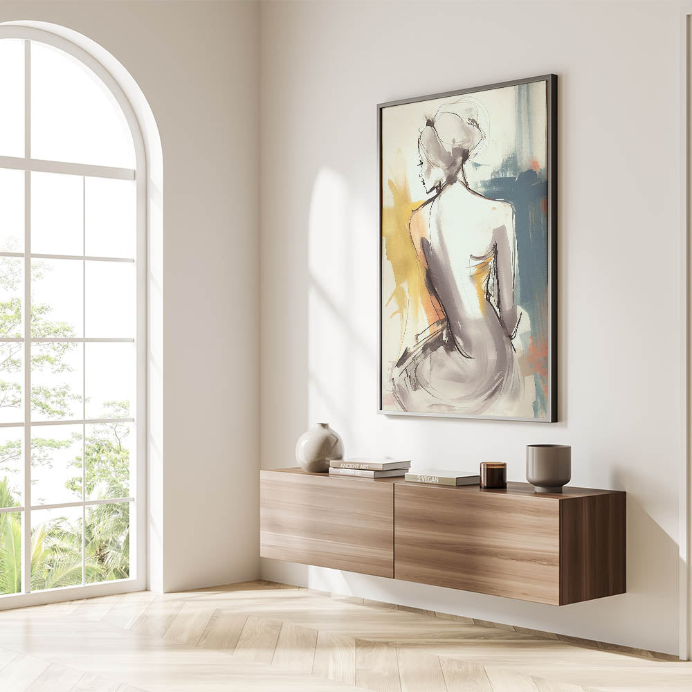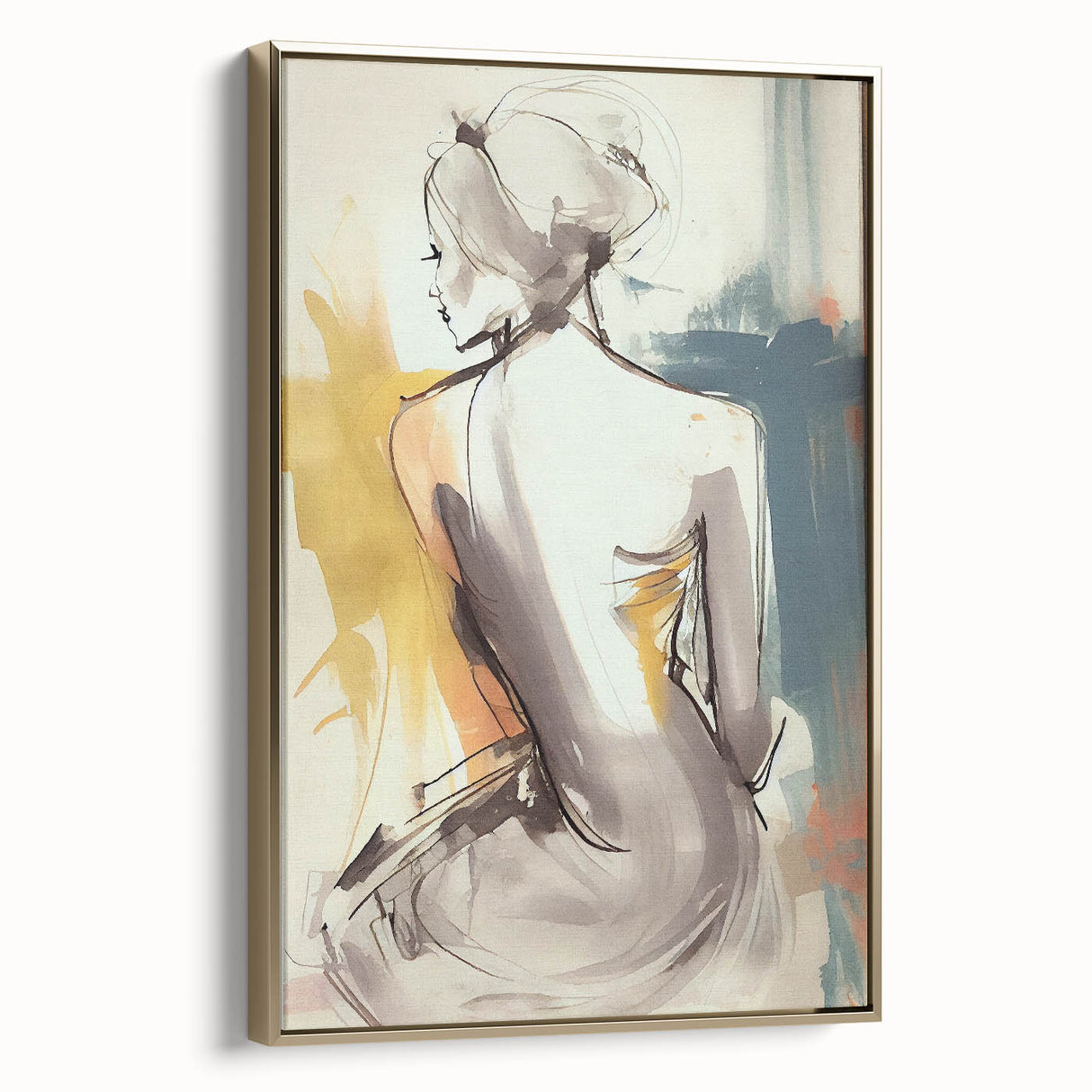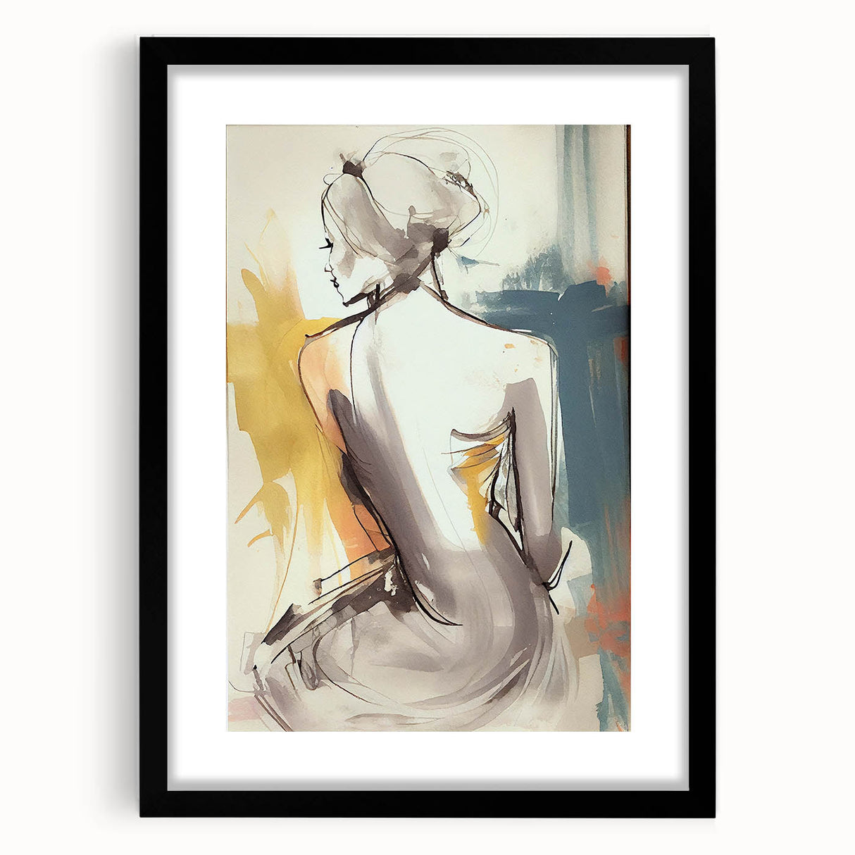 This elegant figurative artwork captures the grace and poise of a woman in a minimalist sketch style. Rendered in soft neutral tones with touches of blue and golden yellow, the piece exudes a sense of calm and introspection. The fluid lines and gentle brushstrokes create a serene composition that celebrates simplicity and the beauty of the human form. Ideal for those who appreciate understated elegance, this artwork is a refined addition to any space.