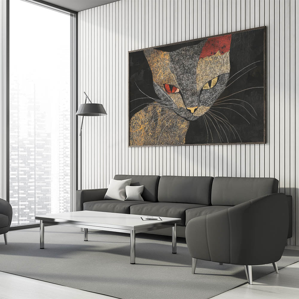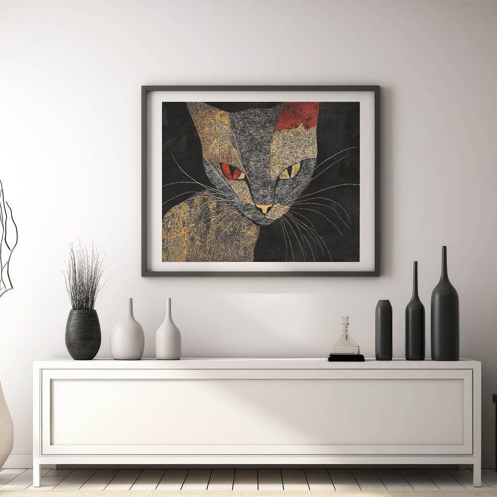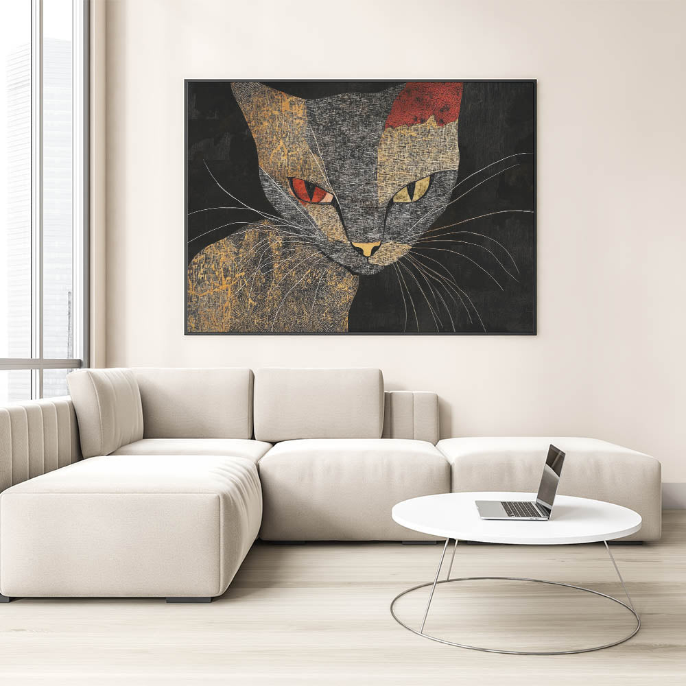 This colorful abstract floral design is a captivating blend of elegance and edge. Whether displayed alone or as part of an abstract botanical art collection, this feline-inspired masterpiece adds intrigue and sophistication to any setting.