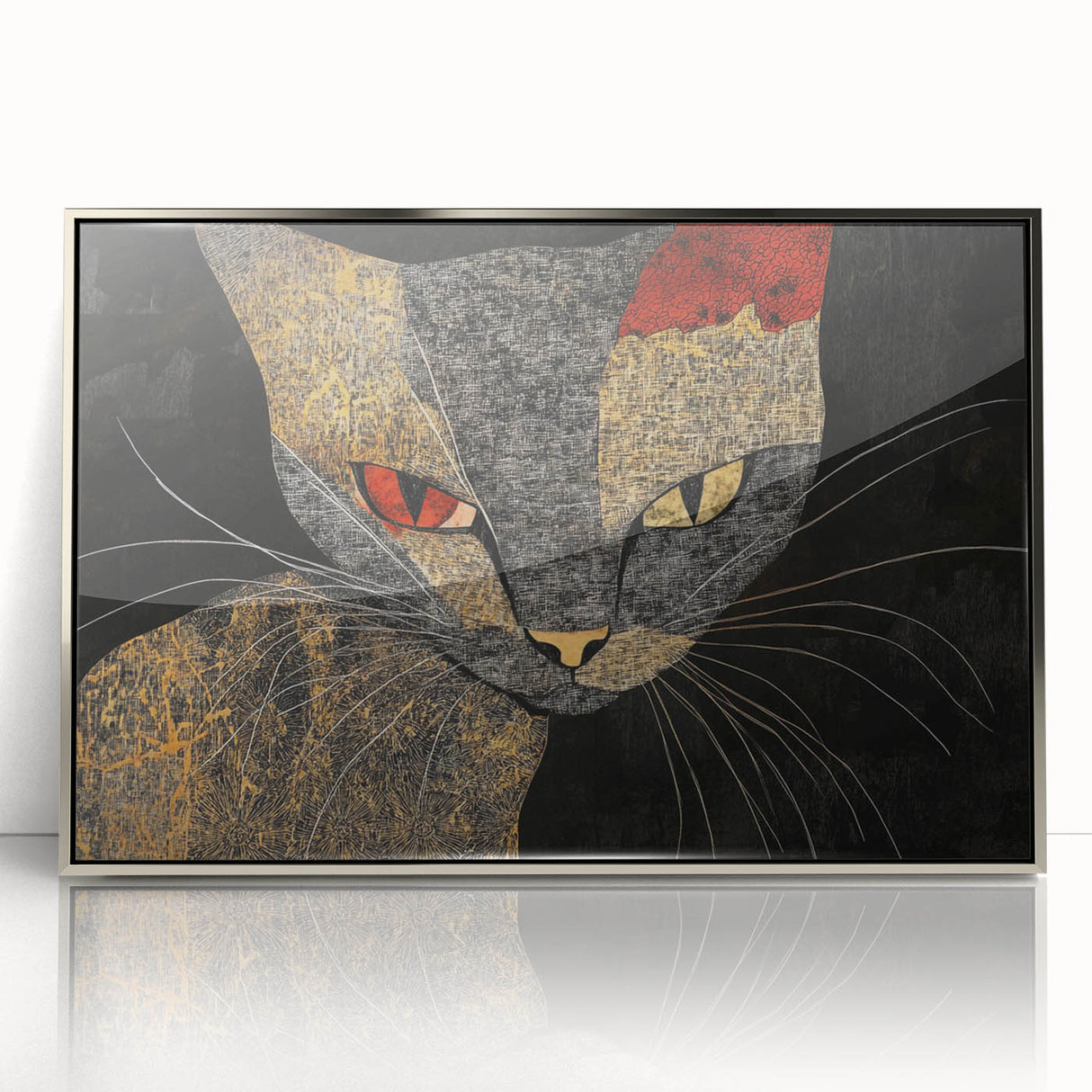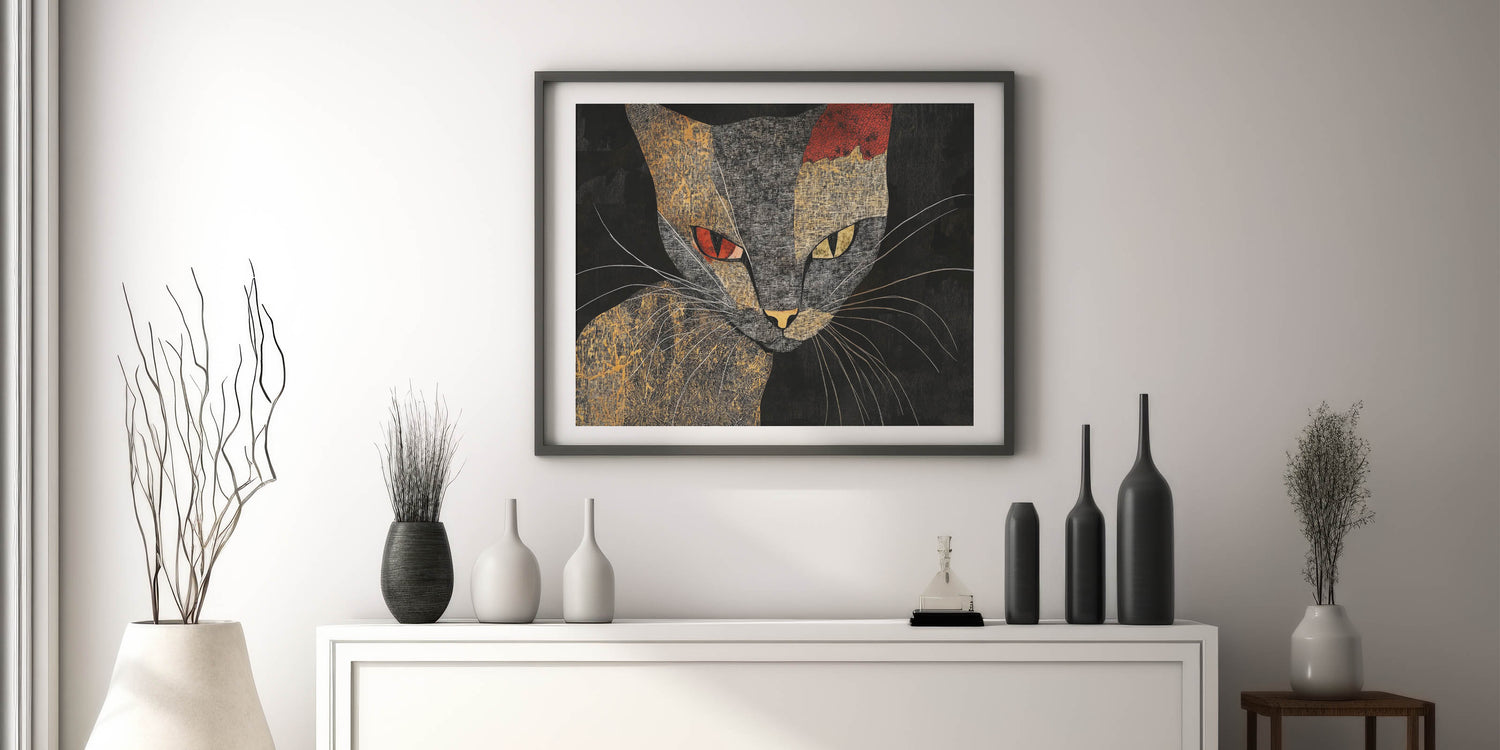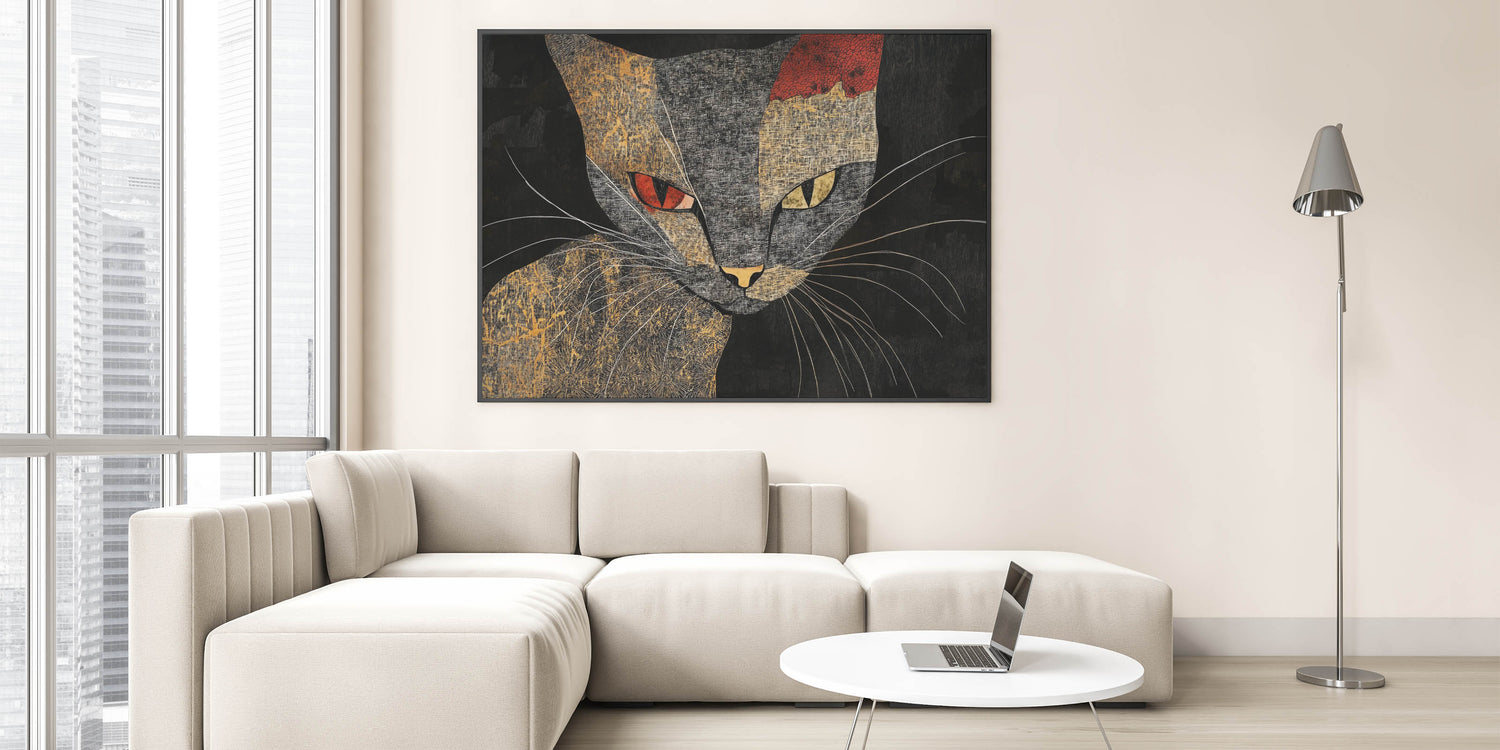 This colorful abstract floral design is a captivating blend of elegance and edge. Whether displayed alone or as part of an abstract botanical art collection, this feline-inspired masterpiece adds intrigue and sophistication to any setting.