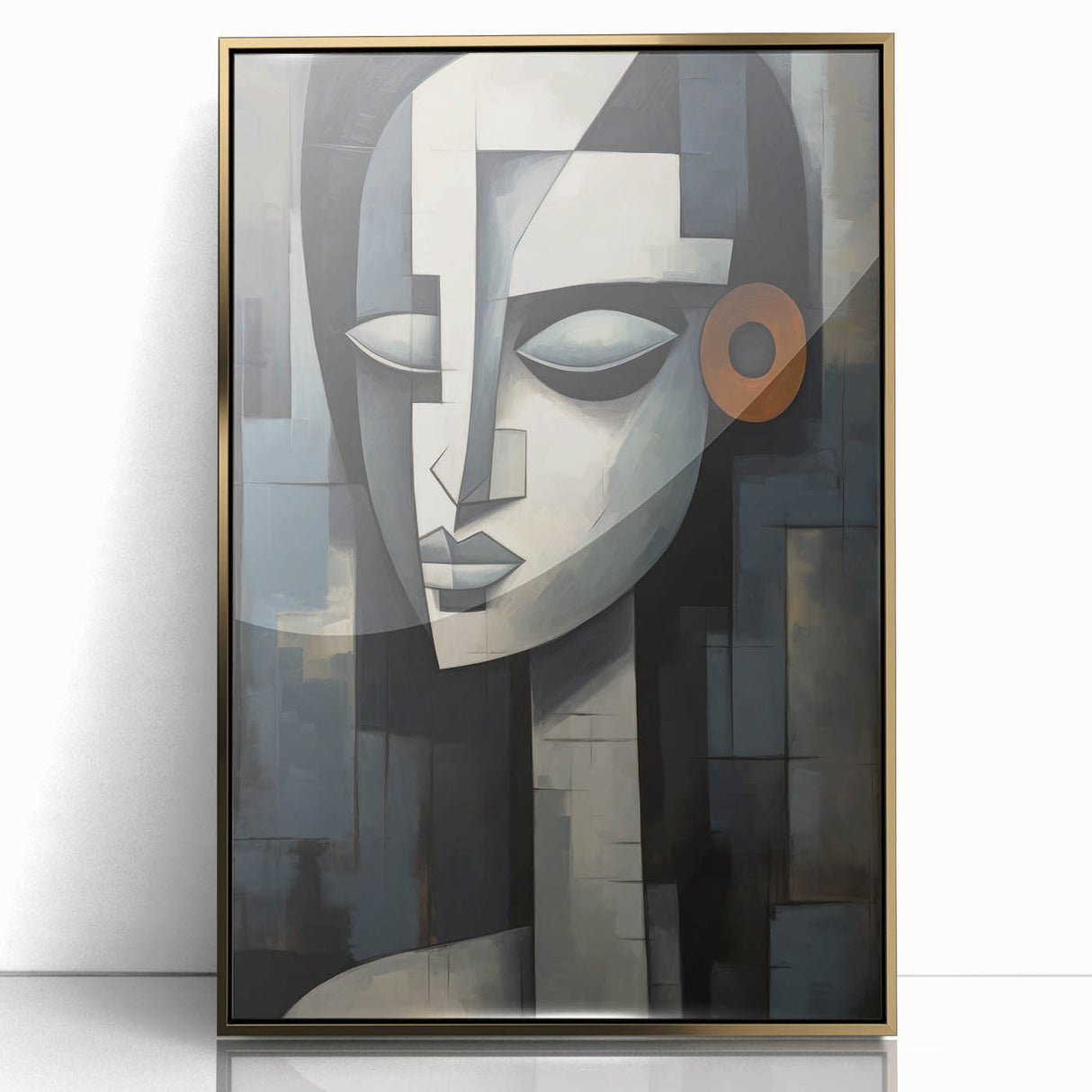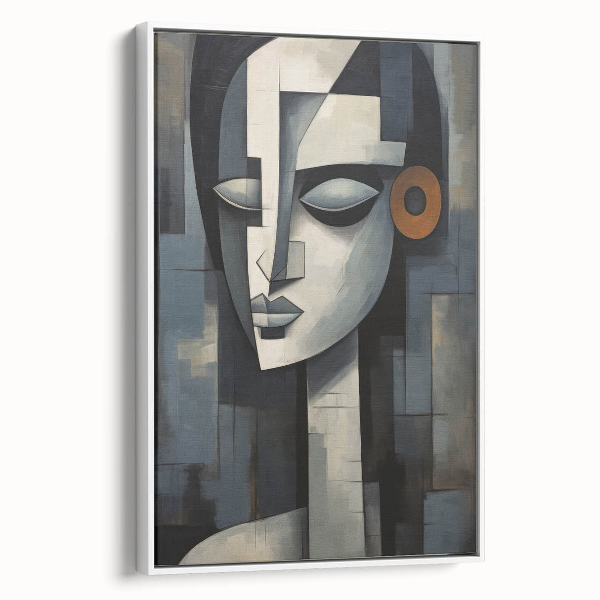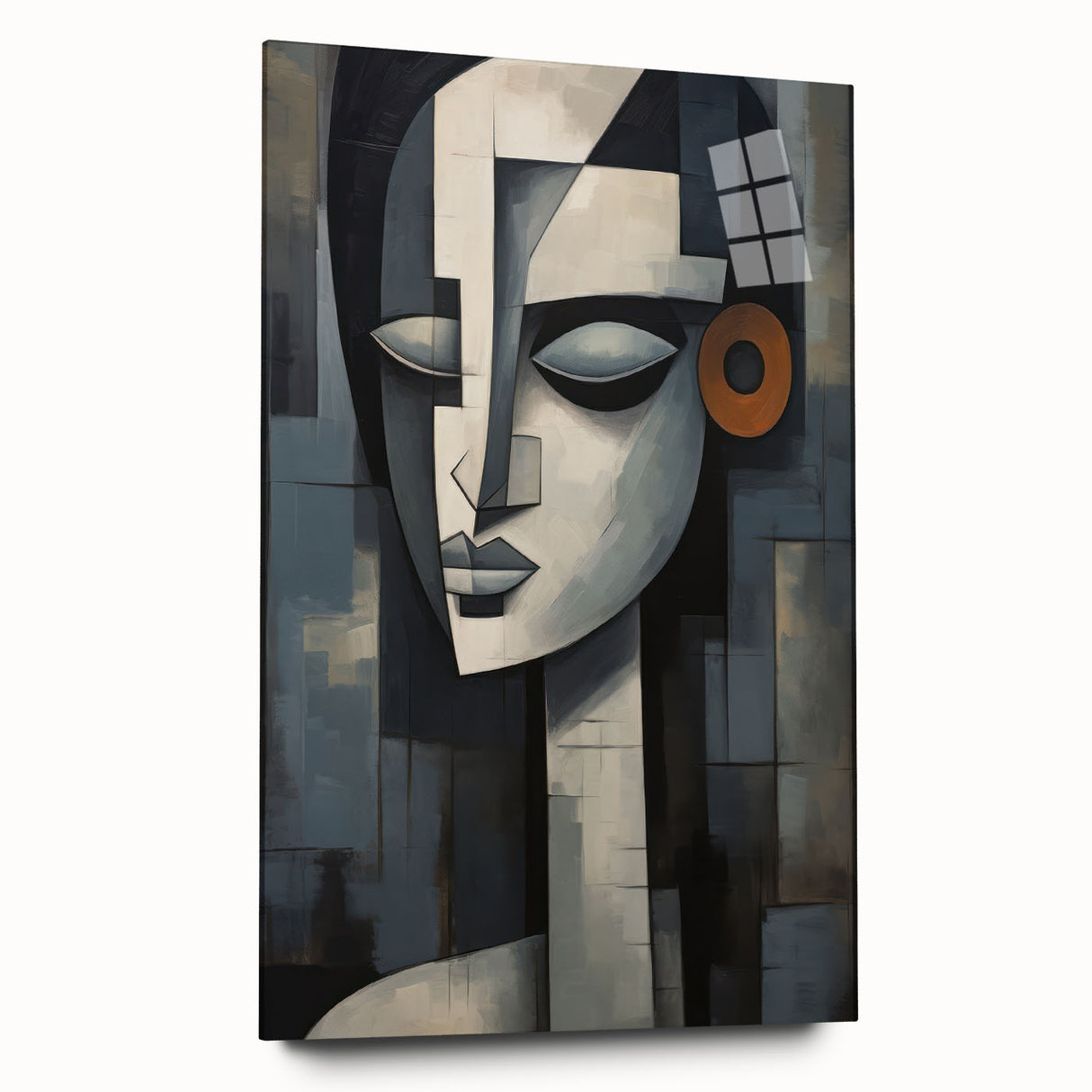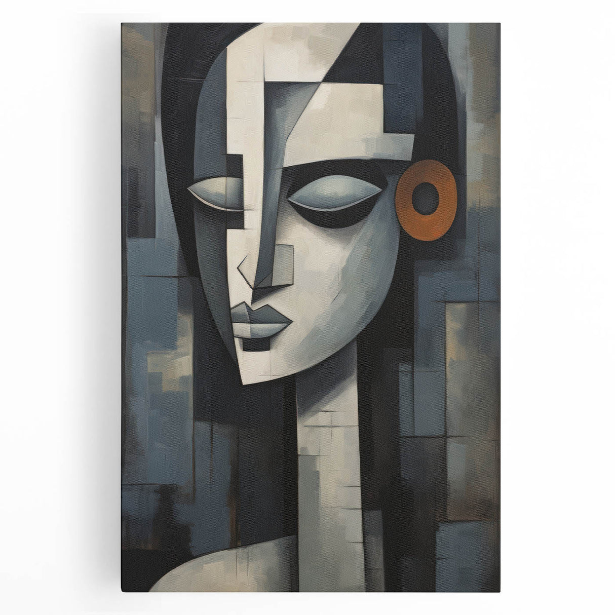 Introducing our Modern Geometric Abstract Face wall art, a striking piece that seamlessly blends contemporary design with geometric abstraction. This artwork features a serene face composed of intricate shapes and a muted color palette, highlighted by a bold orange accent, making it a sophisticated addition to any modern interior.