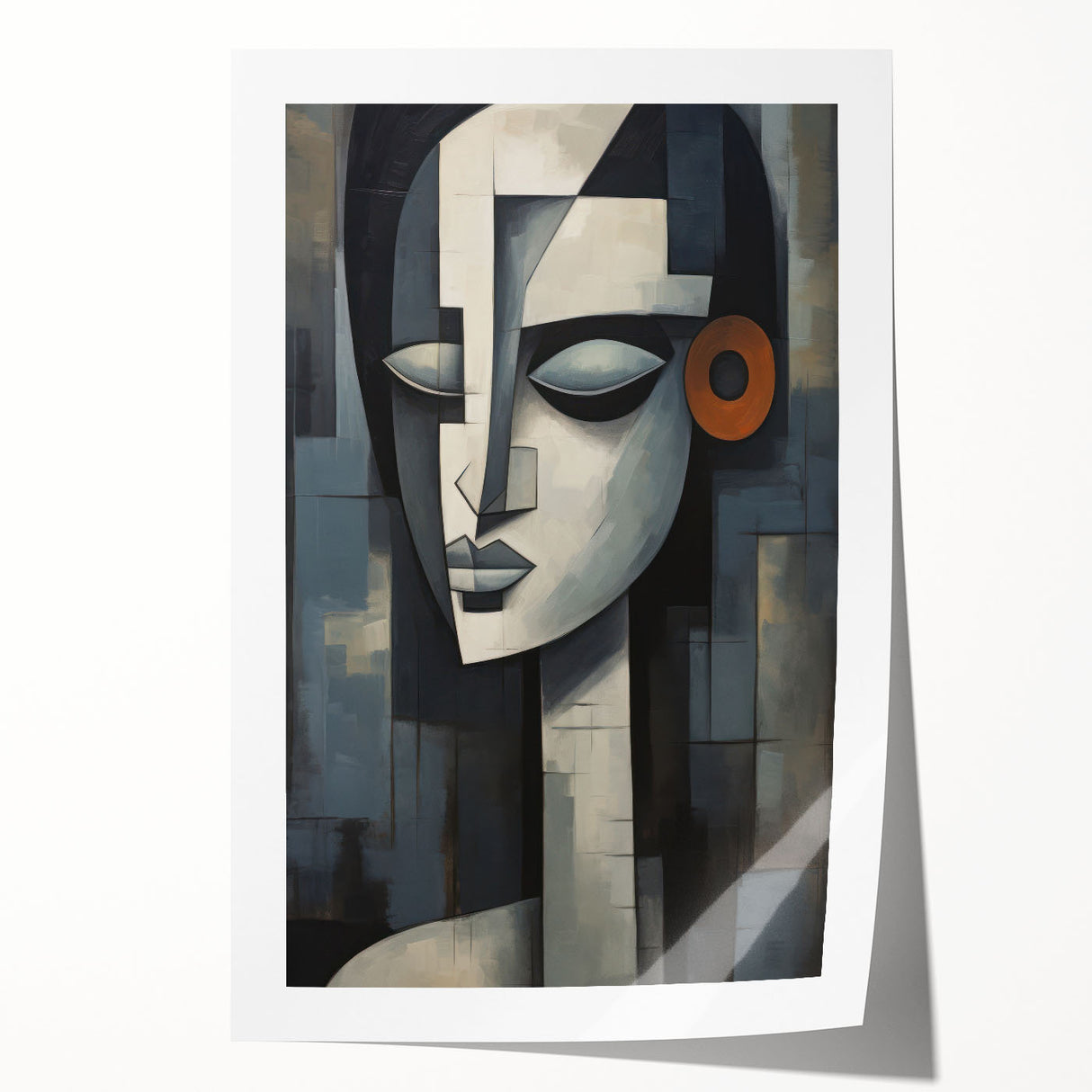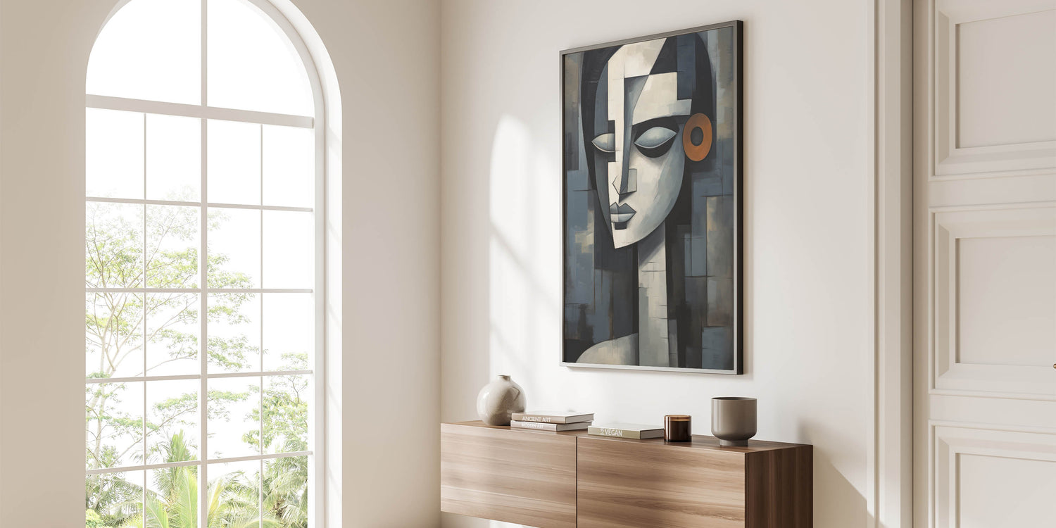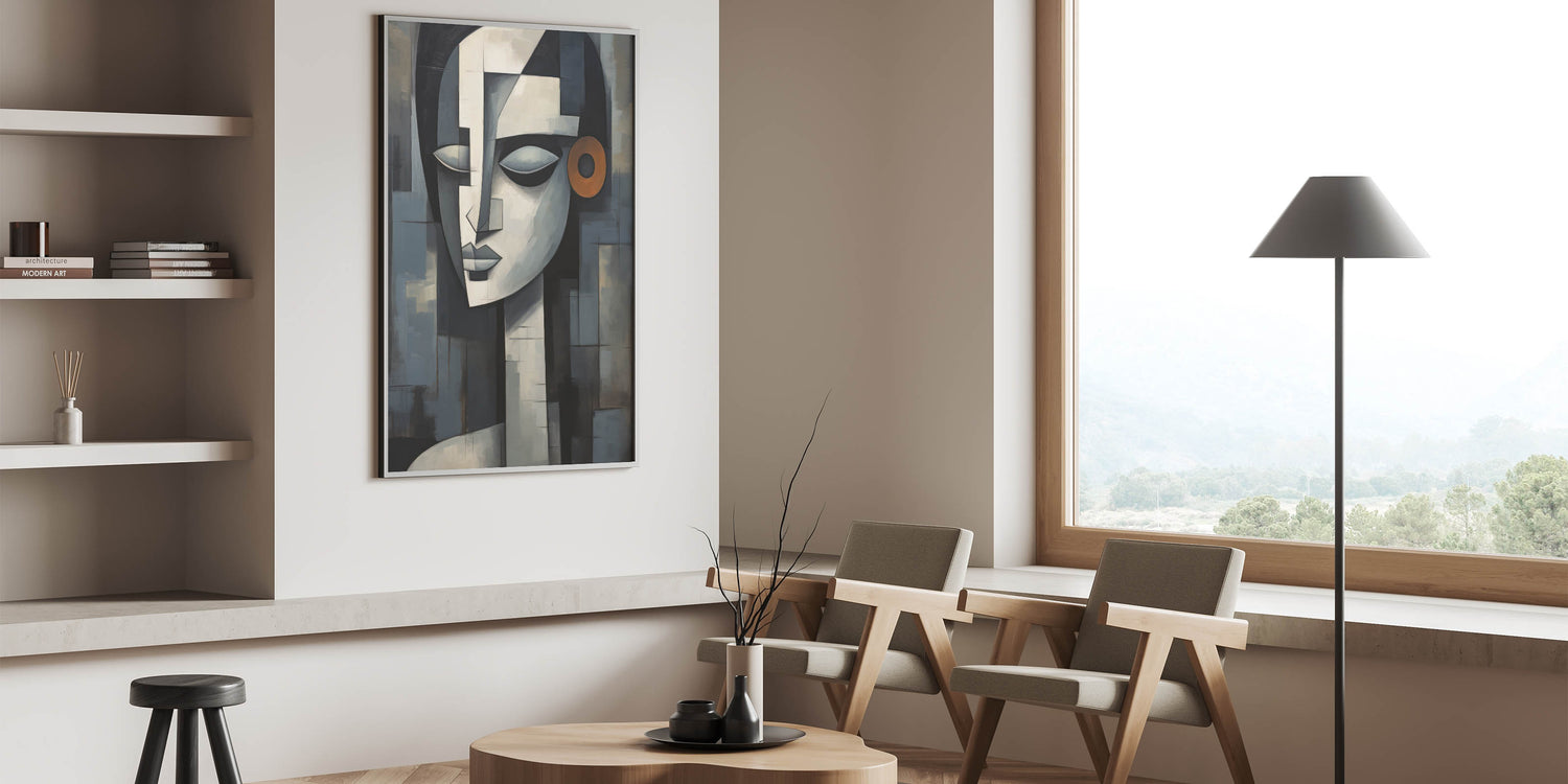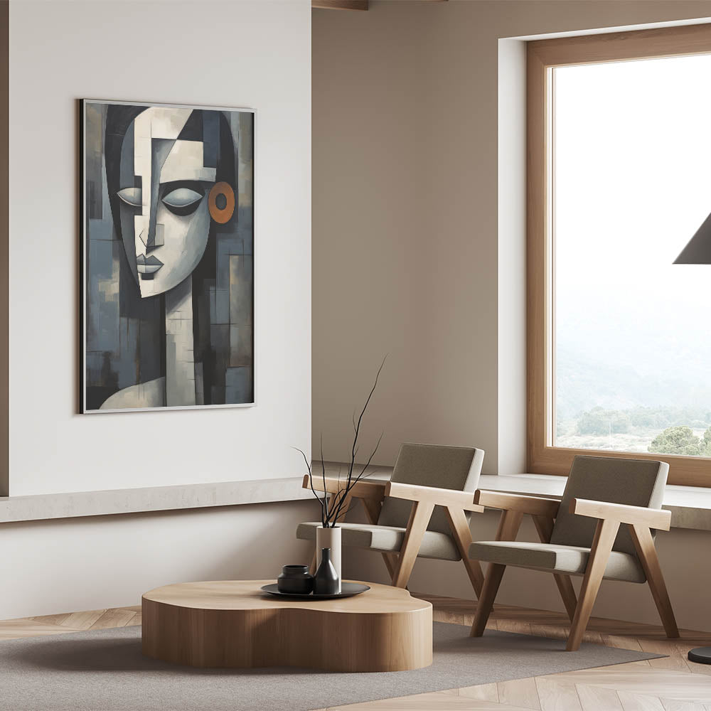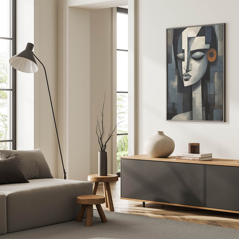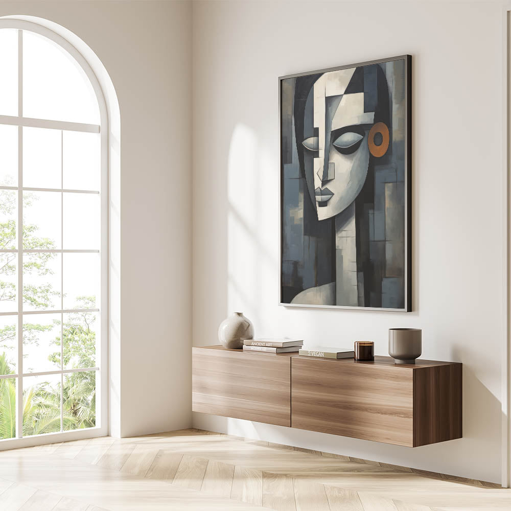 This contemporary figurative wall art is more than just decoration; it’s a piece that adds depth and character to your interior. The geometric composition and serene expression make it a perfect addition to any modern or eclectic decor. Choose a framed print or a rolled canvas to enhance your space with this captivating artwork.