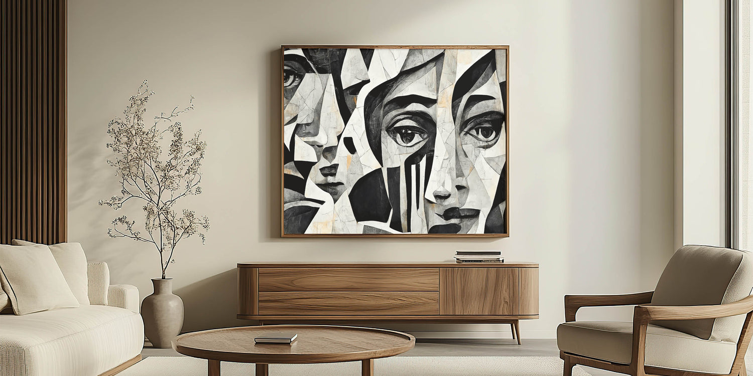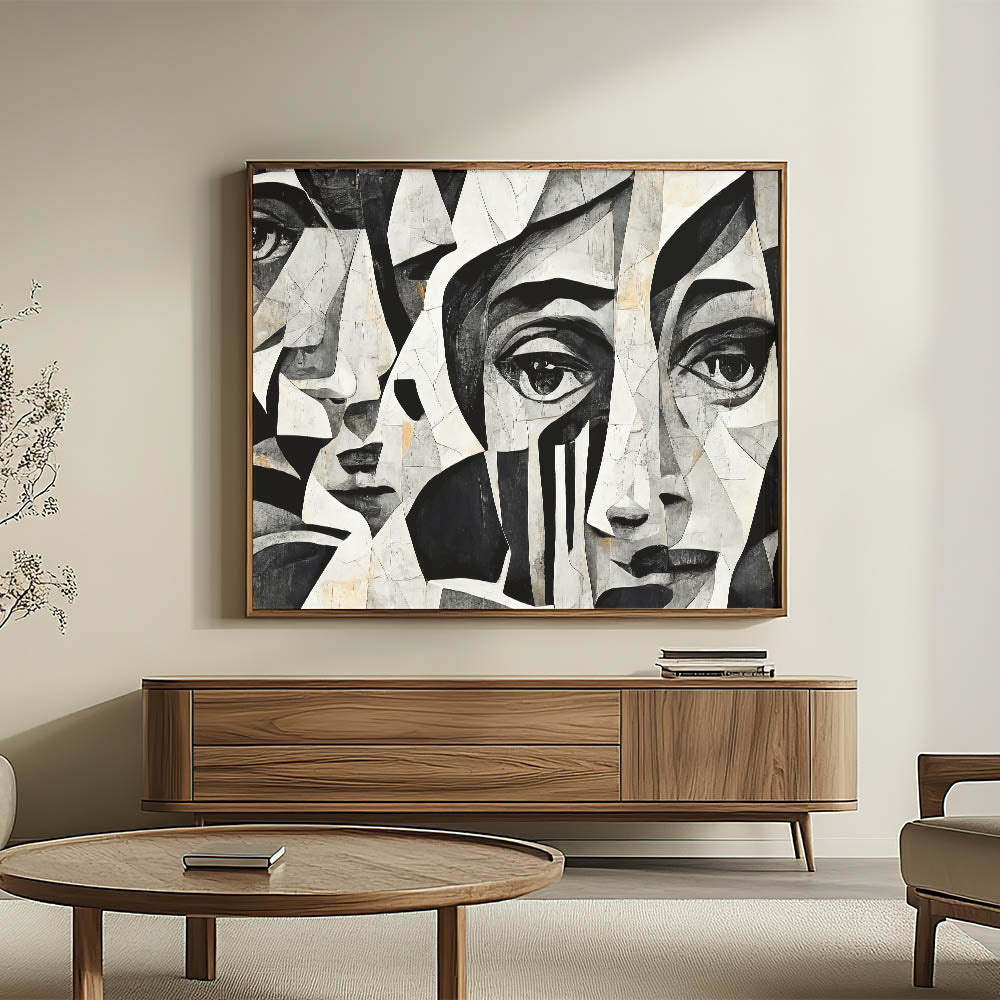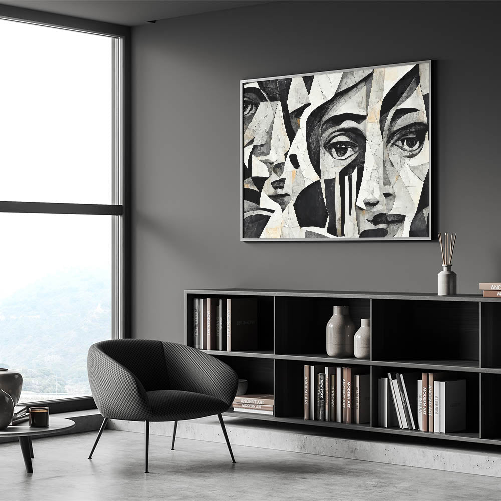 Introduce a sophisticated and striking piece to your decor with our "Modern Monochrome Figurative Abstract Wall Art - Faces in Black and White." This captivating artwork features abstract human faces rendered in a dramatic black and white palette, creating a powerful visual impact. The intricate details and contrasts bring depth and emotion to any space, making it a perfect addition to contemporary and modern interiors.