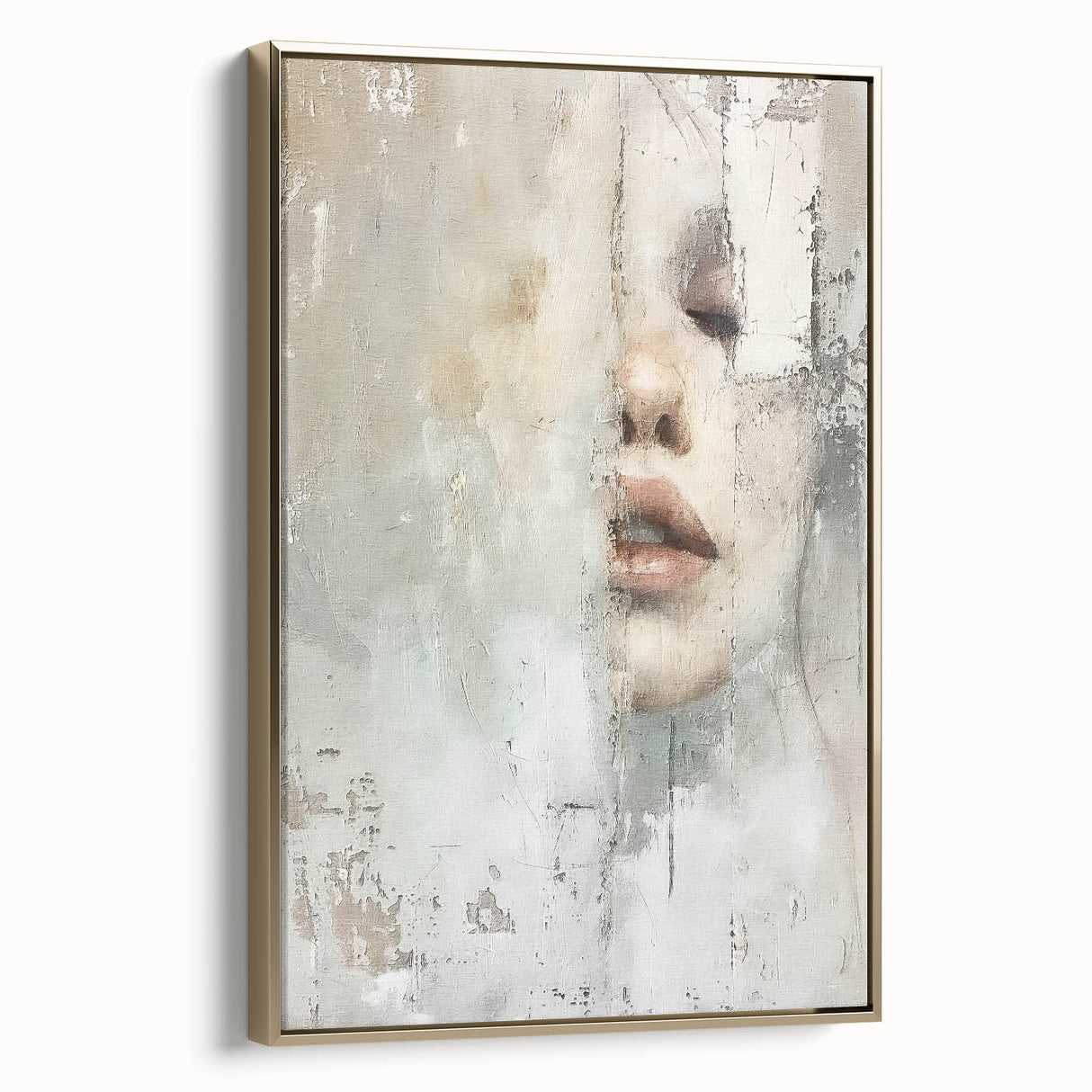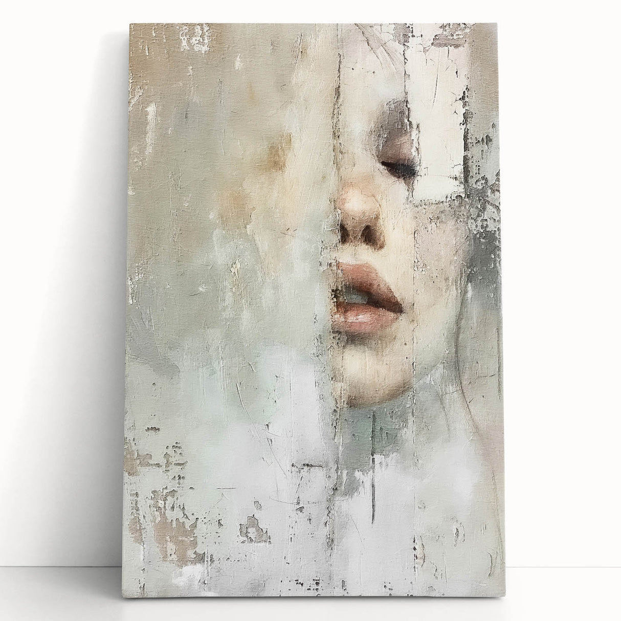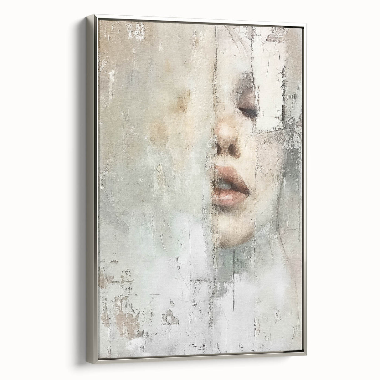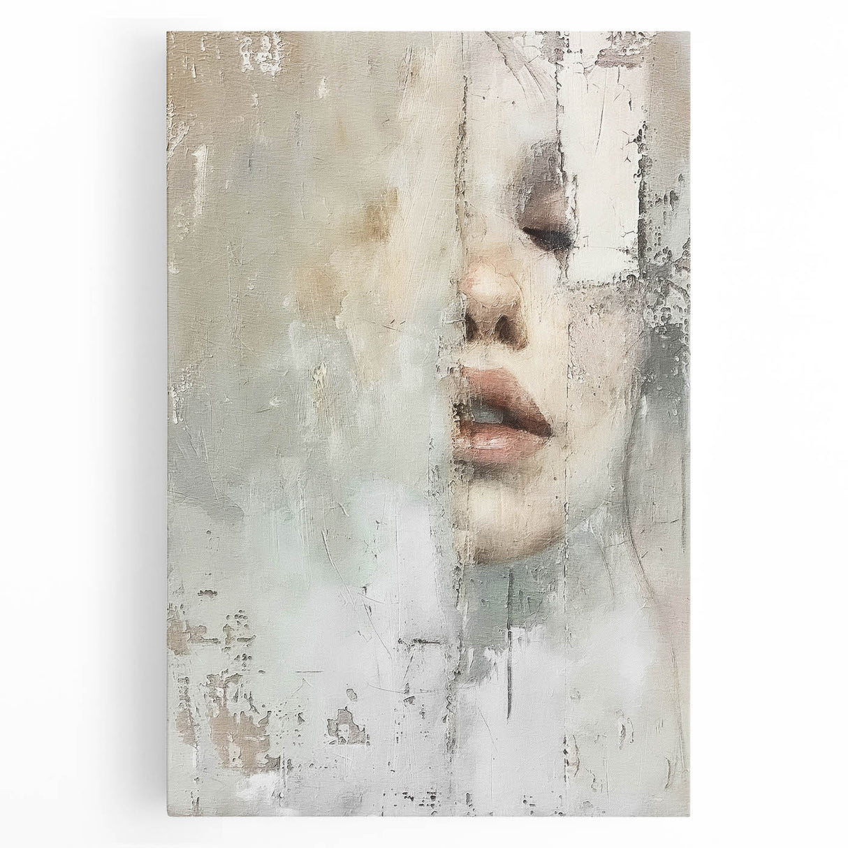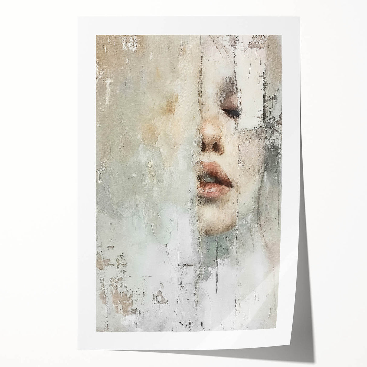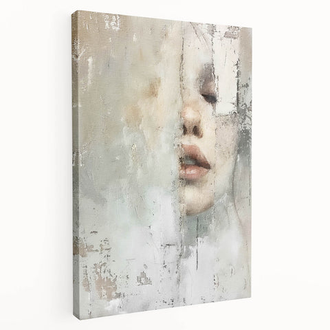 Add a sense of mystery and beauty to your space with this soft, abstract figurative wall art. This artwork, part of our Abstracts collection, features a serene face partially obscured by textured brushstrokes, blending delicate tones of beige, cream, and light green. Its subtle colors and ethereal design make it ideal for those who appreciate minimalist, contemporary decor.