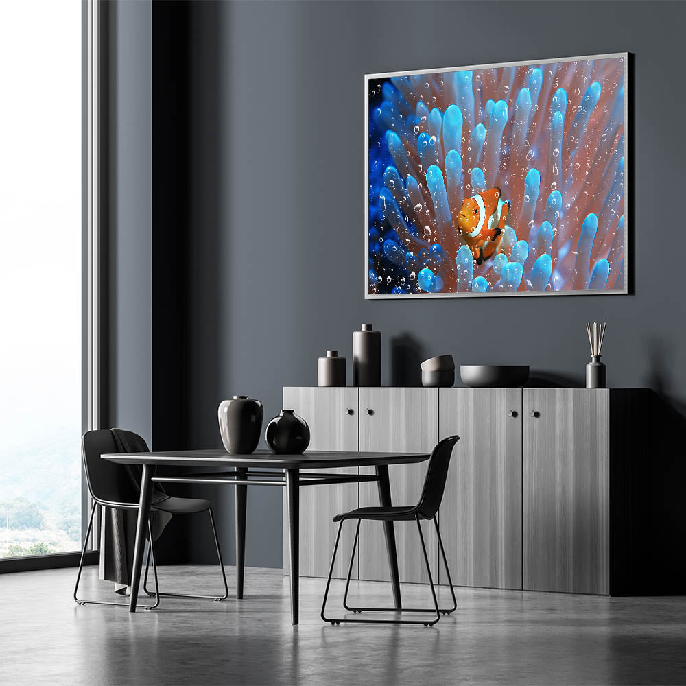 • Captivating Colors: The bright orange of the clownfish contrasts beautifully against the blue hues of the anemone.