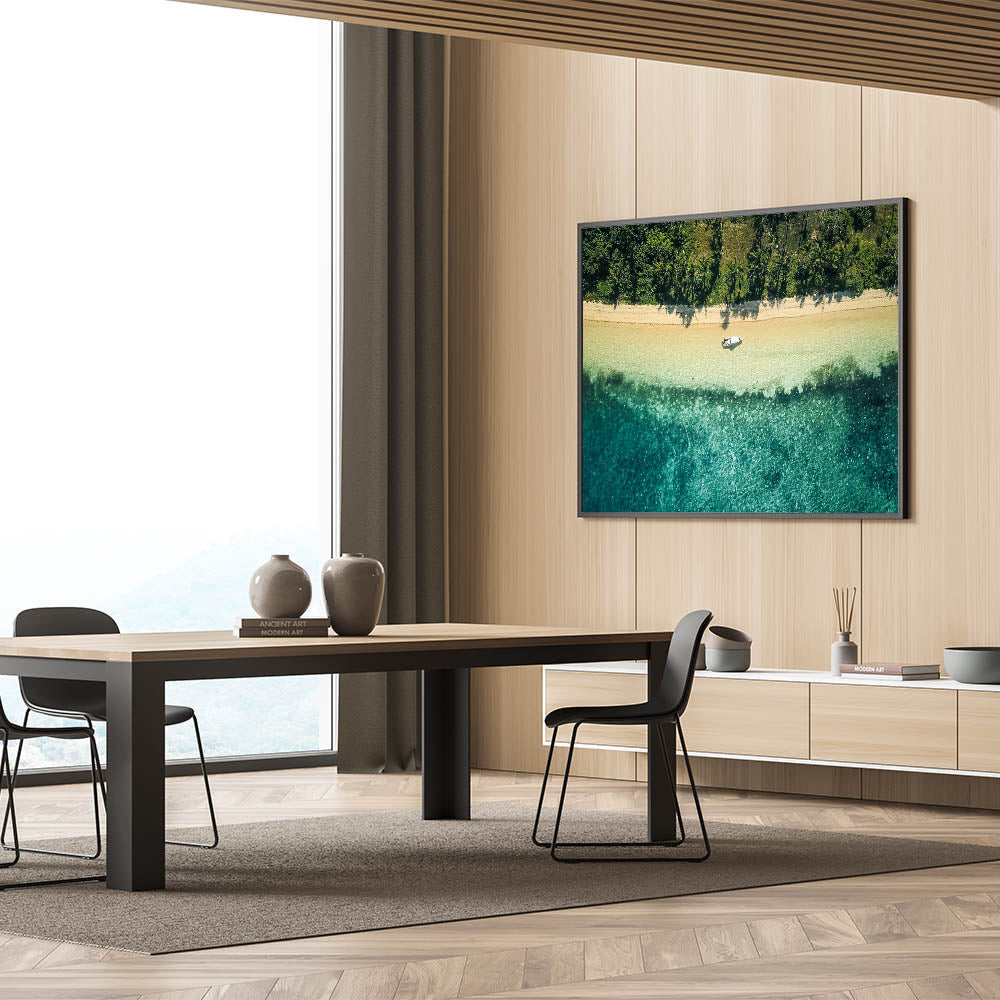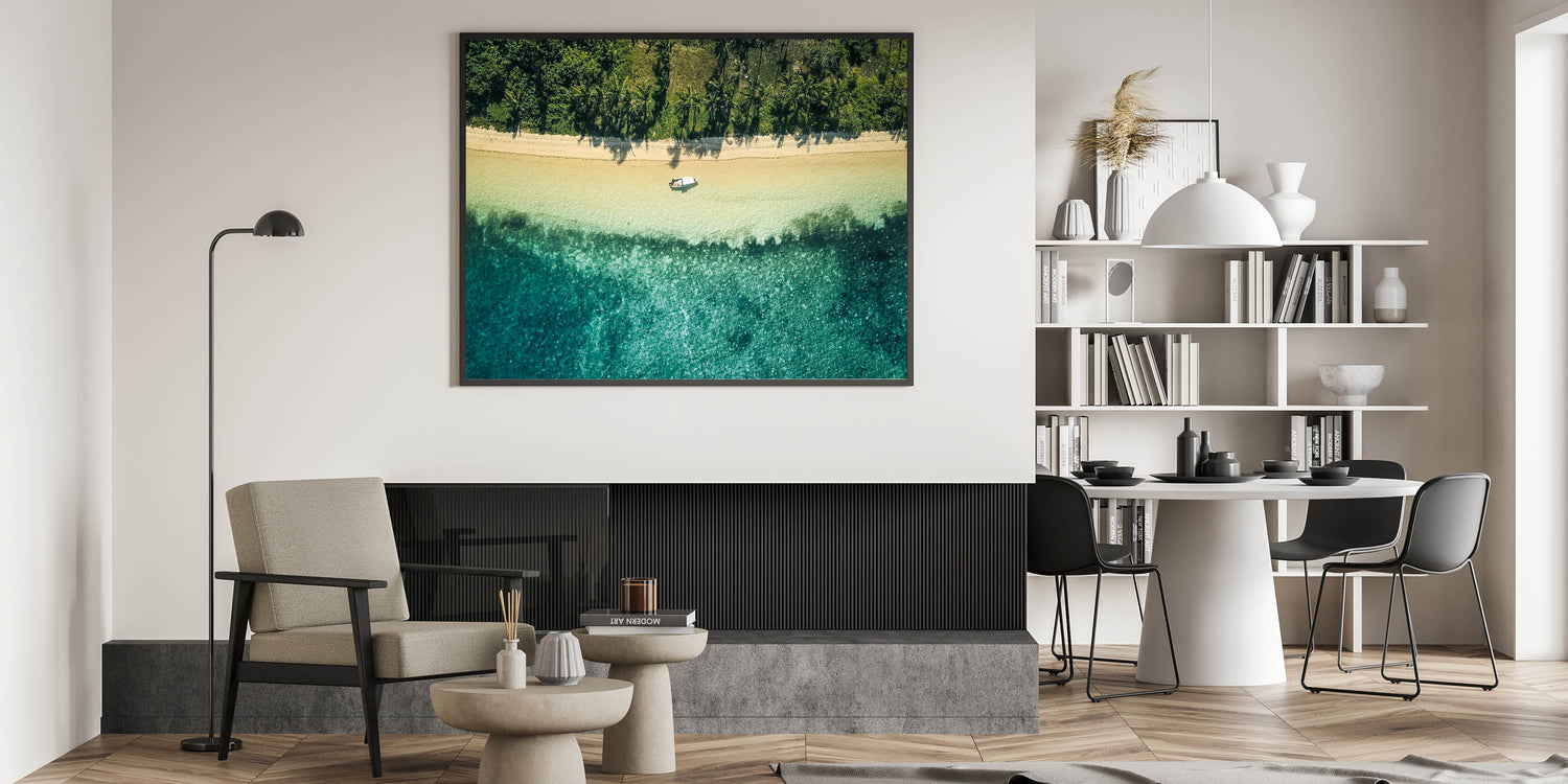 Enhance your living space with the tranquil vibes of our "Secluded Beach Aerial Art" from the Fiji Scenery by Region collection. This striking aerial view captures a solitary boat moored in the shallow waters of a secluded Fiji beach, surrounded by lush tropical greenery.