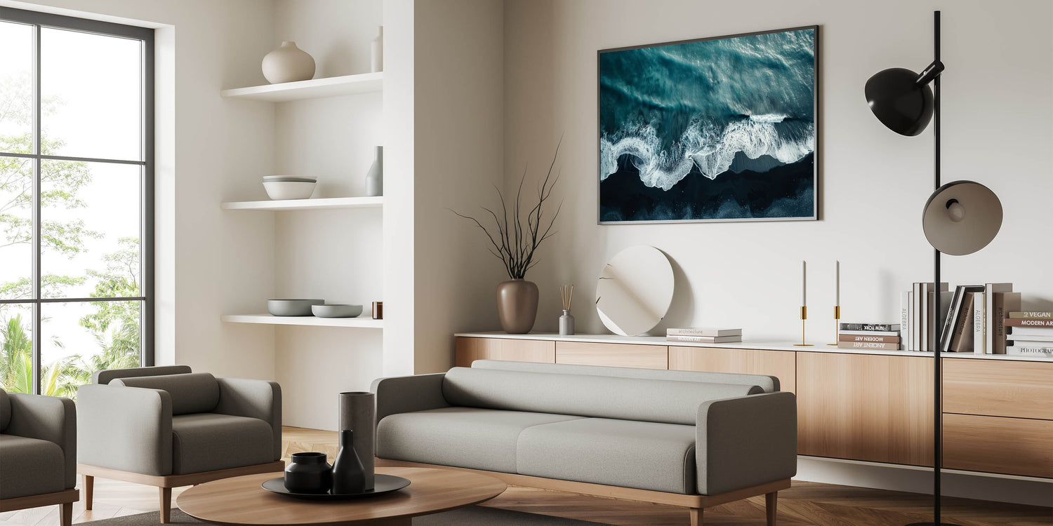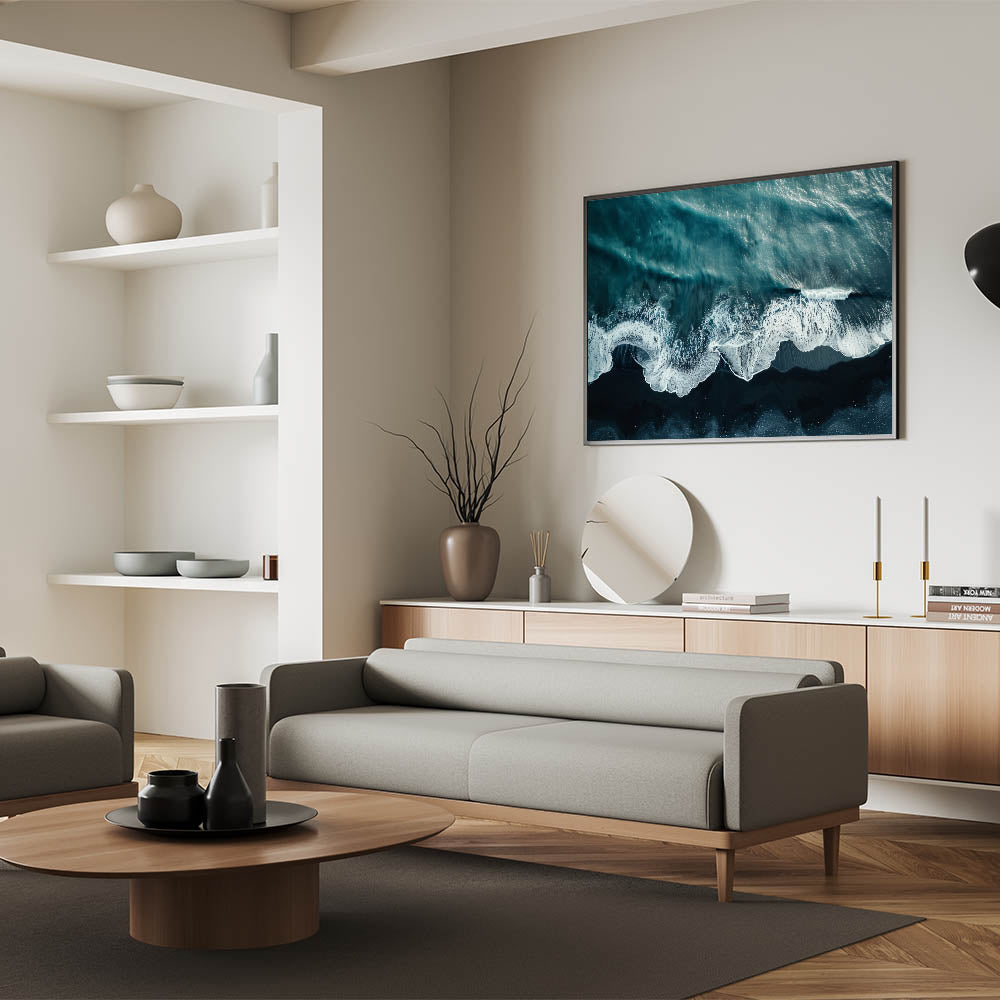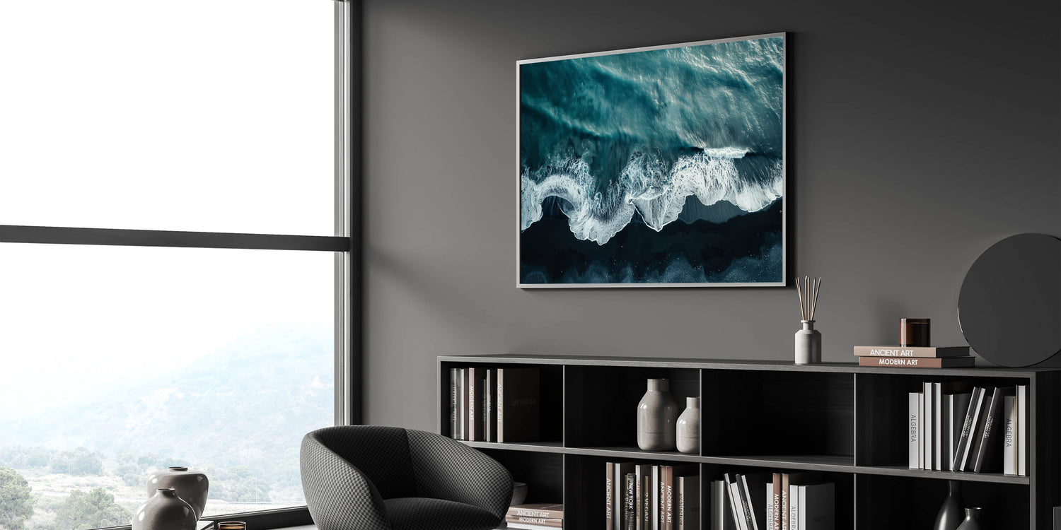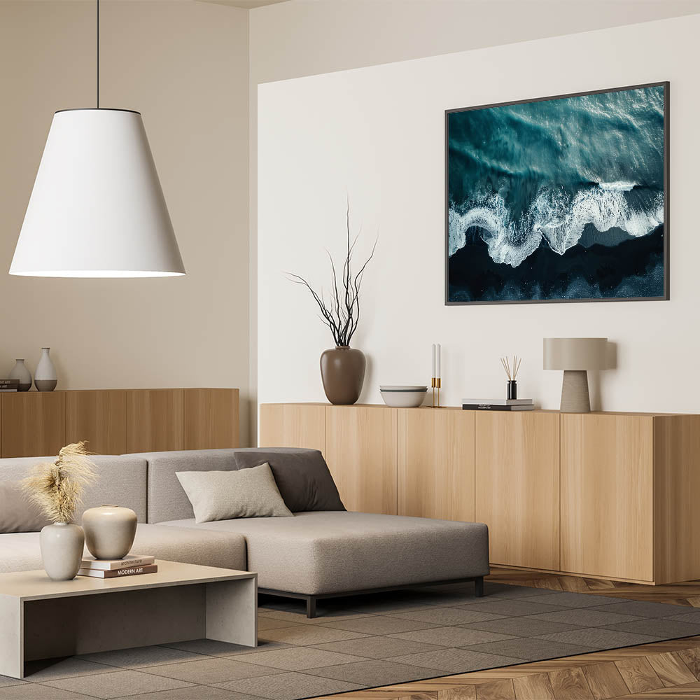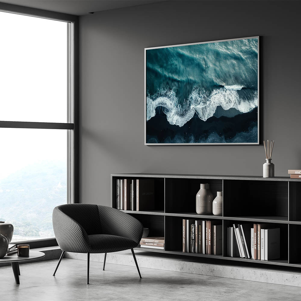 • Dynamic Visuals: The contrasting dark sands and foamy waves make this piece a striking addition to any decor.