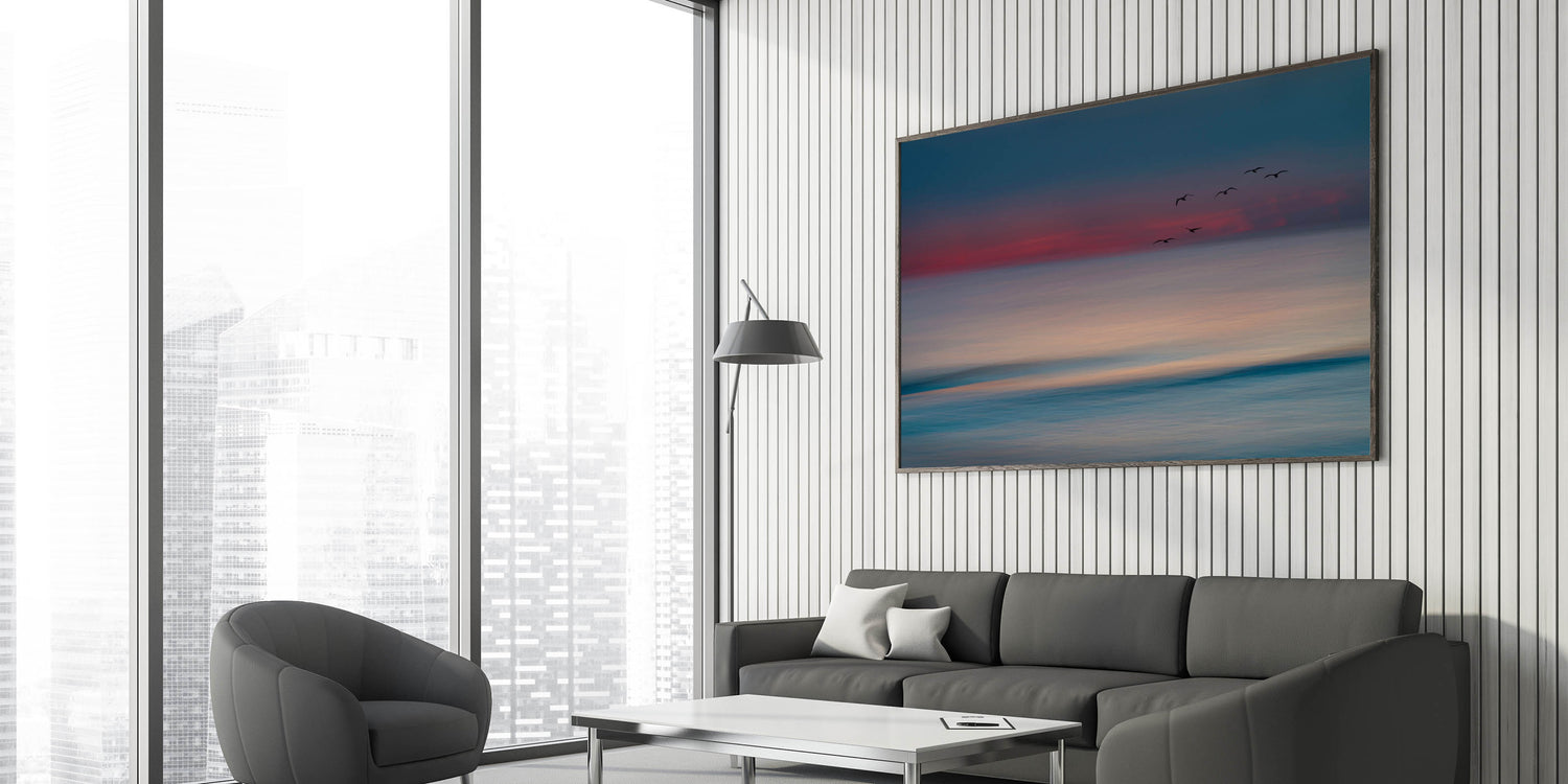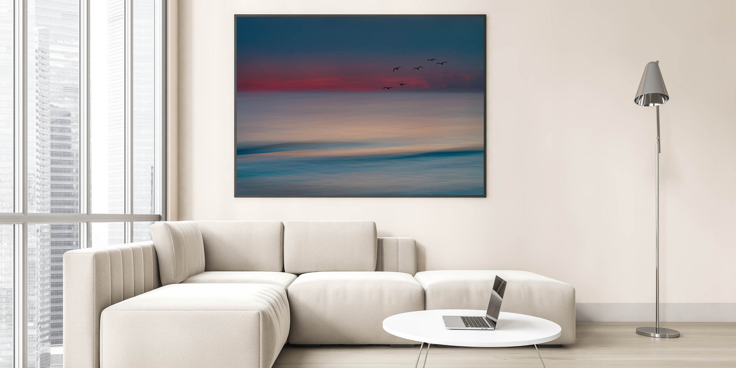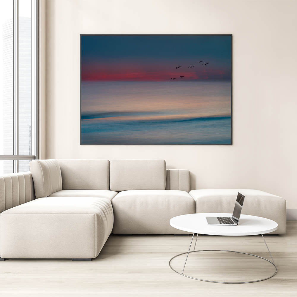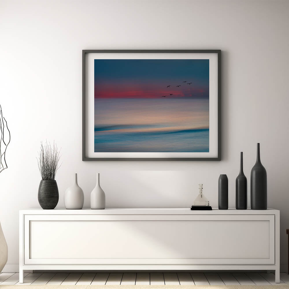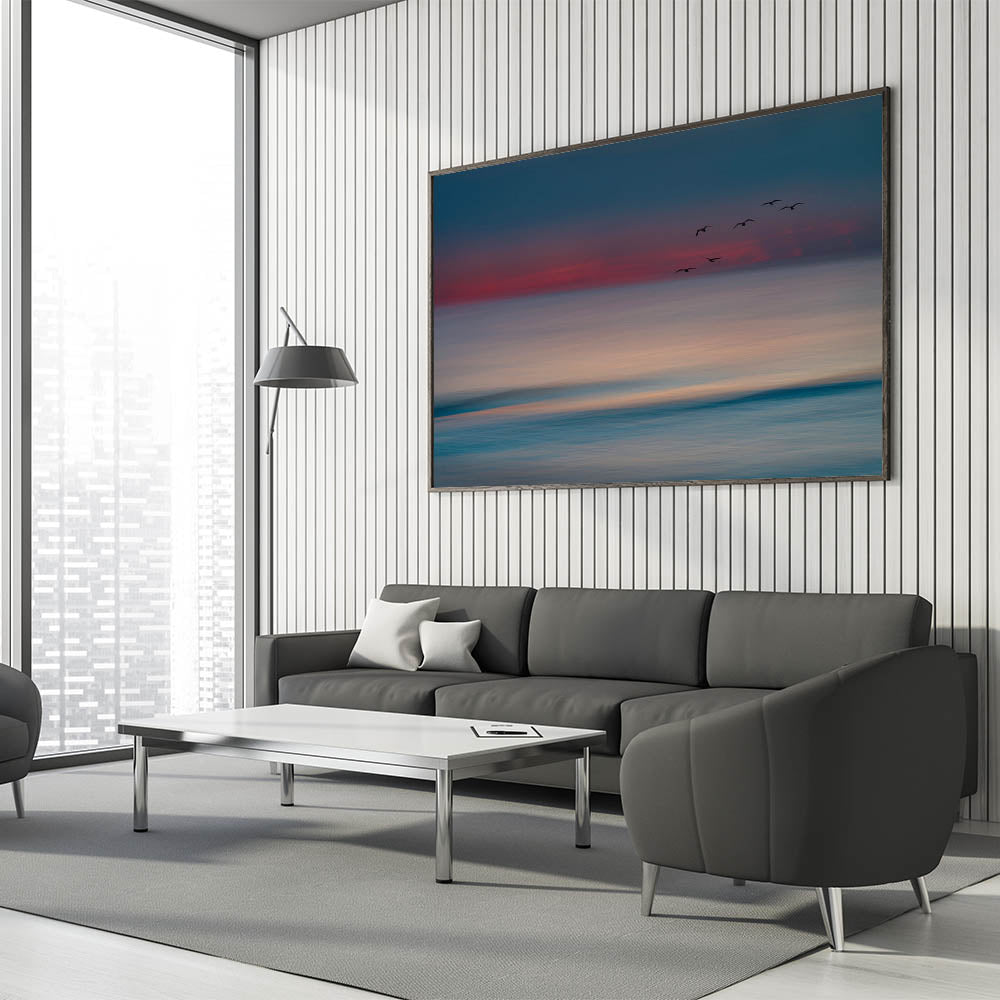Bring the calm and beauty of the ocean into your home with this Abstract Seascape with Birds Wall Art. This stunning piece captures the gentle hues of the sea and sky as they blend together at sunset, with silhouettes of birds gracefully flying across the horizon. The soft, blurred lines create a peaceful, dreamlike quality, making it the perfect addition to any space that seeks tranquility and elegance.