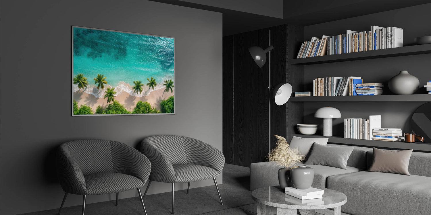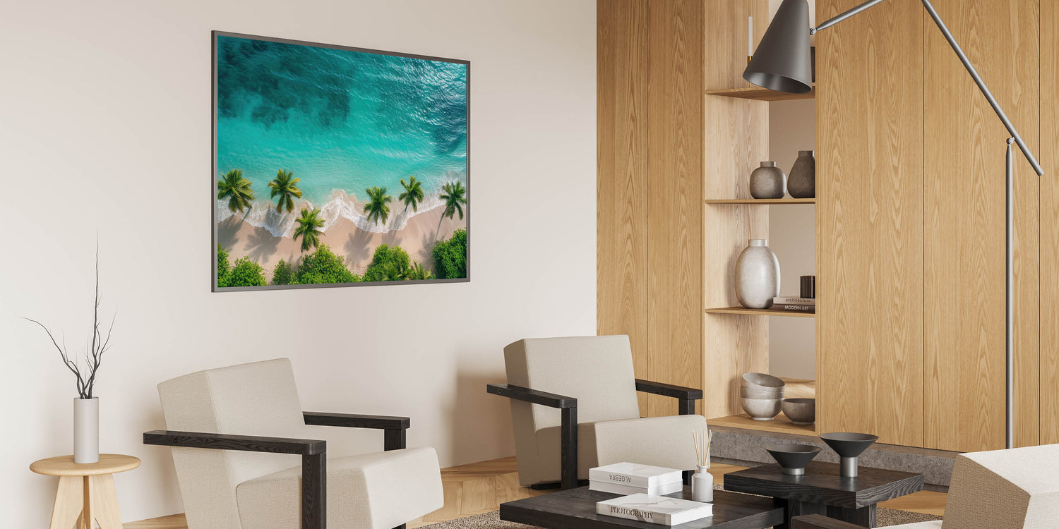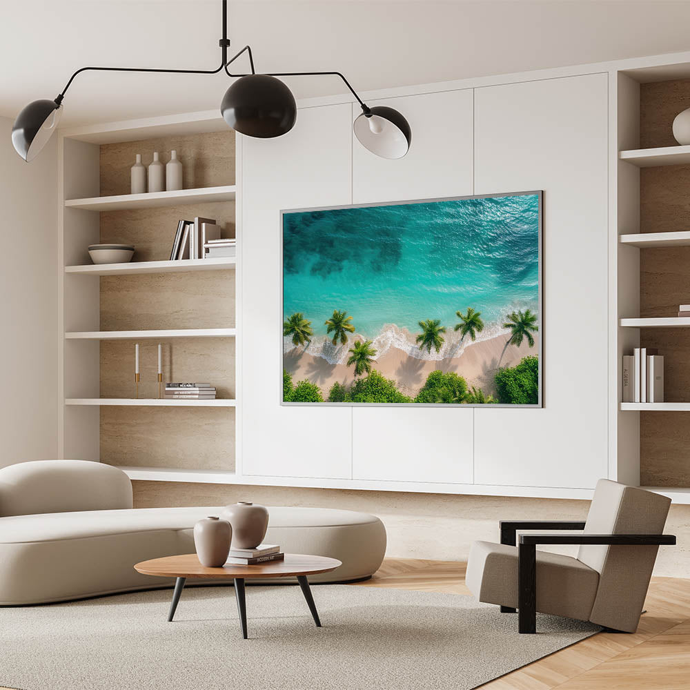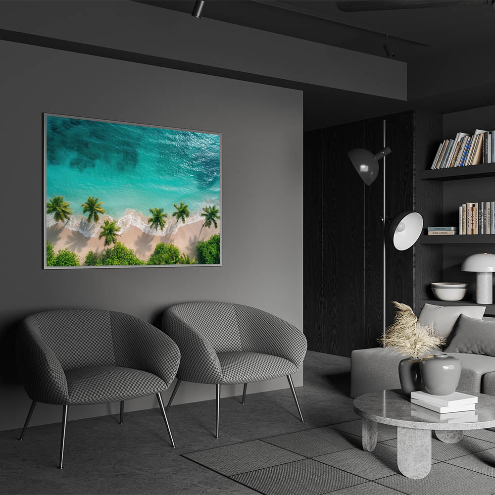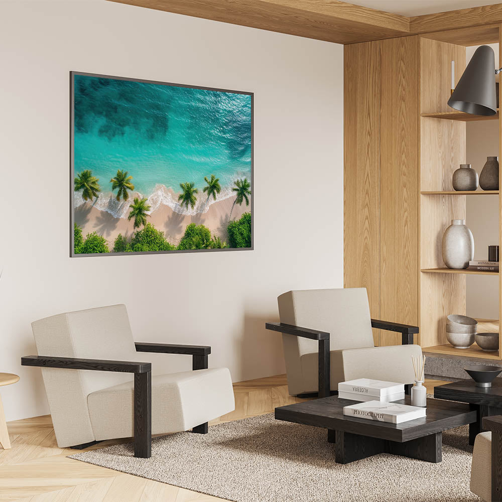 Experience the serenity of a tropical paradise with this stunning aerial view of a pristine beach, where lush palm trees meet the crystal-clear turquoise waters. This breathtaking piece of art captures the tranquil beauty of the coastline from above, making it an ideal addition to any room that needs a touch of nature’s elegance. Whether you’re looking to enhance your living room, bedroom, or office, this artwork brings the calming influence of the ocean right into your space.