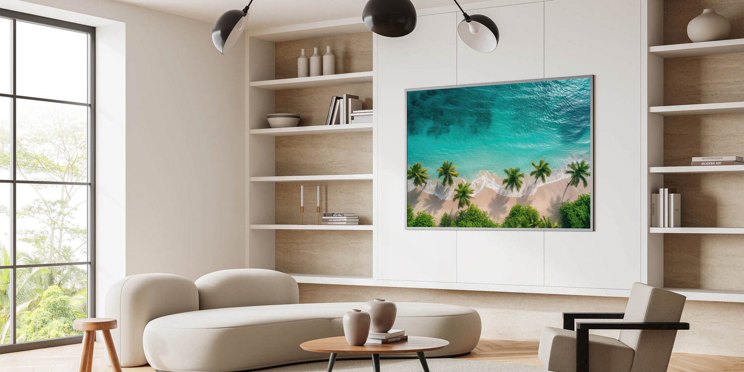 - Vibrant and Natural Colors: The rich greens of the palm trees and the vivid blues of the ocean create a soothing ambiance, perfect for coastal and beach-themed decor.
